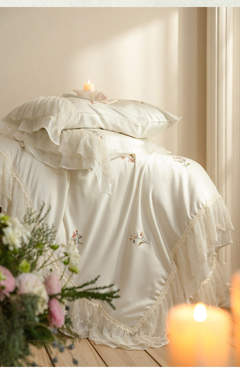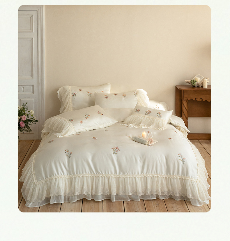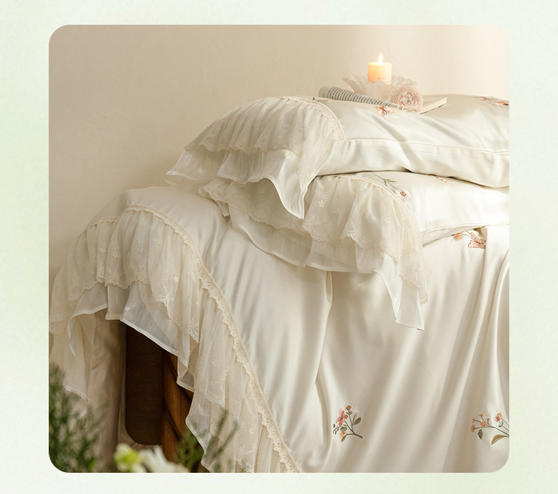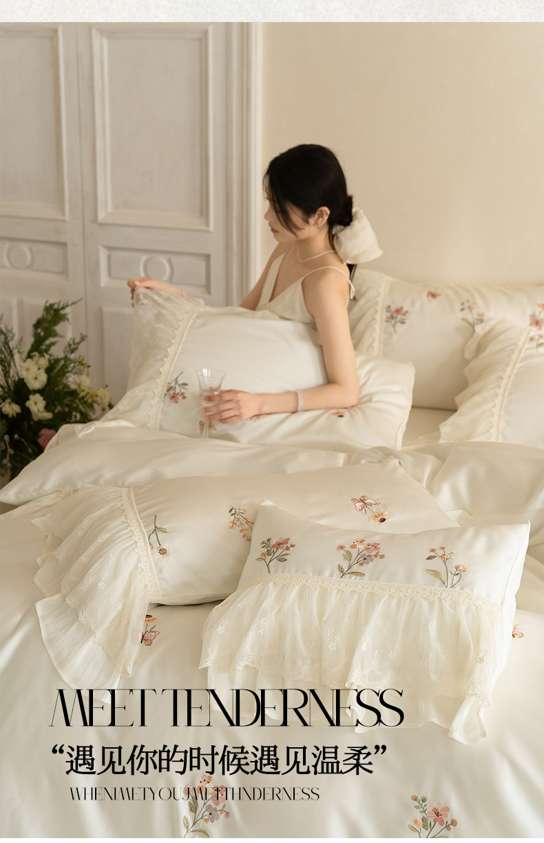 (总)满座家居 2026新款100s全棉长绒棉四件套法式纯棉花边款四件套-白茶清欢(会员➖20 控价369)