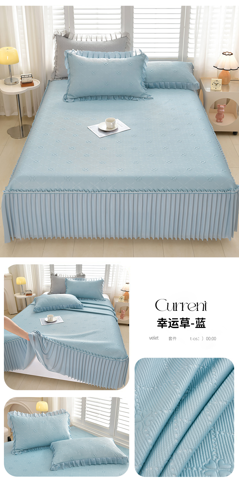 (总)畅畅家纺 2026春夏新款聚乙烯中分子凉感冰感凉豆豆凉席席子床裙三件套幸运草,幸运草-粉,幸运草-灰,幸运草-蓝,幸运草-绿