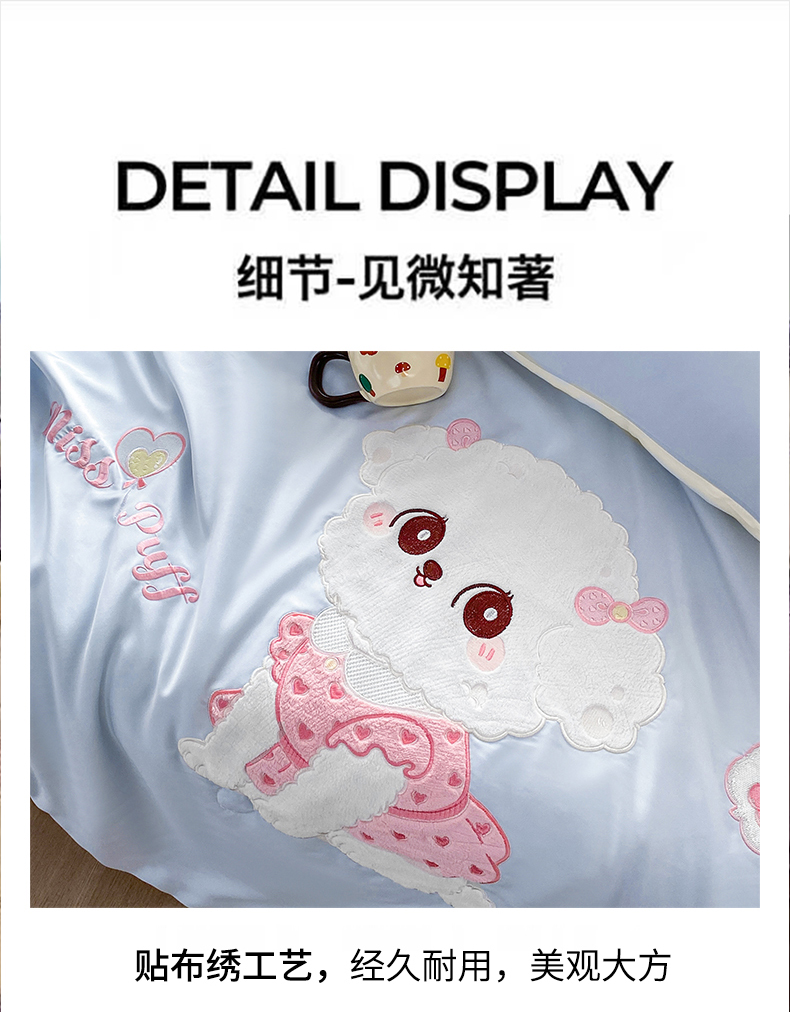 (总)绒棉世家 2026新款水洗真丝天丝专版贴布绣四件套,泡芙奶狗,白色布偶猫,粉色布偶猫,蝴蝶结,魔法猫,奶蓝兔仔,绅士小熊