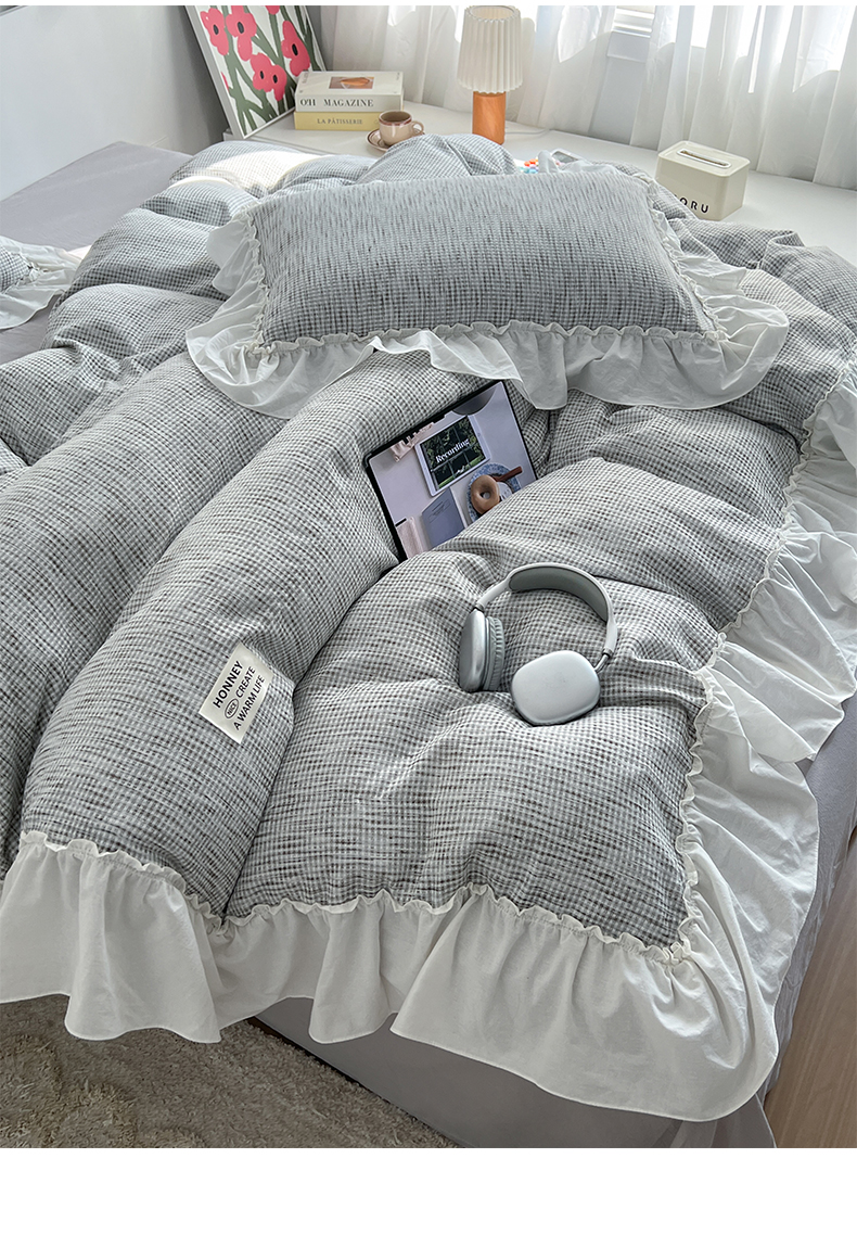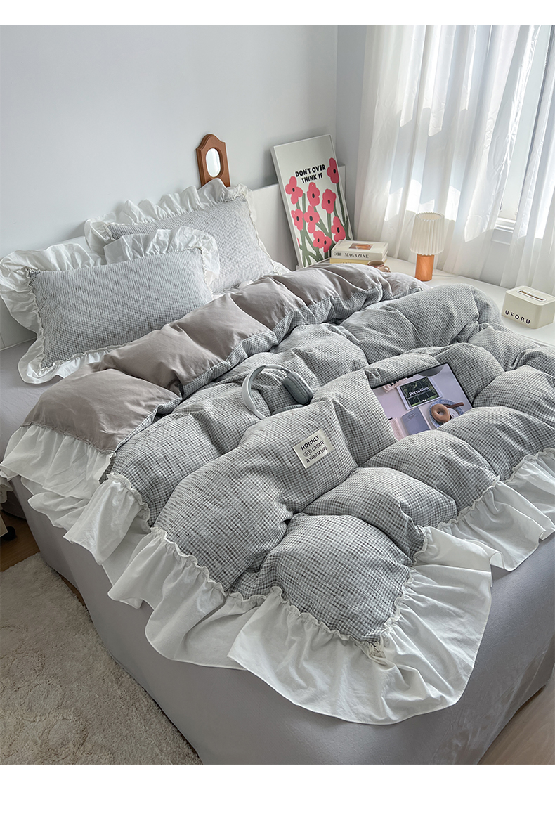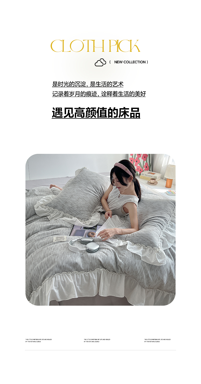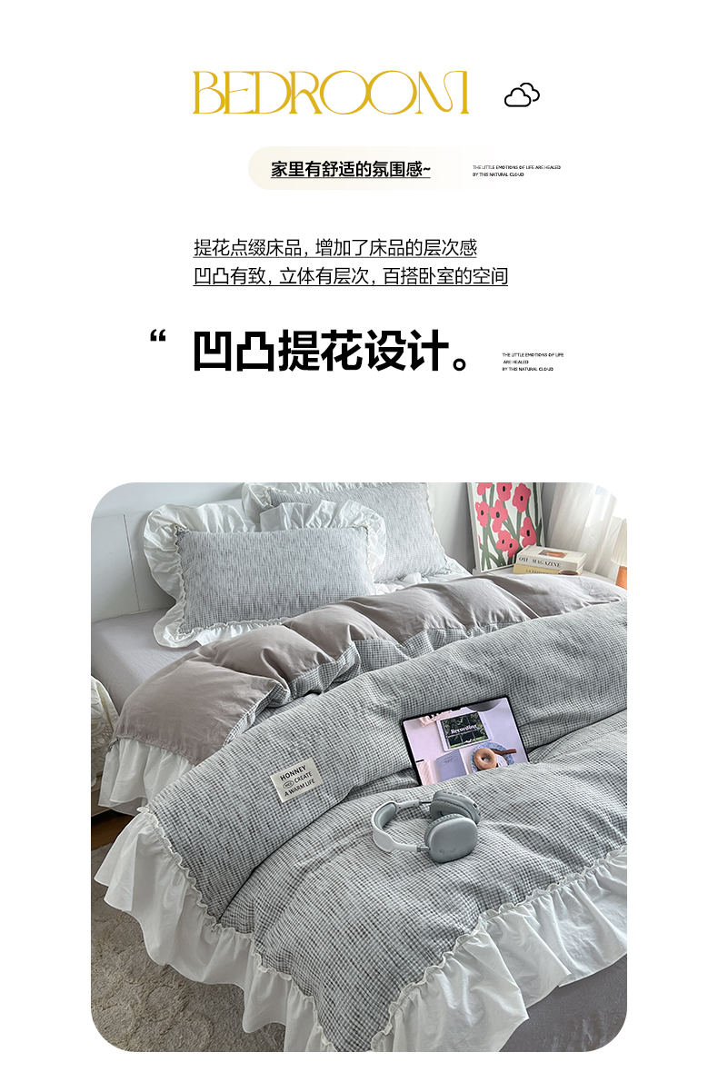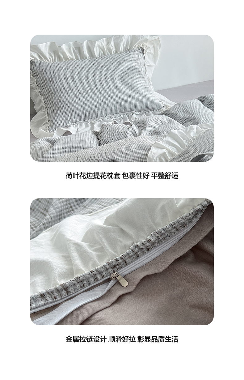 当前位置: 91家纺网 > 商品网购 > 床品套件 > 四件套 > 其它四件套 > 晨曦家纺 2026新款荷叶花边雪尼尔提花四件套可水洗棉四件套少女风 浅灰松烟