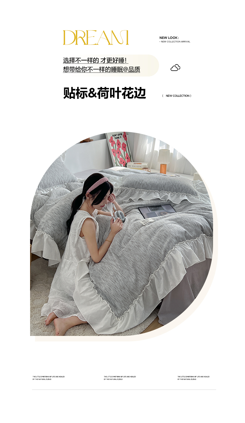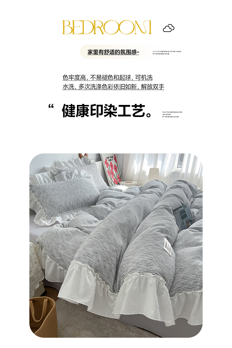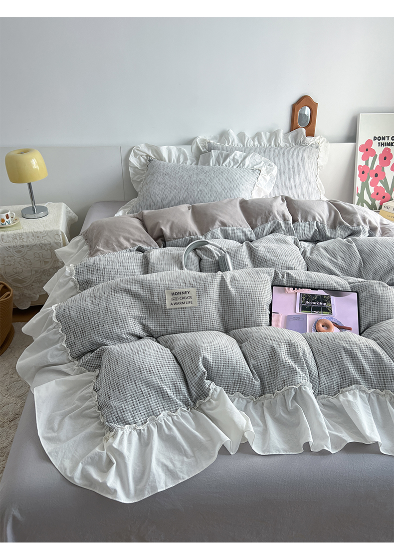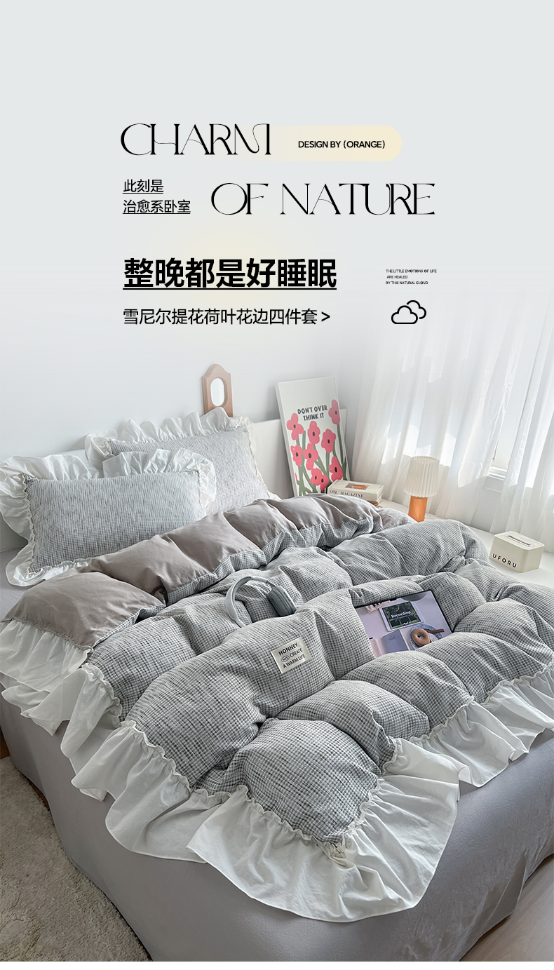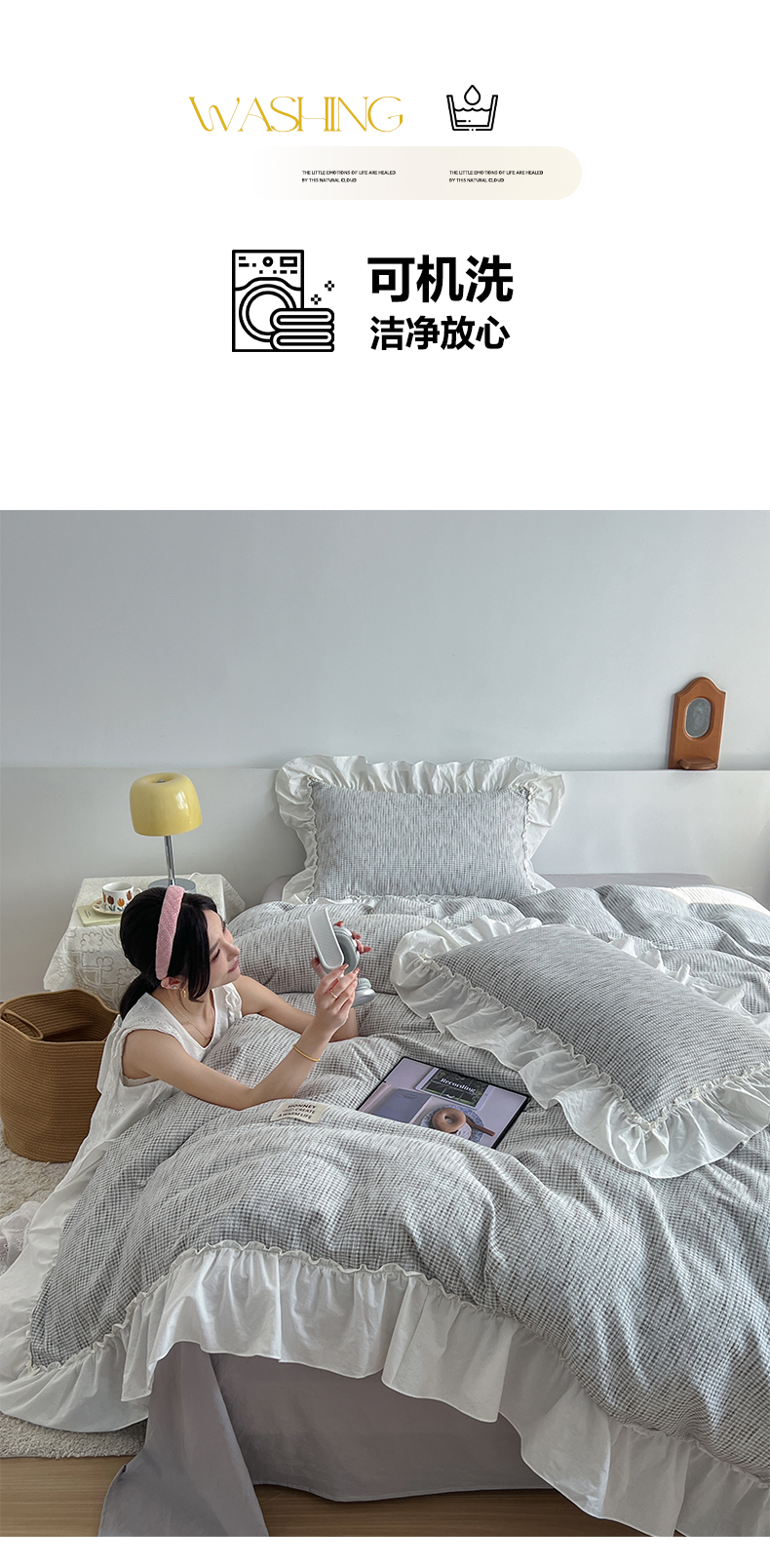 当前位置: 91家纺网 > 商品网购 > 床品套件 > 四件套 > 其它四件套 > 晨曦家纺 2026新款荷叶花边雪尼尔提花四件套可水洗棉四件套少女风 浅灰松烟
