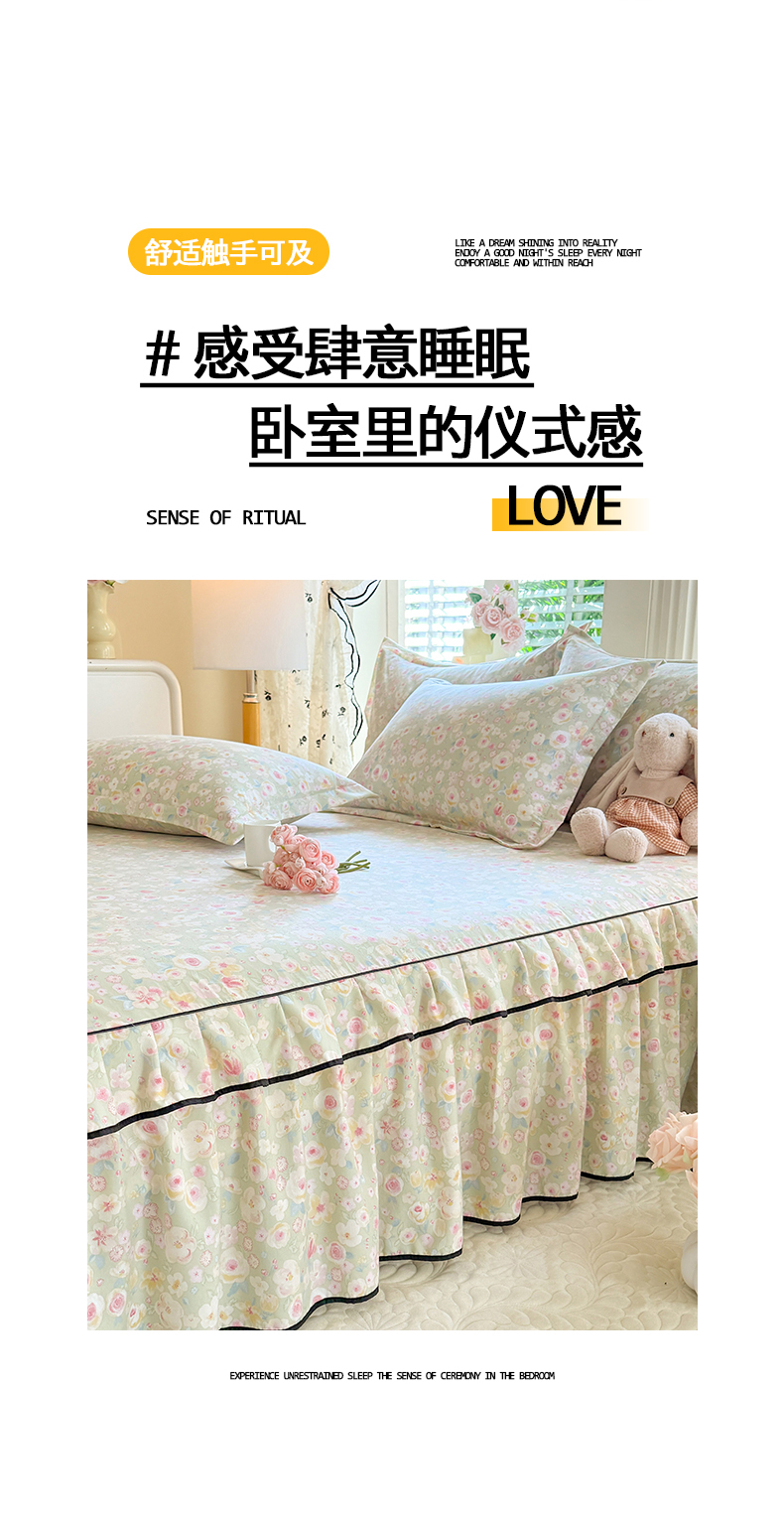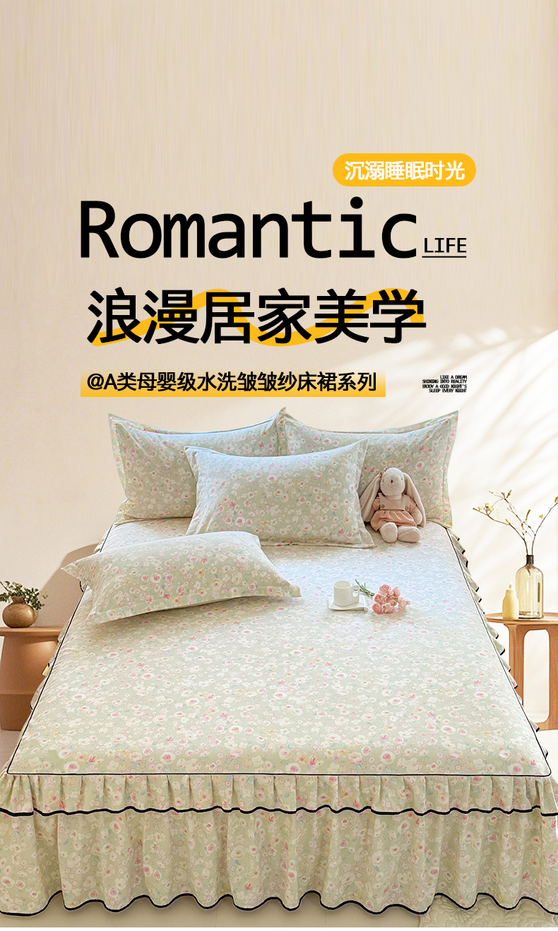 当前位置: 91家纺网 > 商品网购 > 床上用品 > 床裙 > 优家居 2026新款A类水洗棉床裙单件三件套皱皱纱韩版公主风花边床罩直播爆款外贸定制 海棠花颂