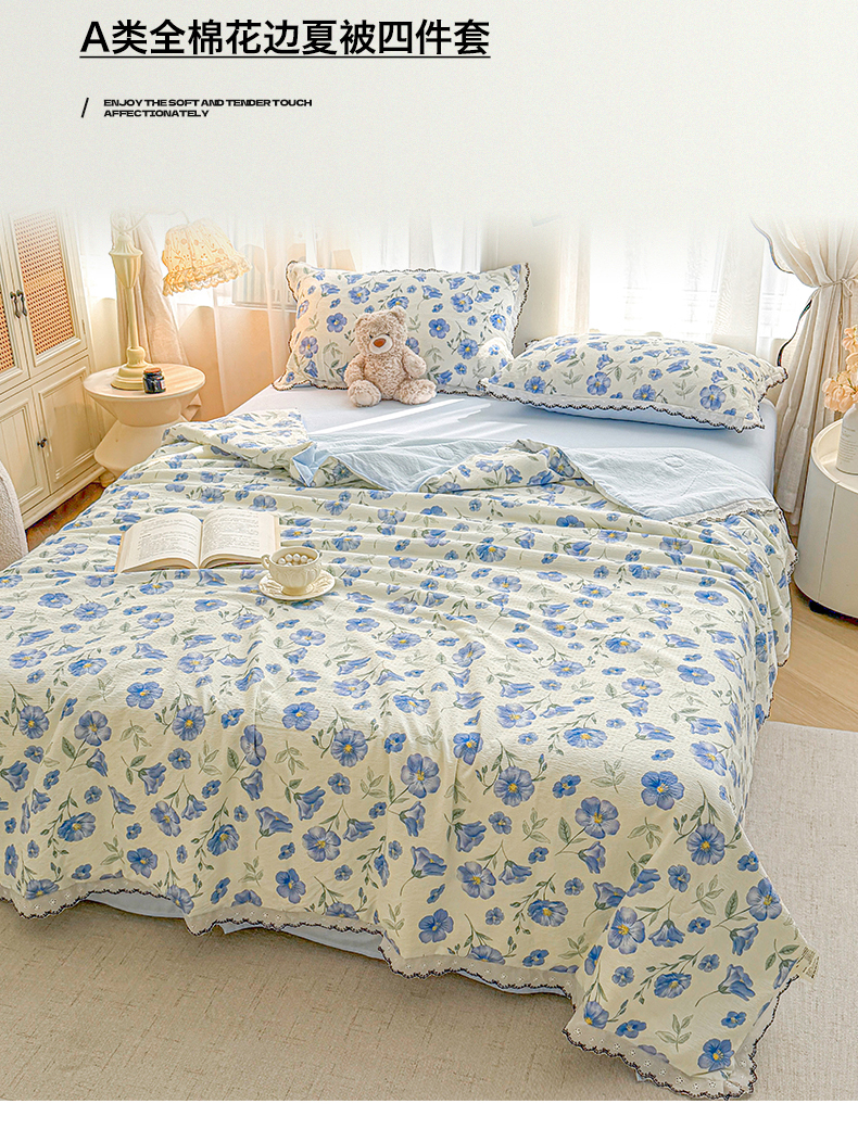 当前位置: 91家纺网 > 商品网购 > 被子 > 夏被 > 招财星家纺 2026新款A类全棉花边云感双层纱大豆纤维夏被四件套夏被夏凉被空调被(带质检报告买家秀) 花边款-花语