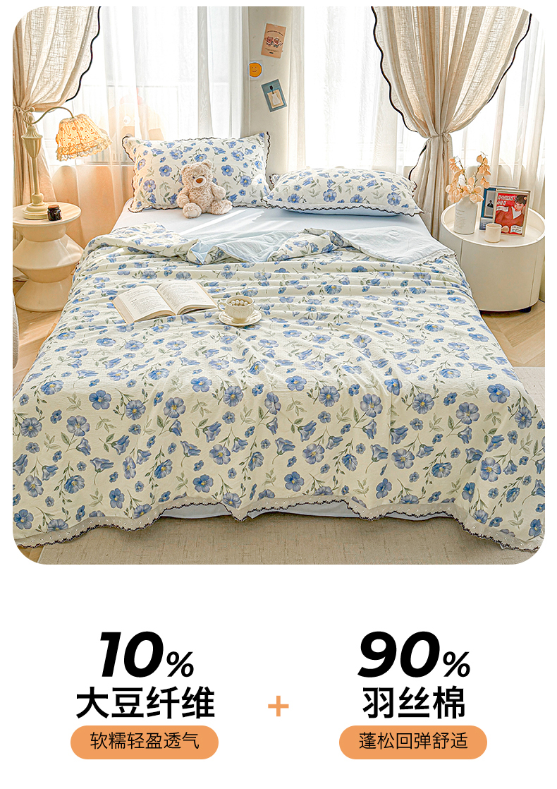 招财星家纺 2026新款A类全棉花边云感双层纱大豆纤维夏被四件套夏被夏凉被空调被(带质检报告买家秀) 花边款-花语