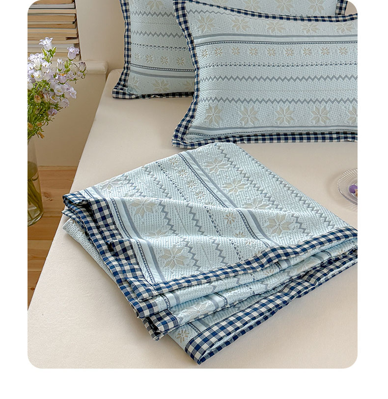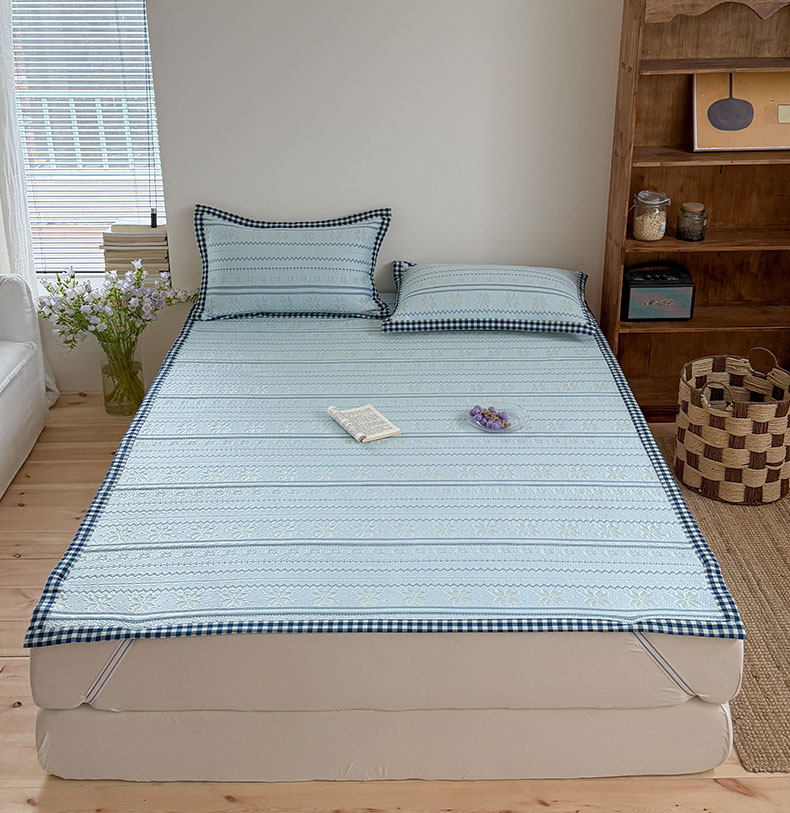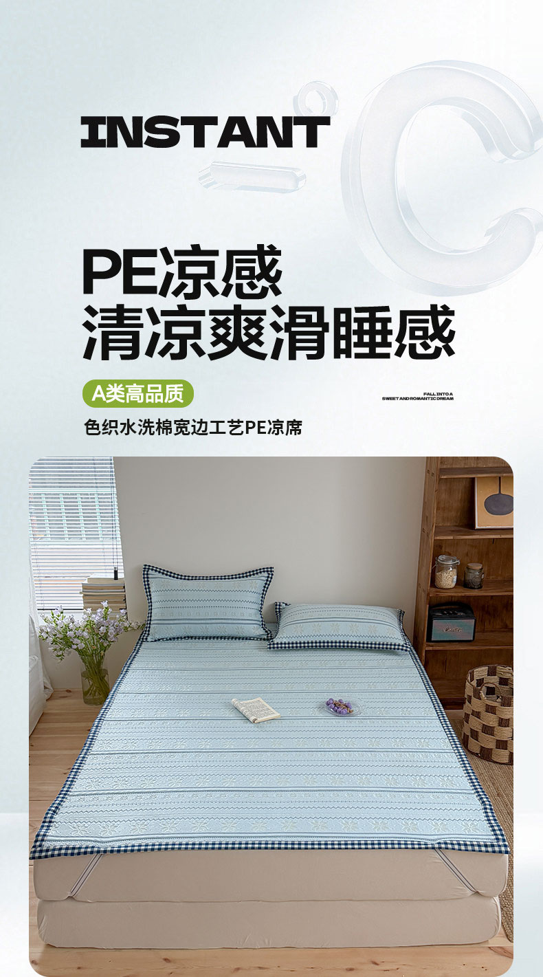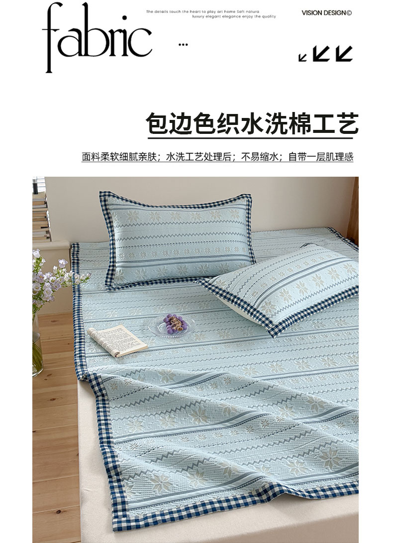 • 91家纺网 家纺一手货源 找家纺 桃子家居 2026新款A类原木风雪花复古高级亲肤全棉色织水洗棉宽边工艺PE凉感凉席三件套 PE宽边席-海盐冰茶