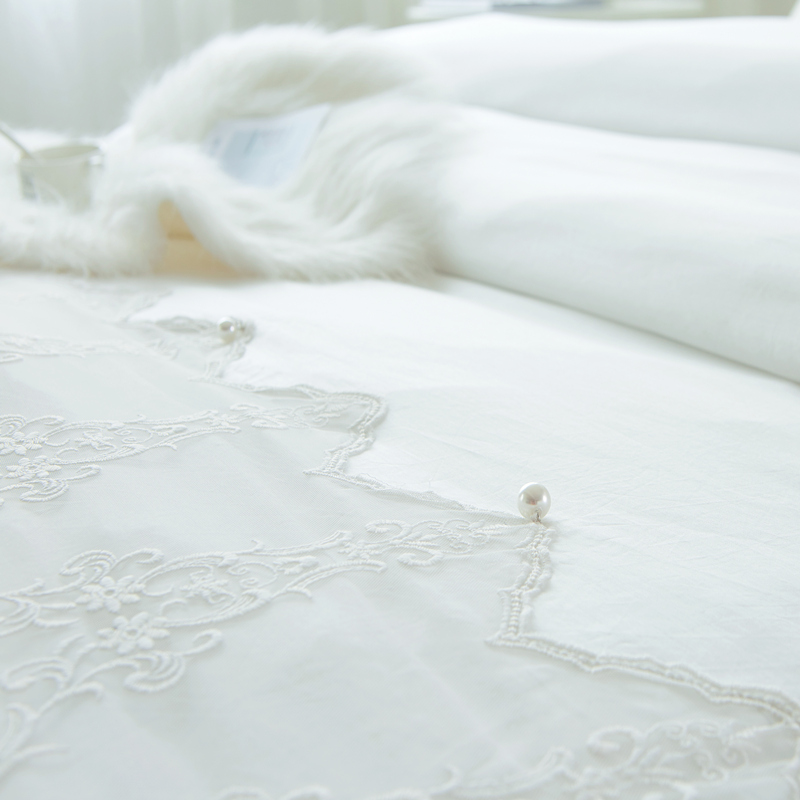 菊上家纺 60S贡缎全棉纯色蕾丝床裙四件套 灰白情调