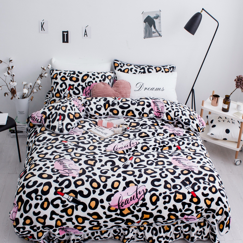 顾里家纺 加厚保暖牛奶绒套件 豹纹红唇
