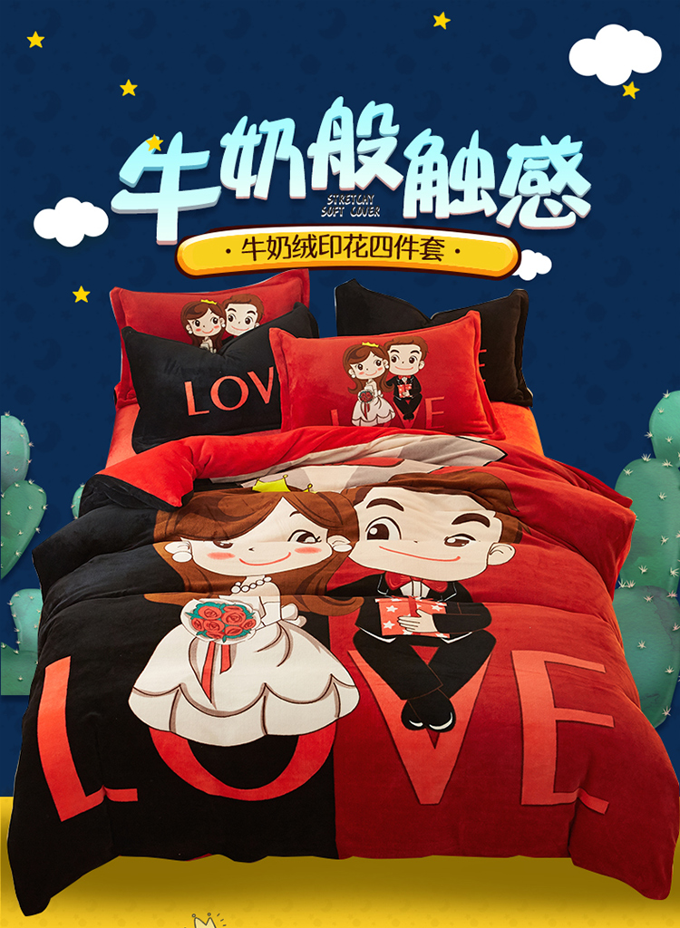 KT猫直营店2024新款卡通法莱绒牛奶绒情侣四件套 1ove