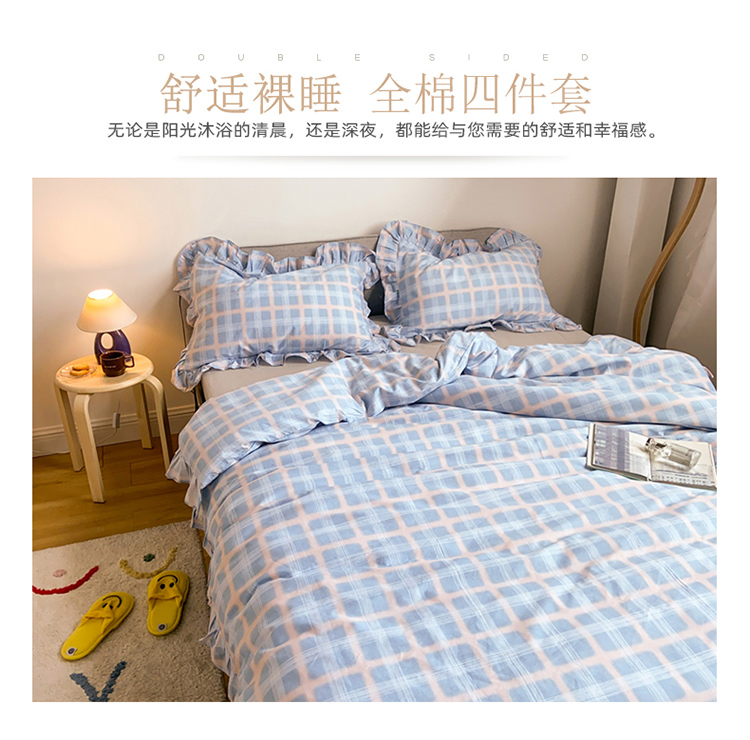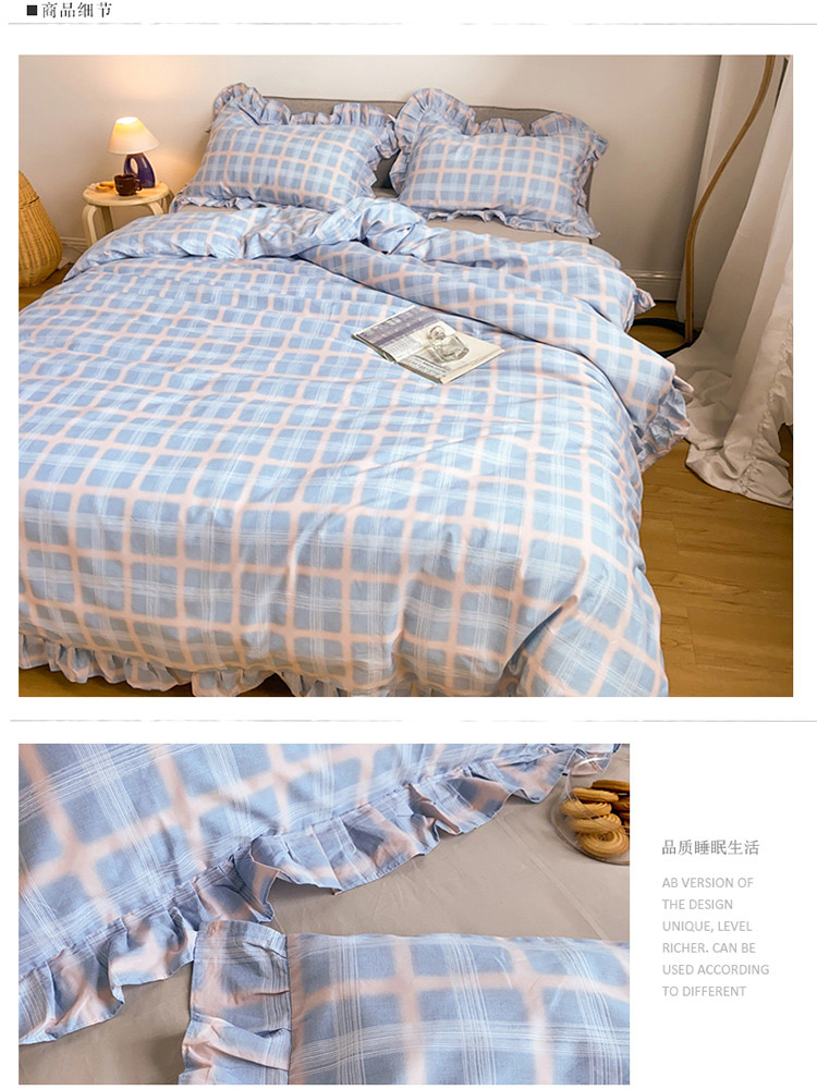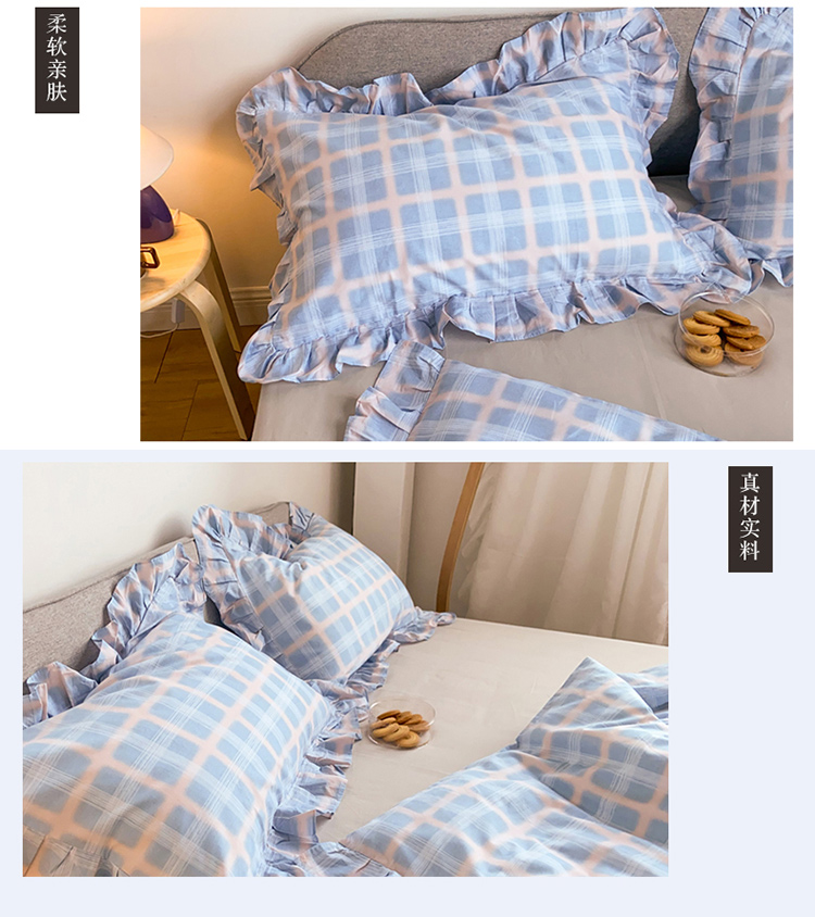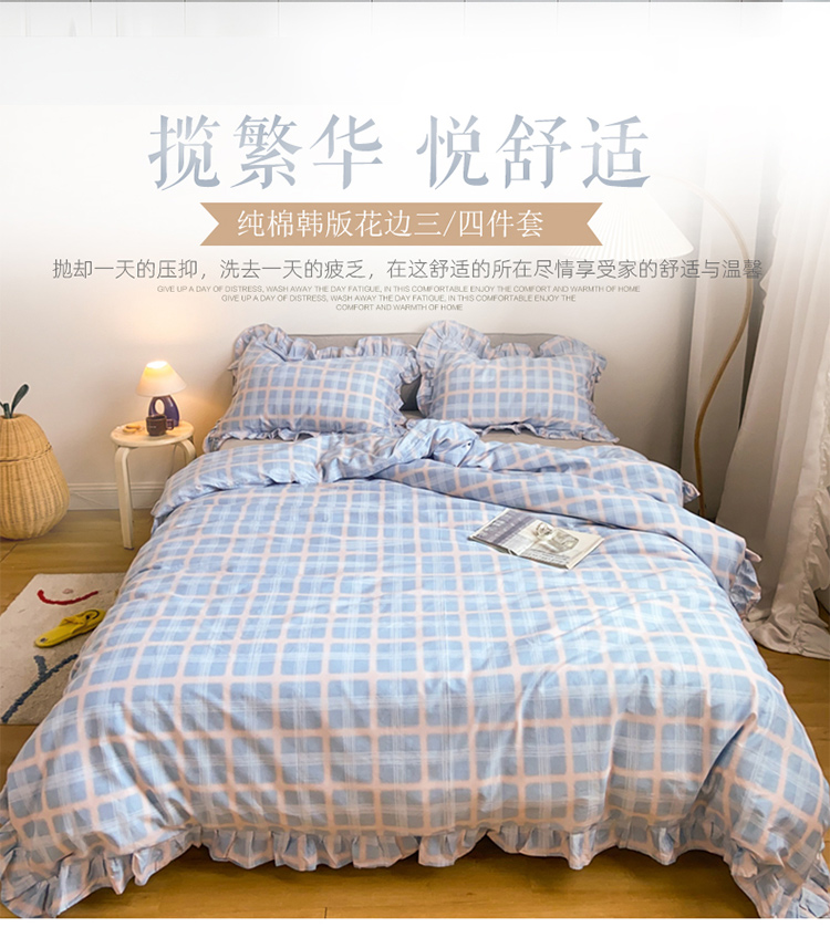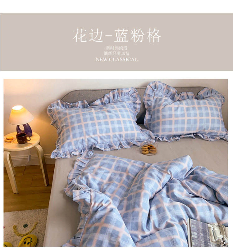 窝米2020新款13372工艺款韩版风格子花边四件套 蓝粉格