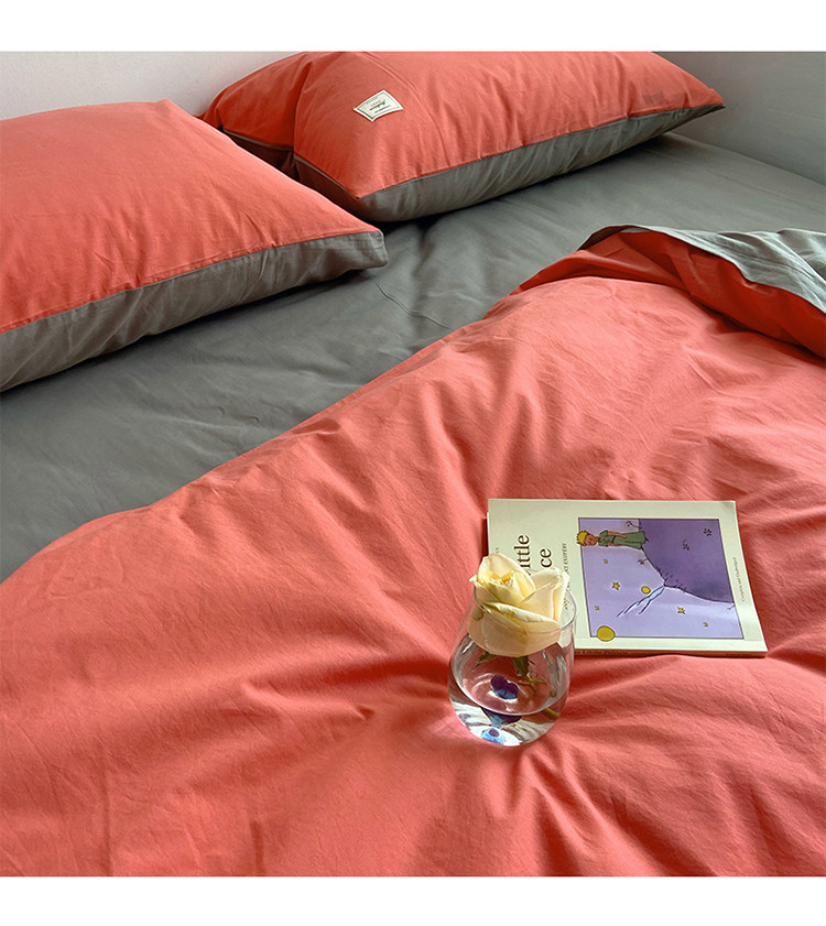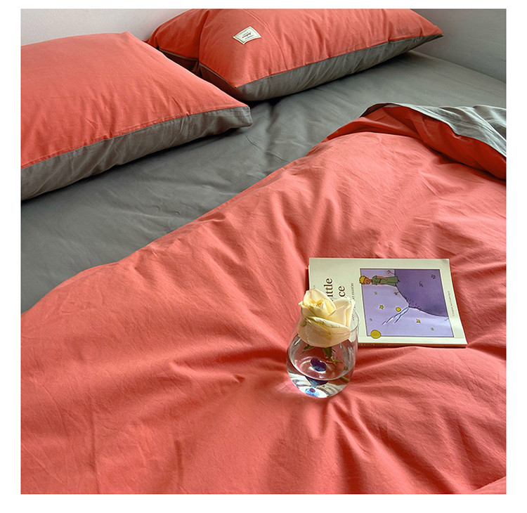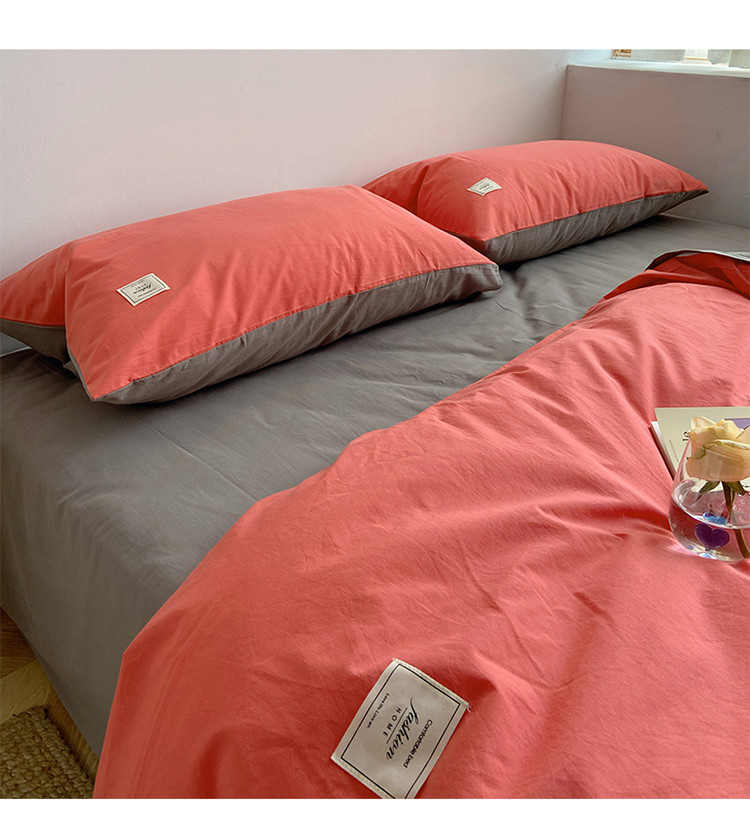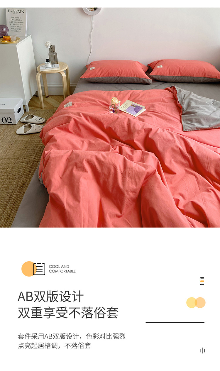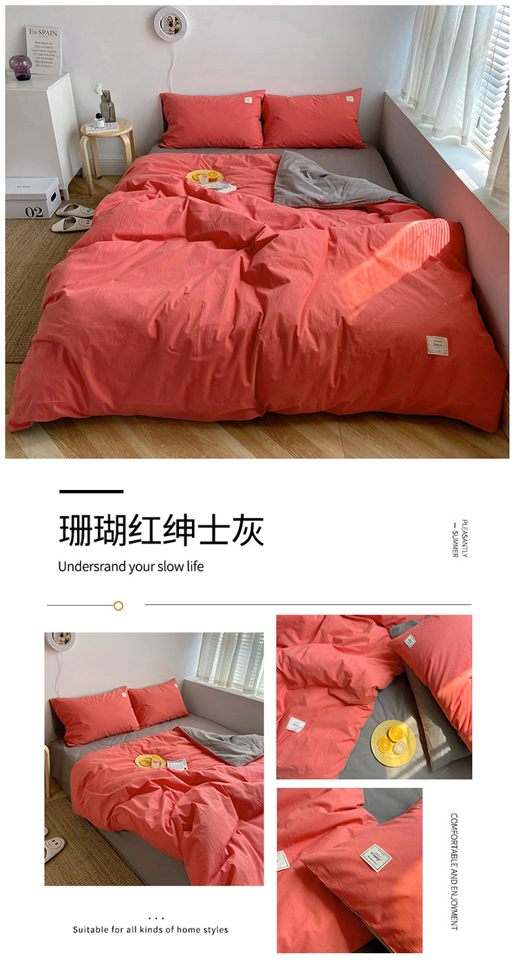 雅居纺家纺 2022新款全棉水洗棉四件套 珊瑚红绅士灰