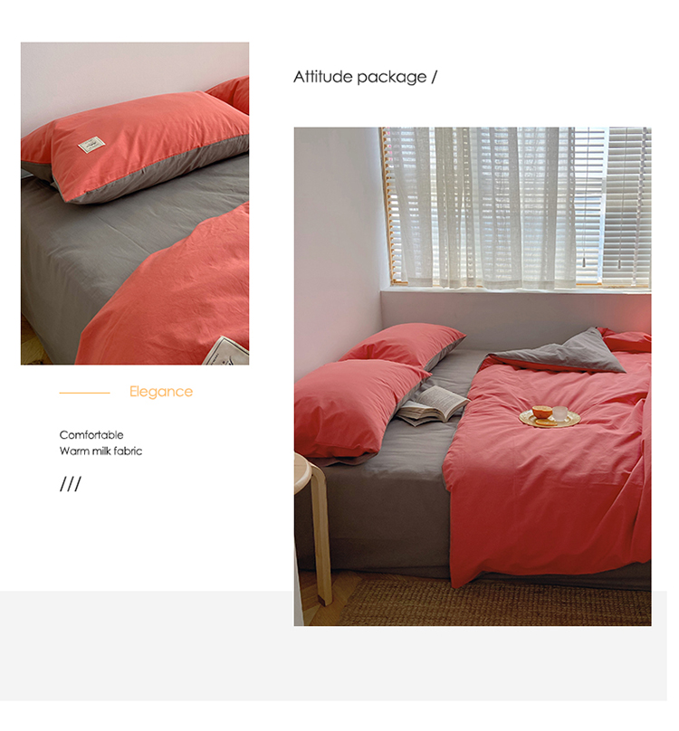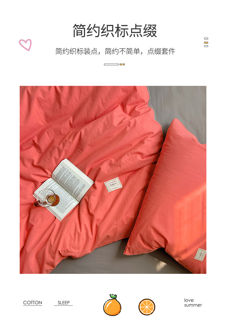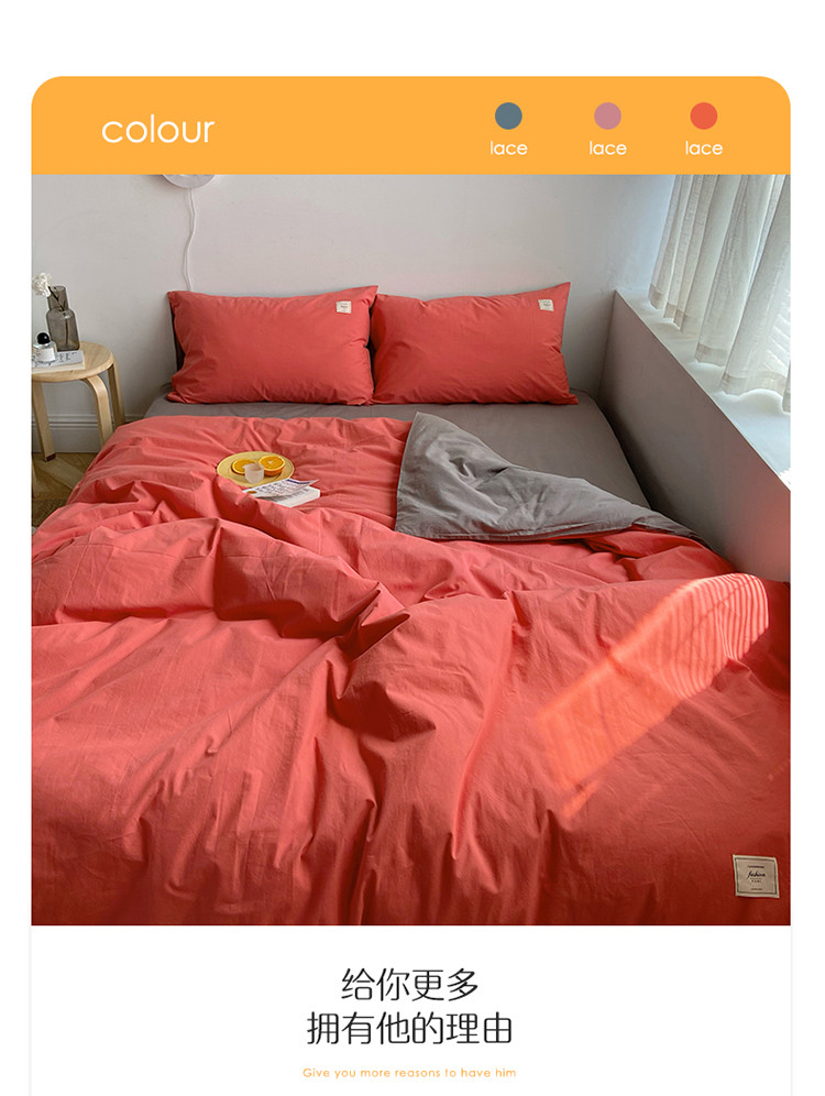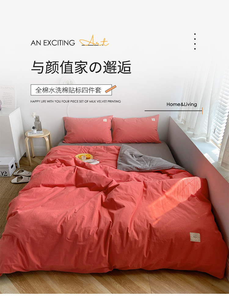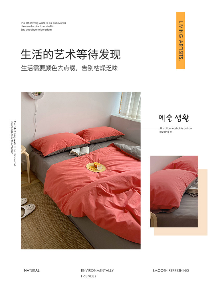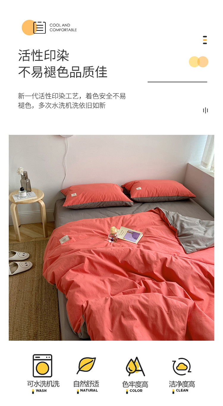 雅居纺家纺 2022新款全棉水洗棉四件套 珊瑚红绅士灰