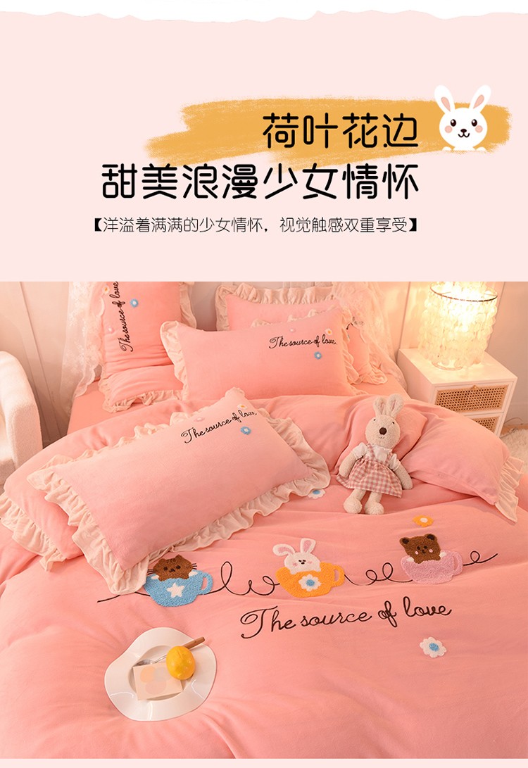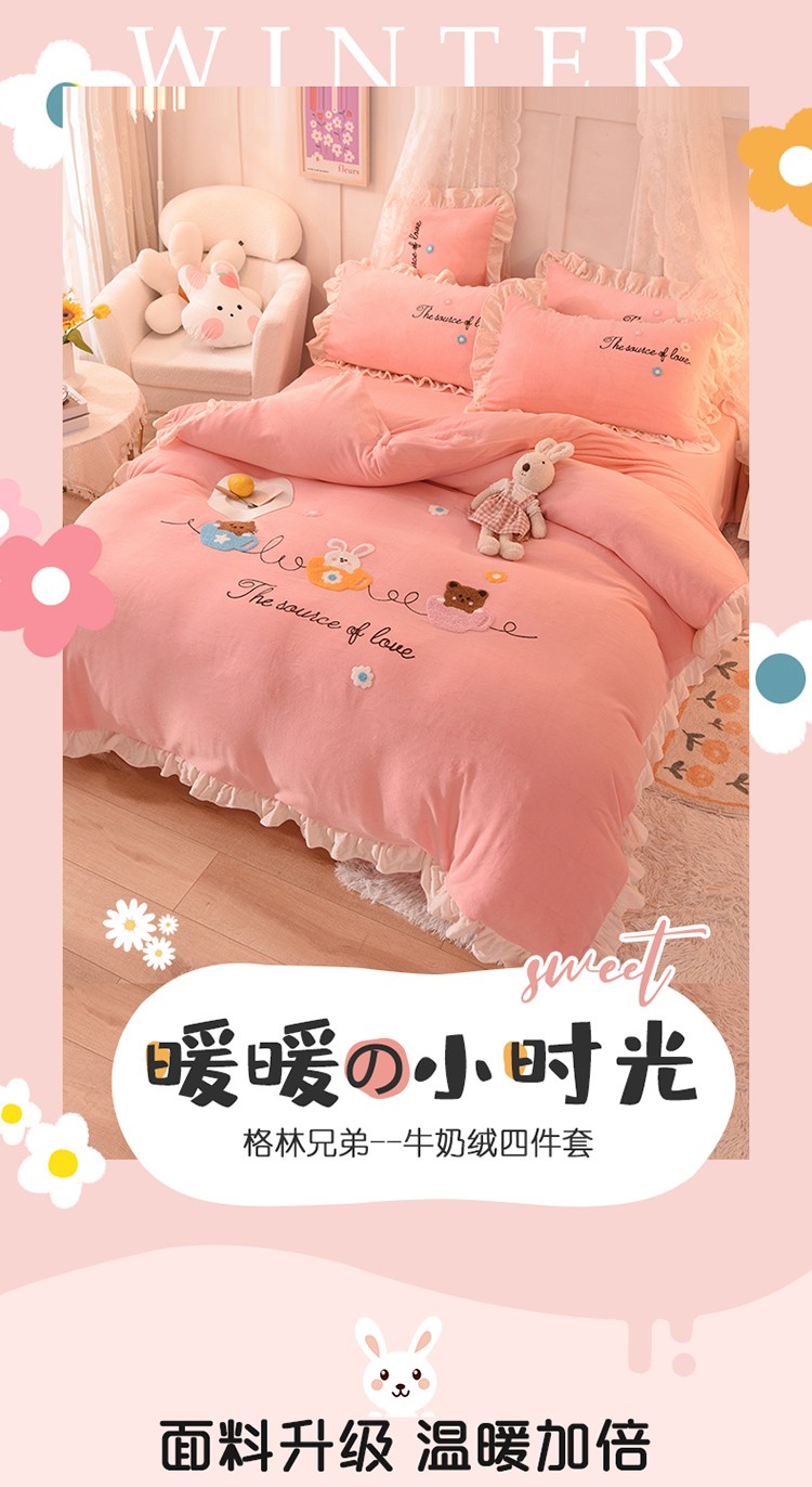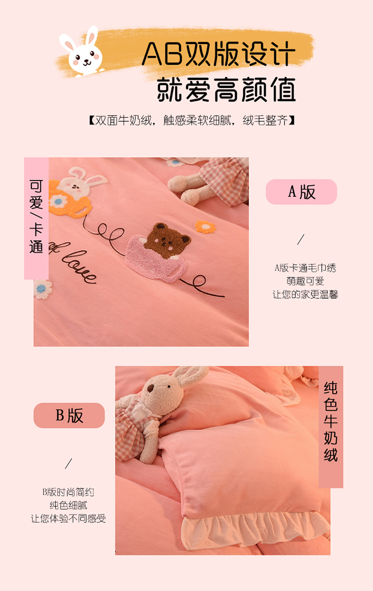 大米家居2023新款卡通毛巾绣牛奶绒宝宝绒四件套格林兄弟皮粉