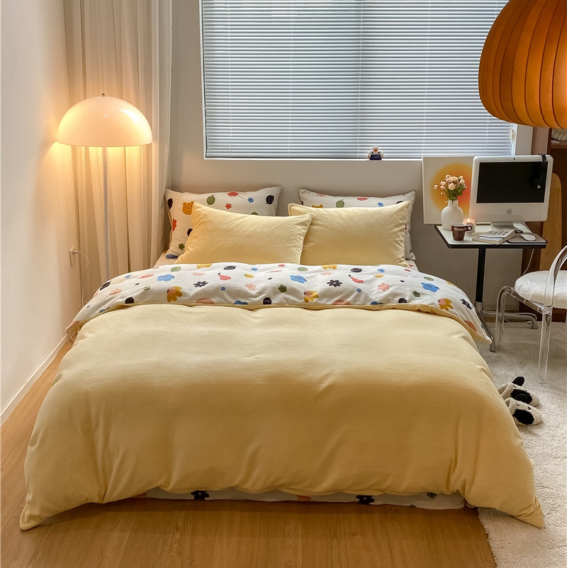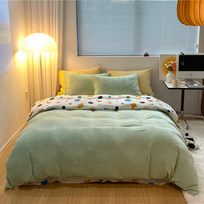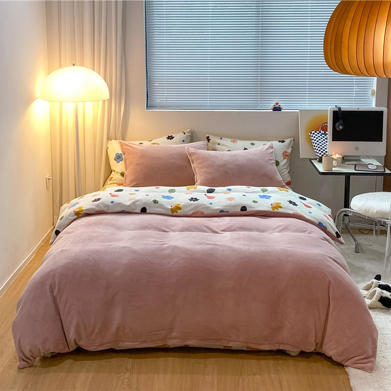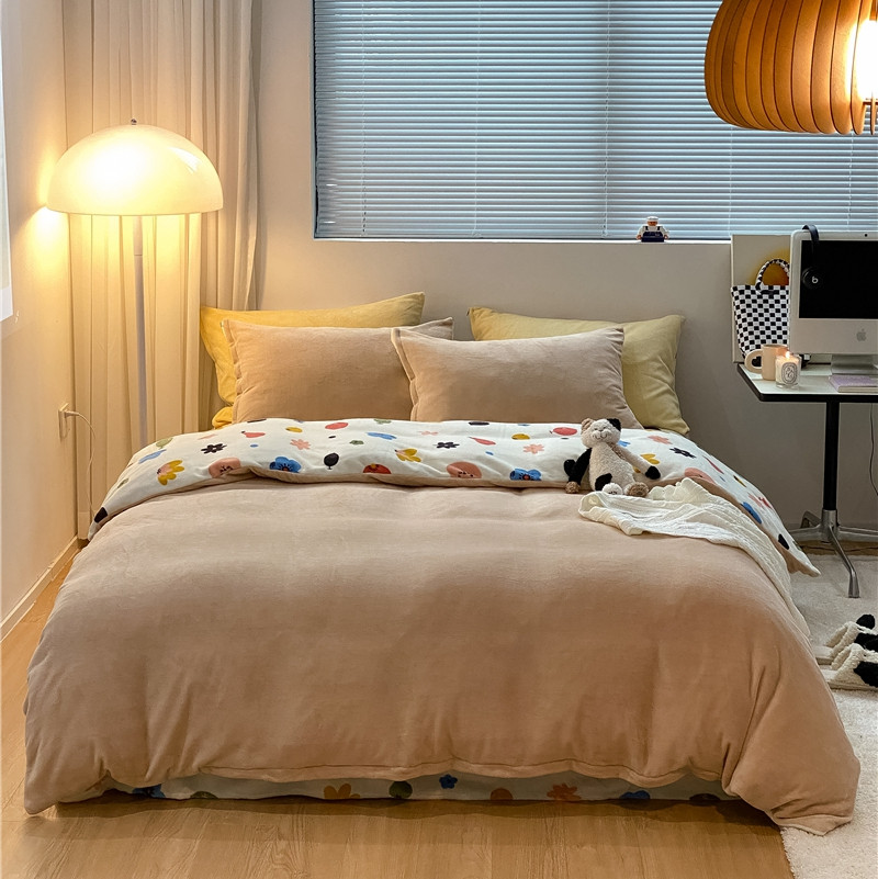 (总)棉眠 2021新款纯色拼卡通牛奶绒四件套