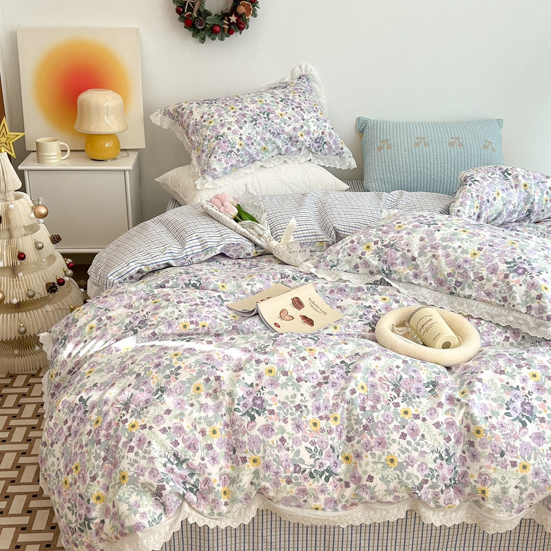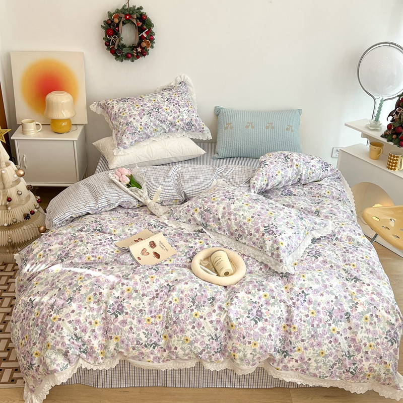昔可家纺 2022新款全棉仙仙蕾丝碎花四件套 醉梨花紫