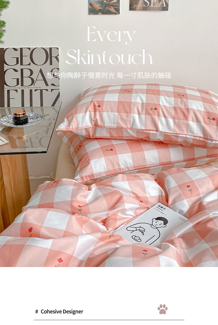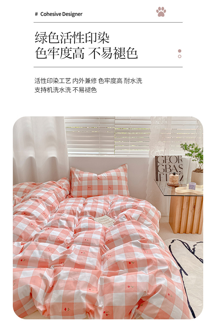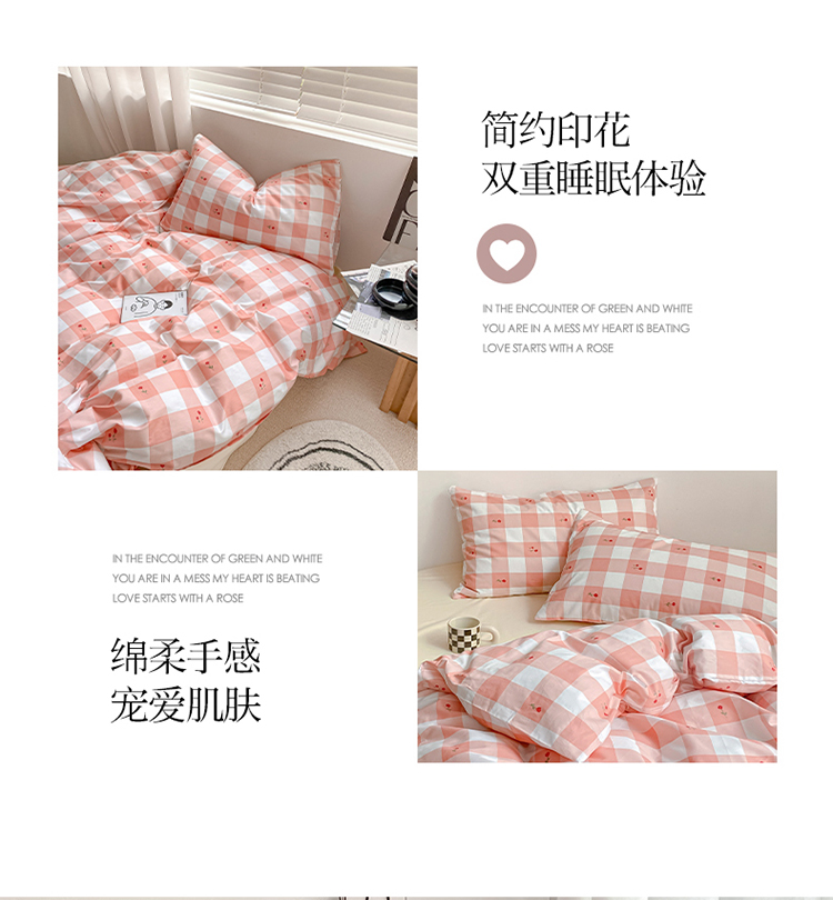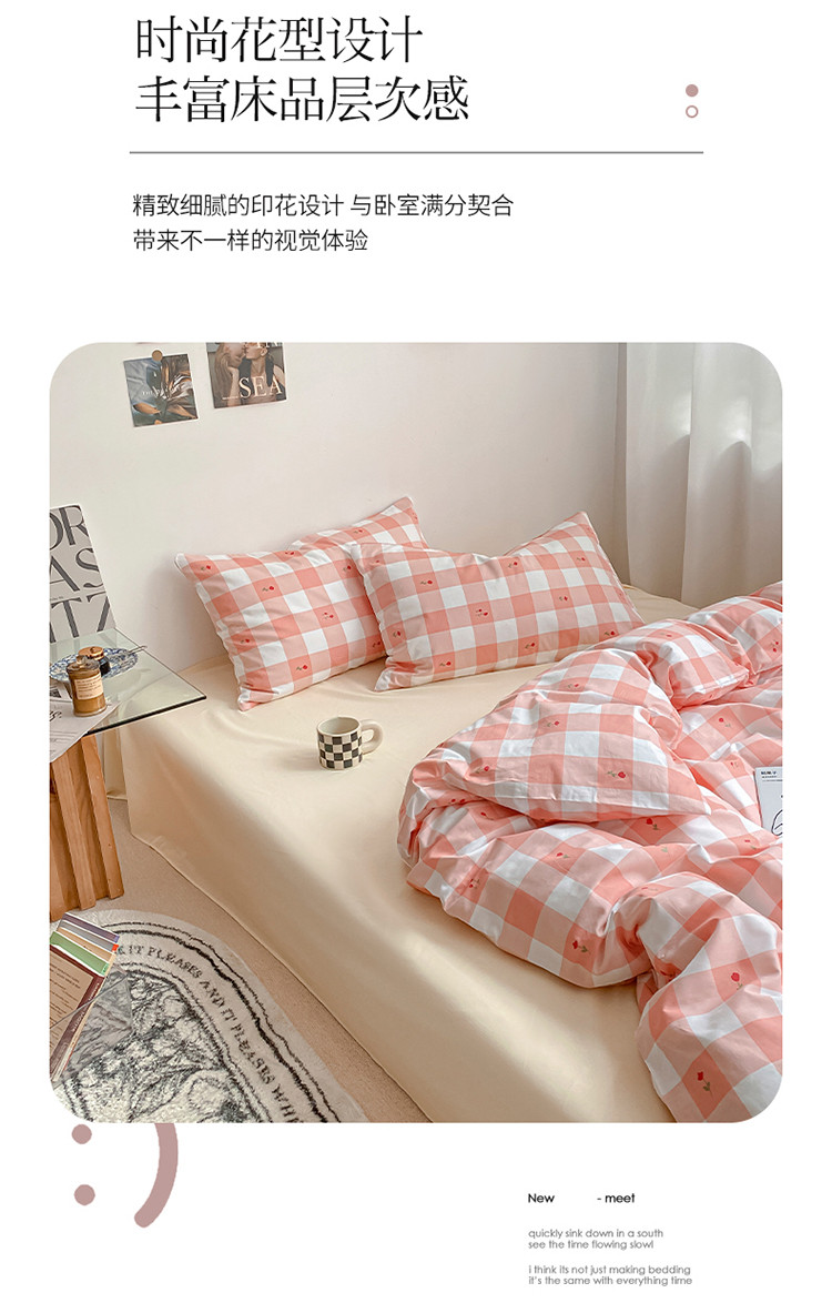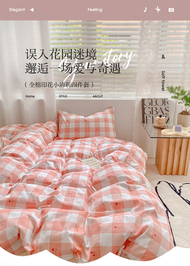 雅居纺 2022新款全棉13070印花小清新四件套 格子小红花