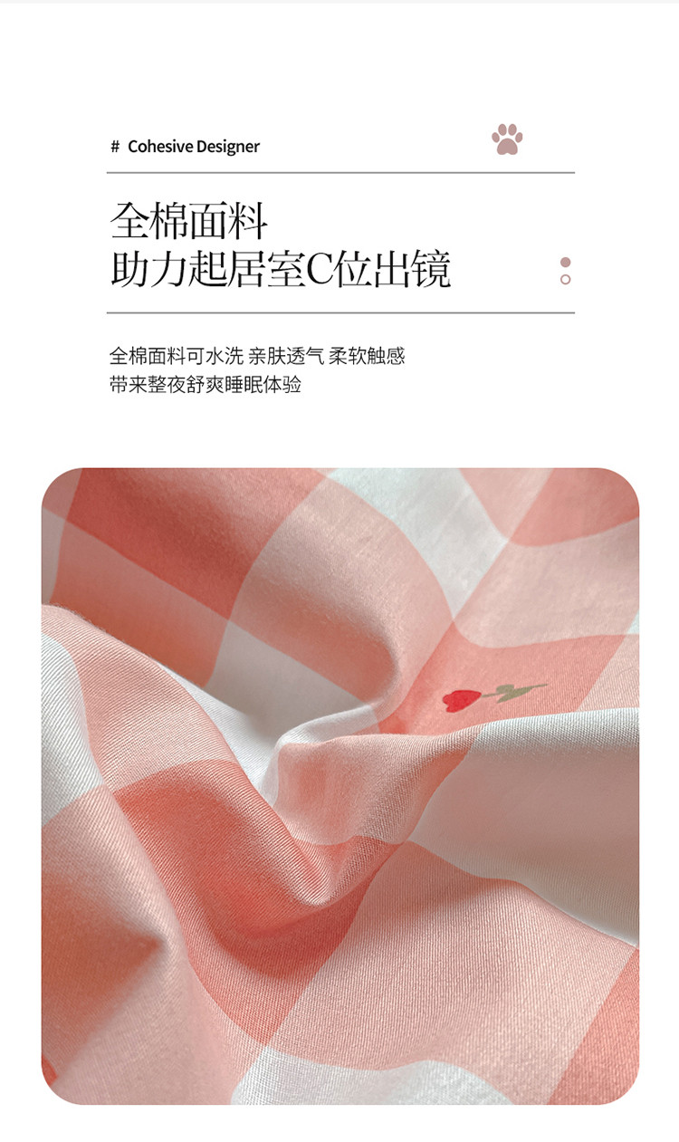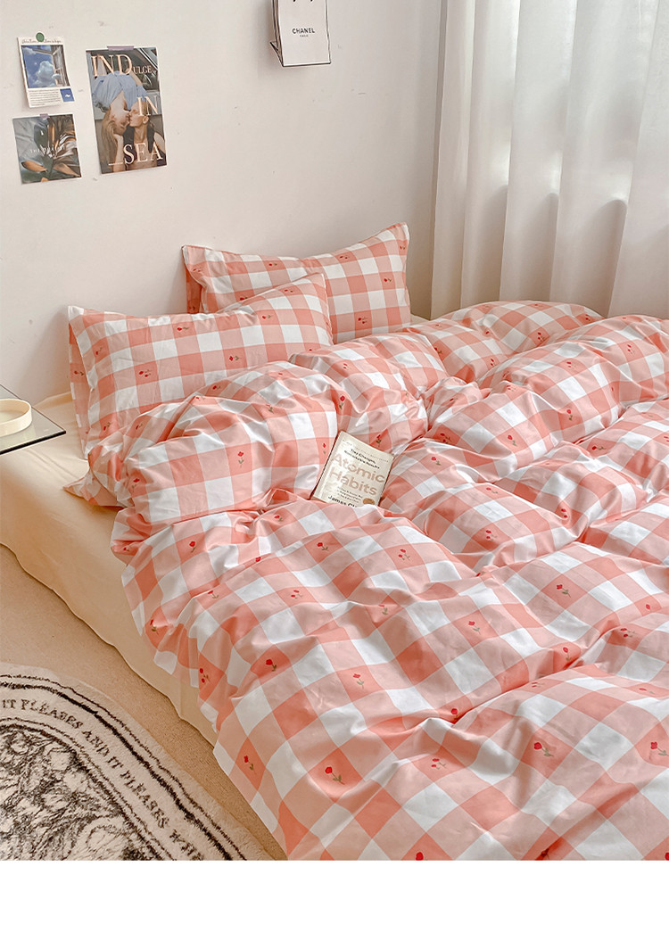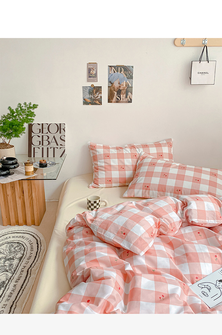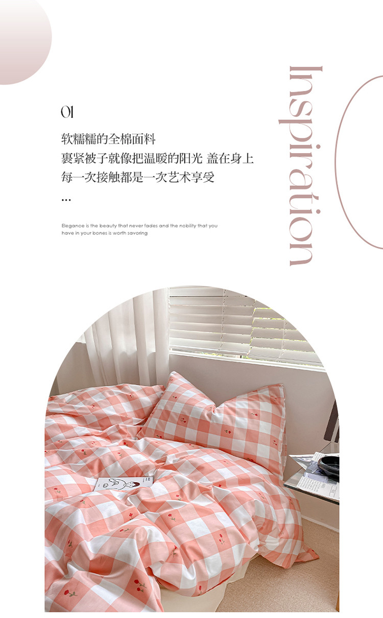 雅居纺 2022新款全棉13070印花小清新四件套 格子小红花