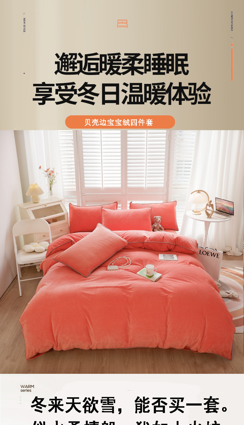 当前位置: 91家纺网 > 商品网购 > 床品套件 > 四件套 > 宝宝绒四件套 > 啊雅家居 2025新款贝壳边宝宝绒四件套 贝壳砖红