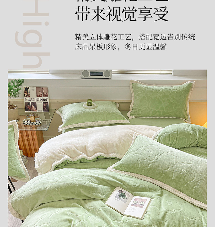 琪格格纺织 2025新款全消光小清新花边款雕花牛奶绒四件套 雕花绒花边-玉珠莲 绿 ,雕花绒花边-玉珠莲 绿