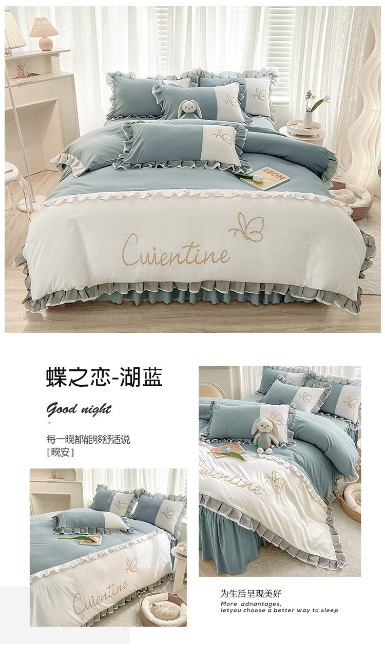 当前位置: 91家纺网 > 商品网购 > 床品套件 > 四件套 > 普通磨毛四件套 > 慕语家纺 2023新款蝶之恋刺绣磨毛花边四件套-风格二 蝶之恋-湖蓝