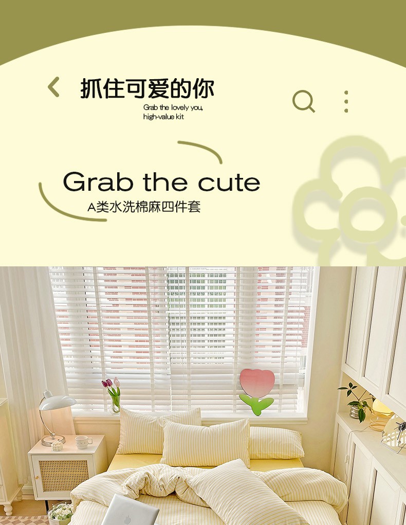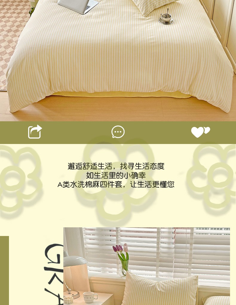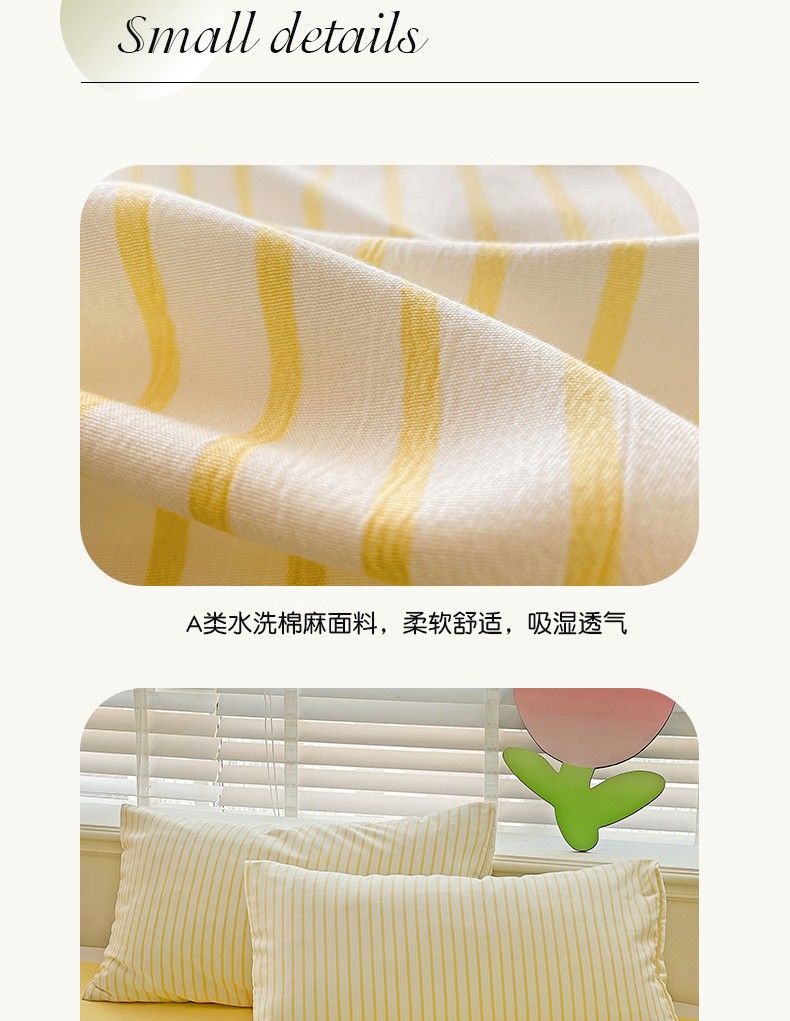 当前位置: 91家纺网 > 商品网购 > 床品套件 > 四件套 > 棉麻四件套 > 无印风双层纱水洗棉麻竖条纹四件套 嫩鹅黄条