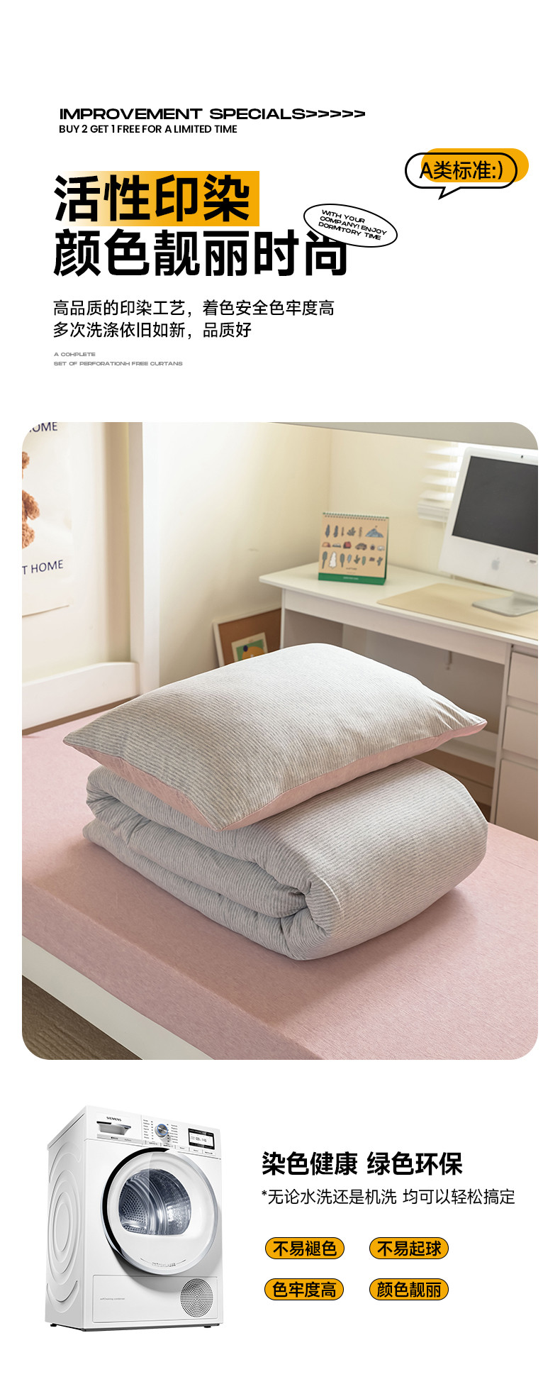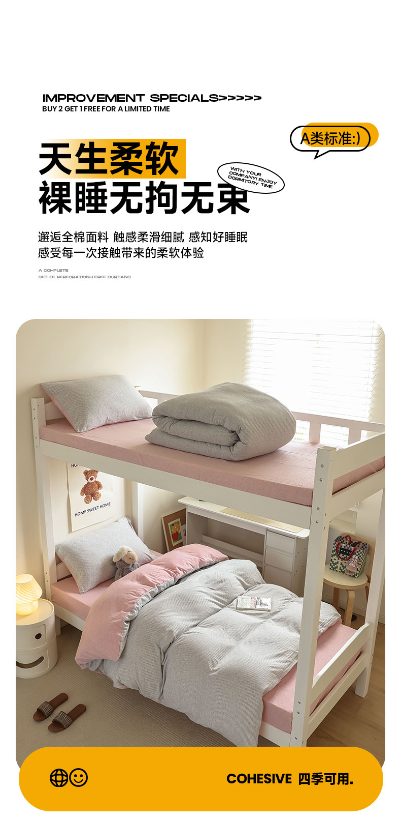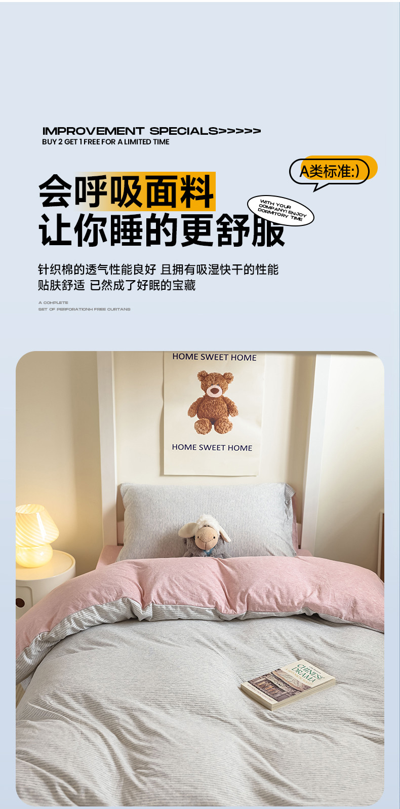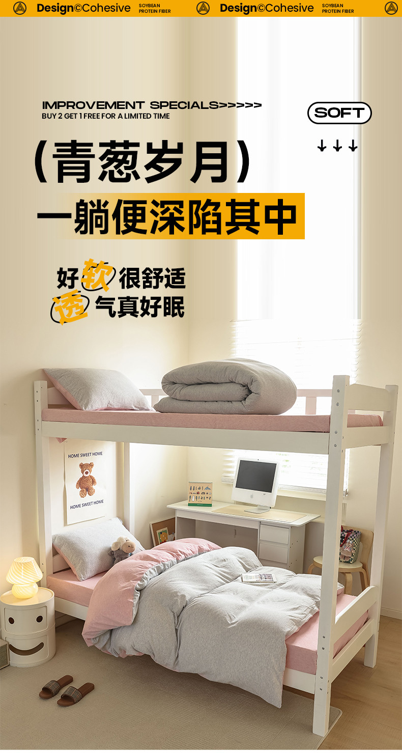 商品名称:寐眠 2023新款全棉针织棉学生三件套 粉灰细条