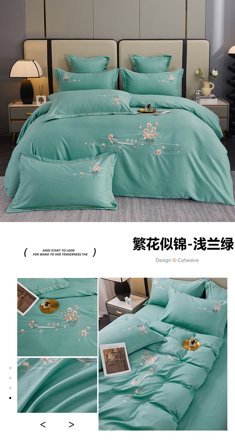 馨雅家纺 2025新款全棉绣花四件套系列 繁花似锦-浅兰绿