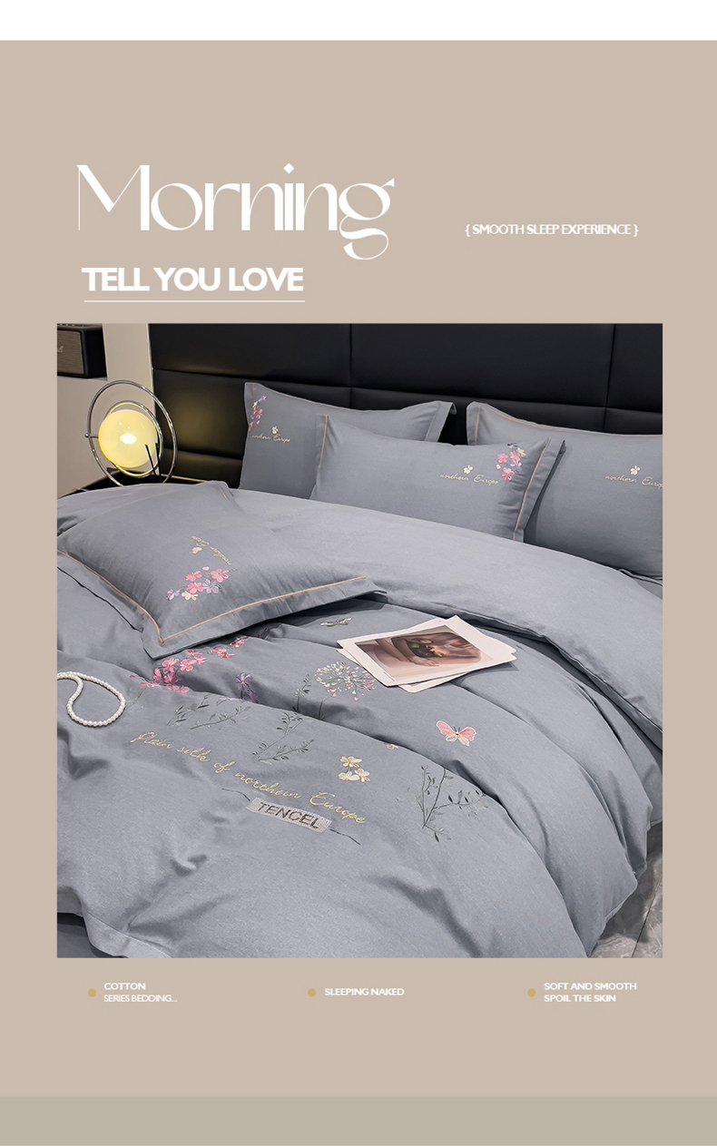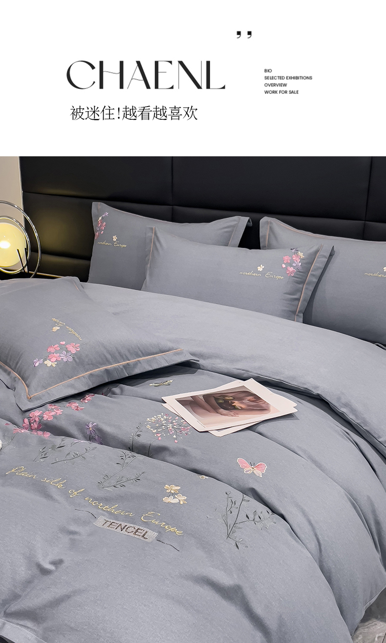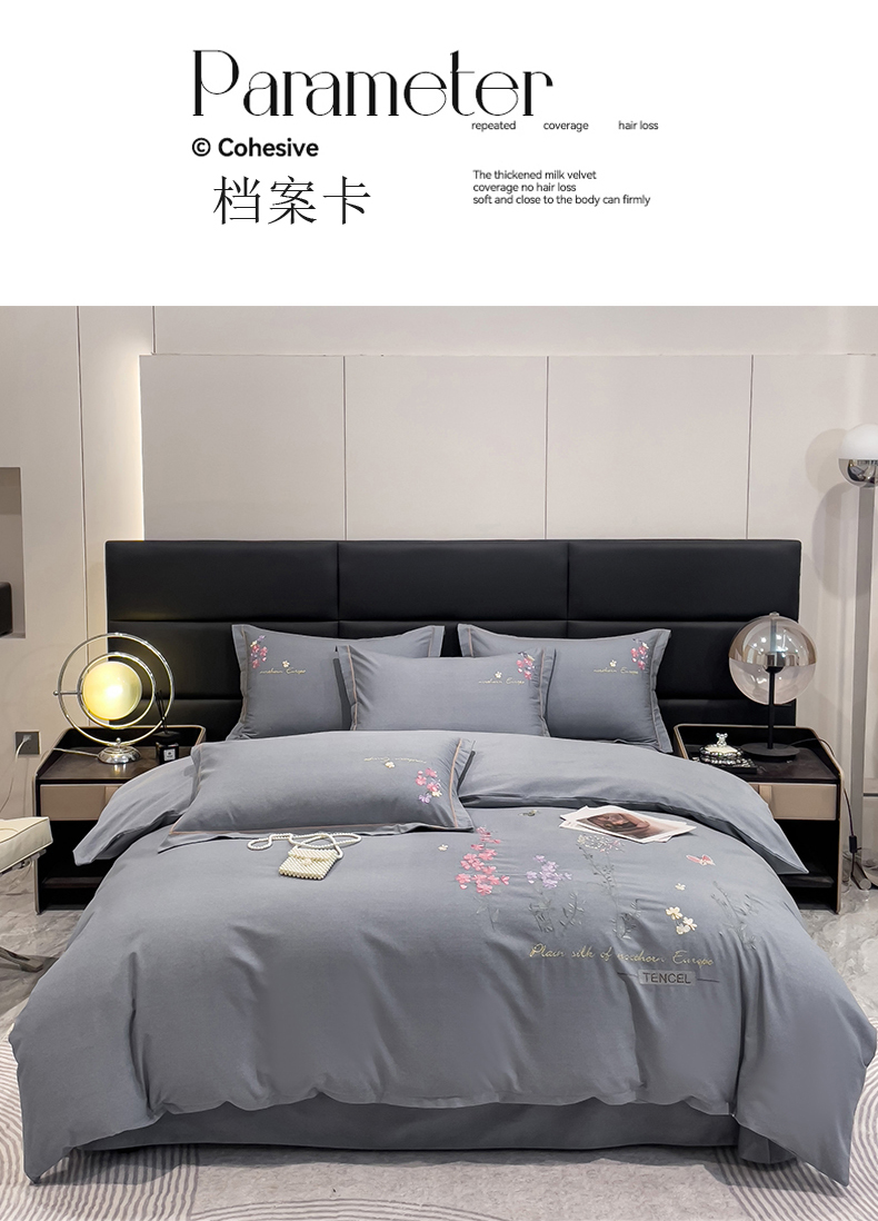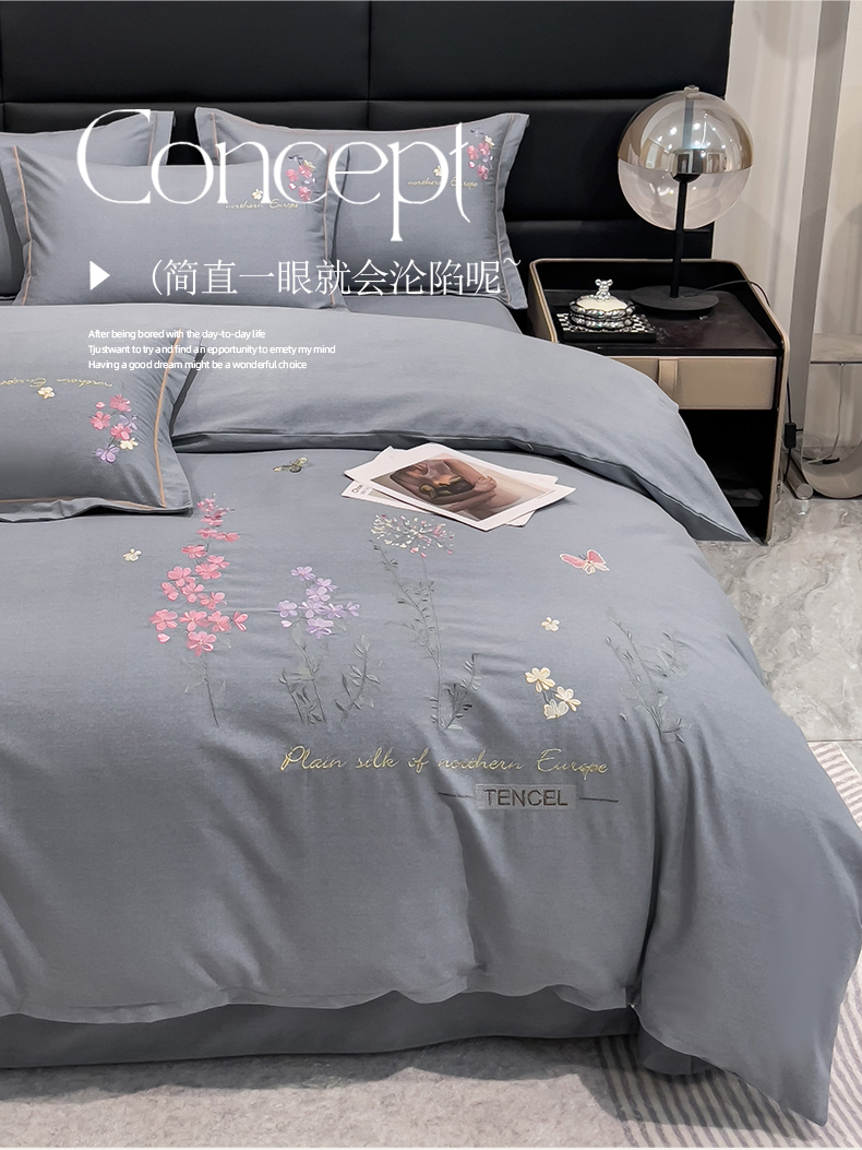 云锦2023新款全棉磨毛绣花四件套系列 漫野花香灰色