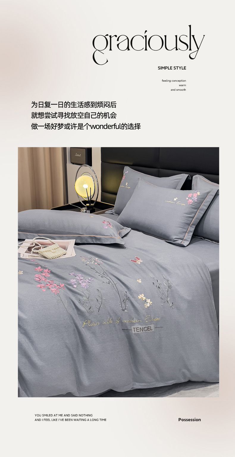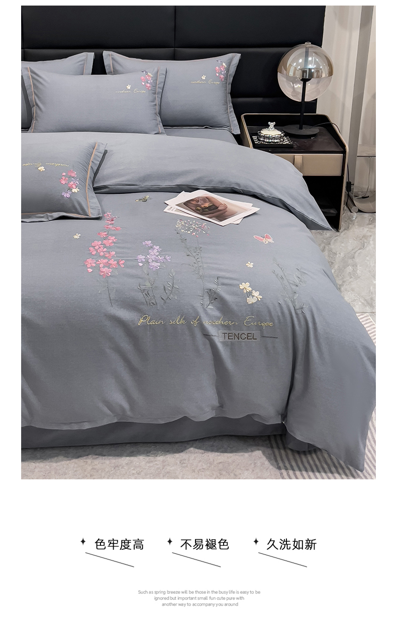 商品名称:云锦2023新款全棉磨毛绣花四件套系列 漫野花香灰色