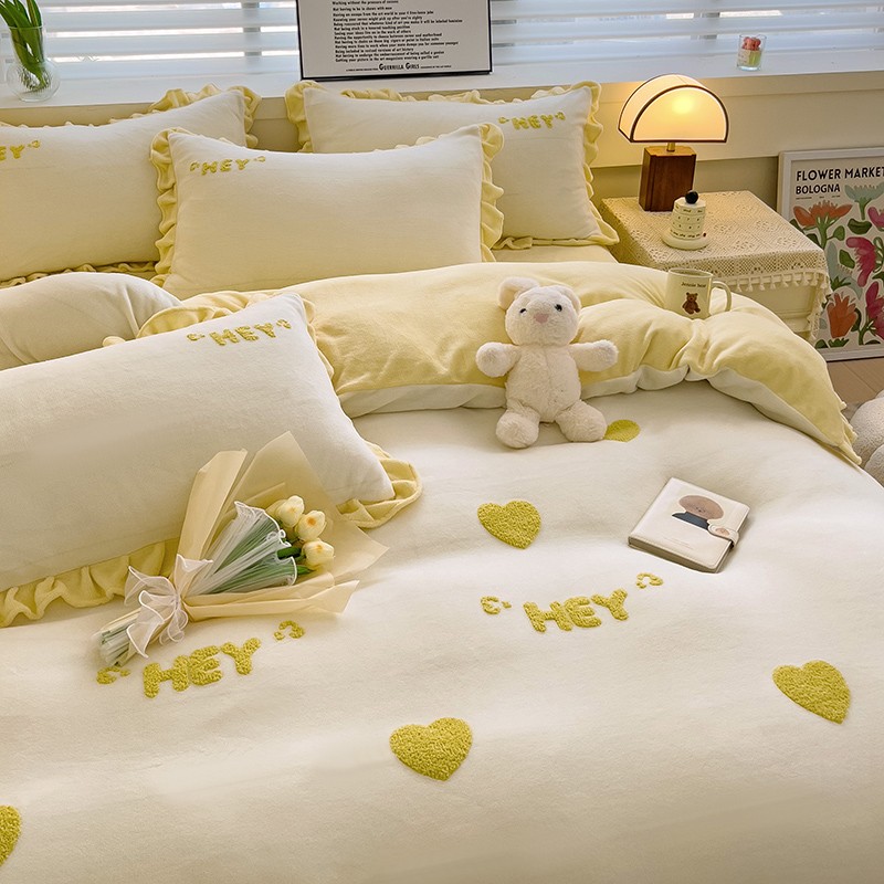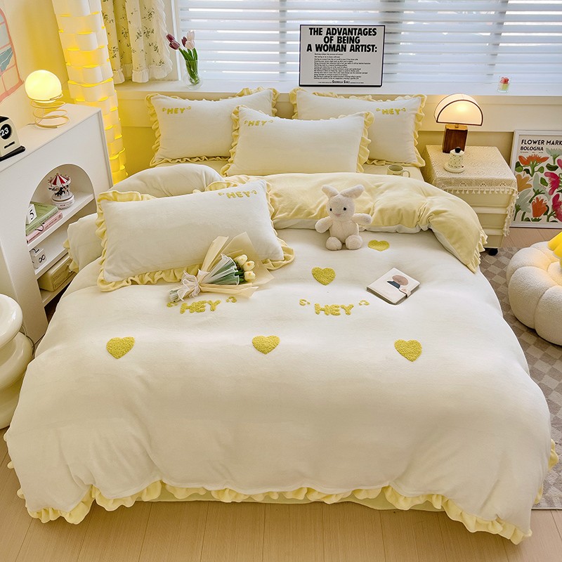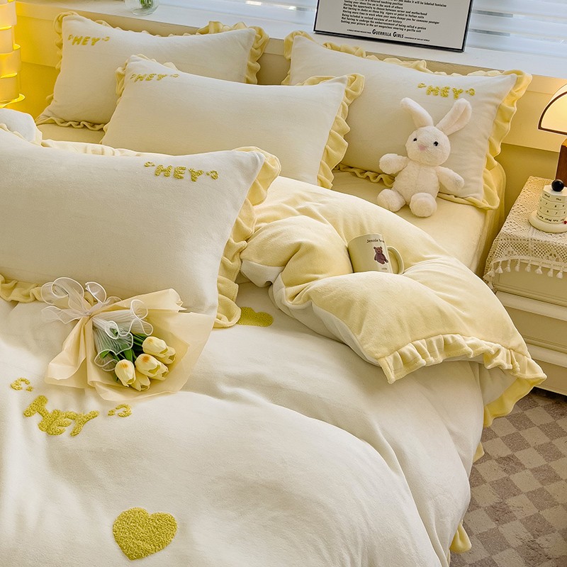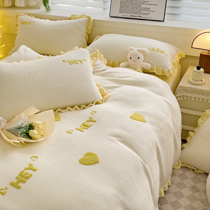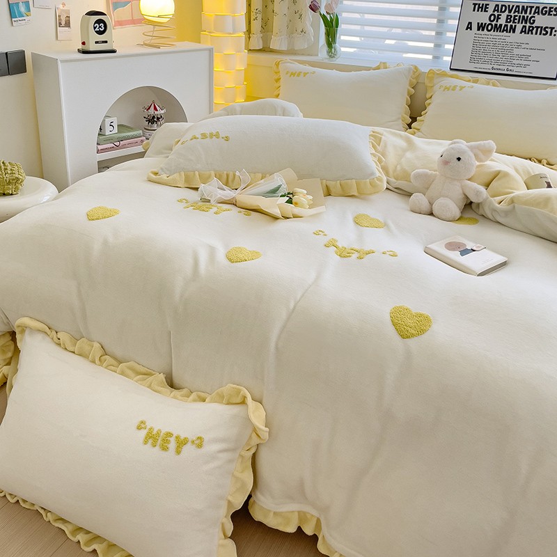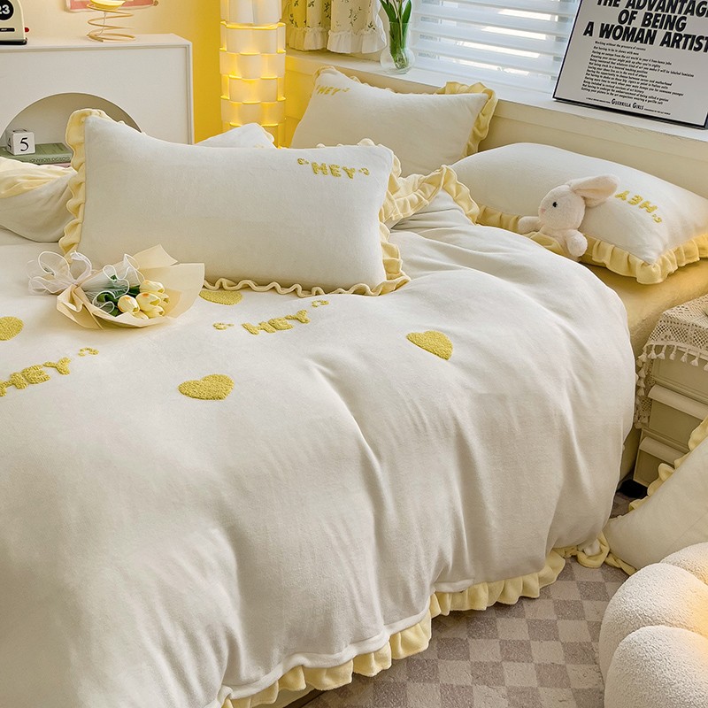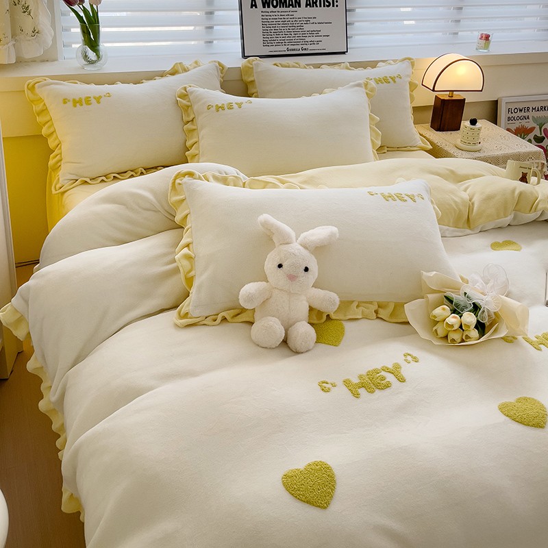 当前位置: 91家纺网 > 商品网购 > 床品套件 > 四件套 > 法莱绒四件套 > 麦朵 2023花边款毛巾绣牛奶绒四件套兔兔绒四件套爱心法莱绒四件套 爱心-白黄