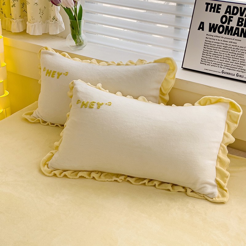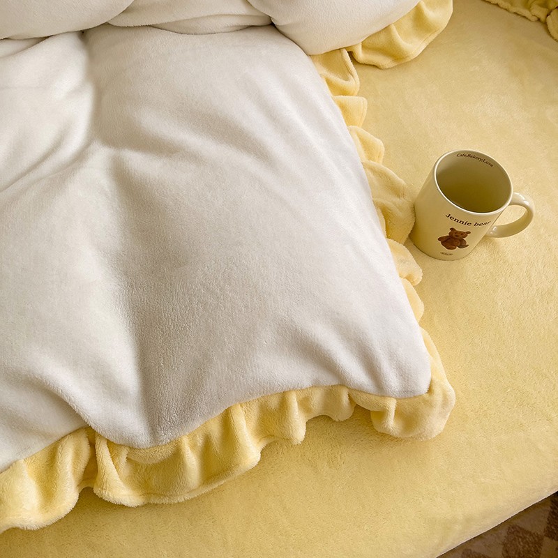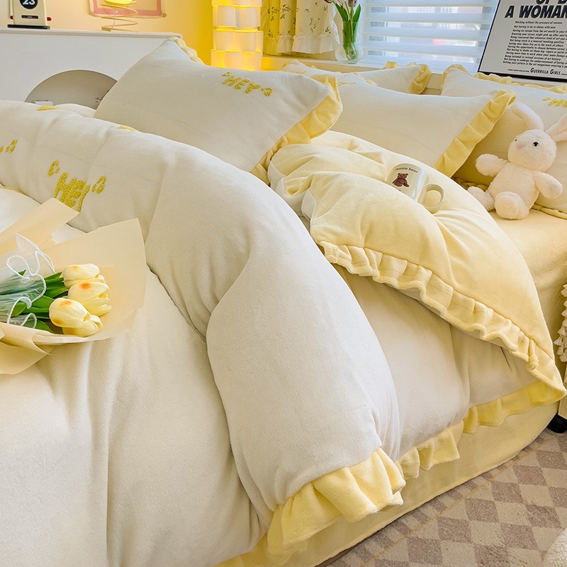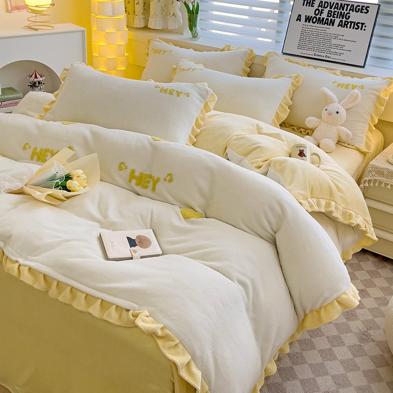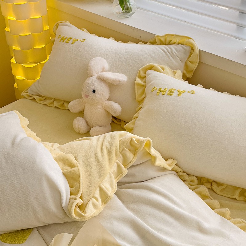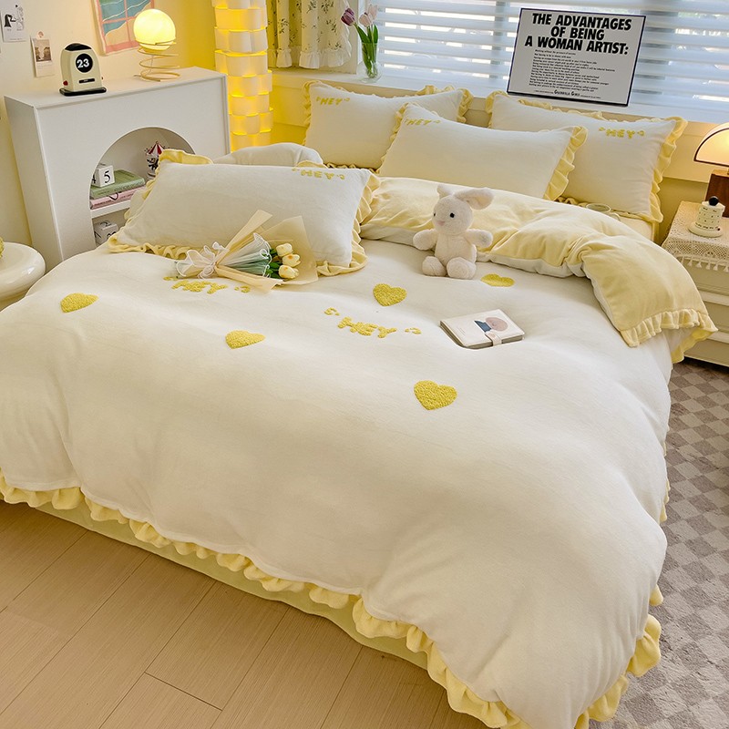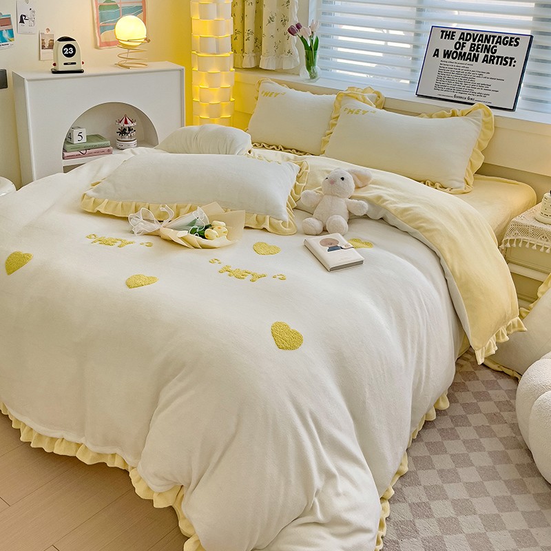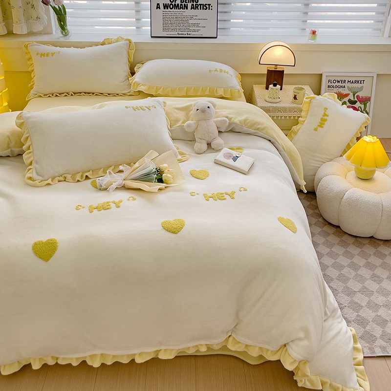 当前位置: 91家纺网 > 商品网购 > 床品套件 > 四件套 > 法莱绒四件套 > 麦朵 2023花边款毛巾绣牛奶绒四件套兔兔绒四件套爱心法莱绒四件套 爱心-白黄