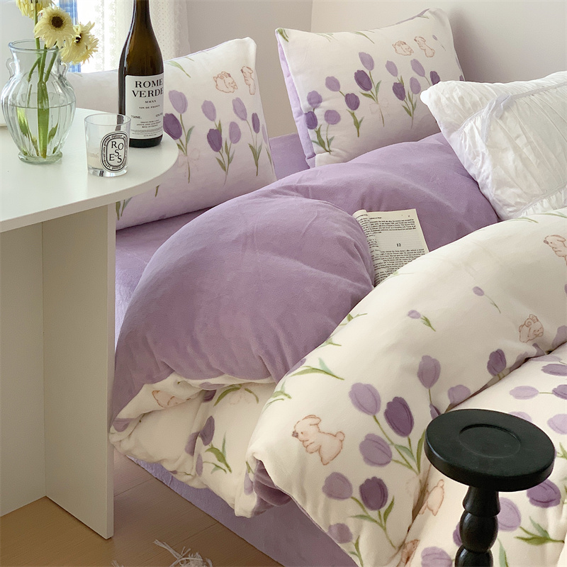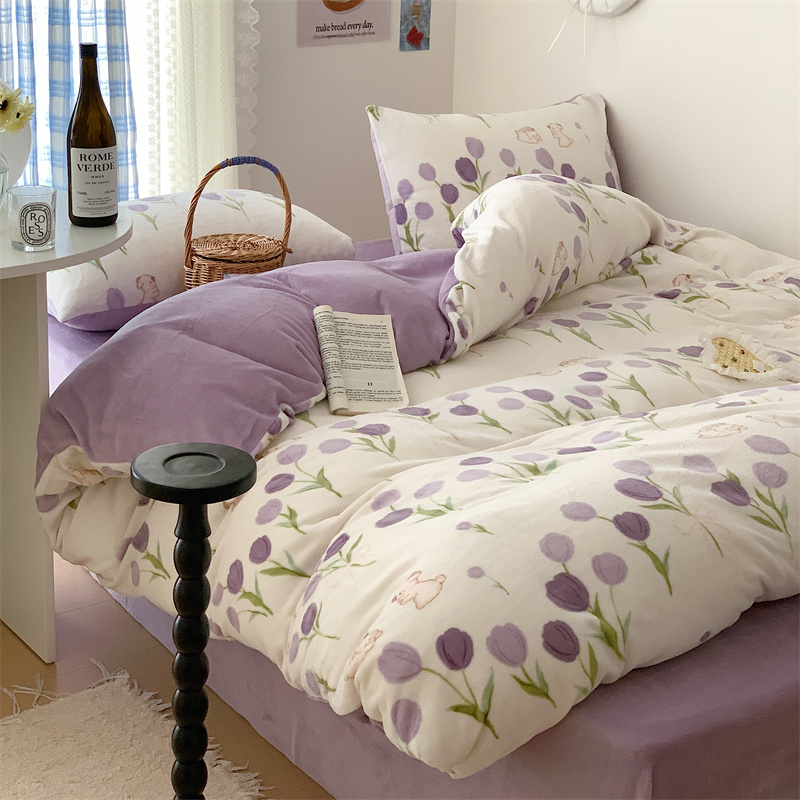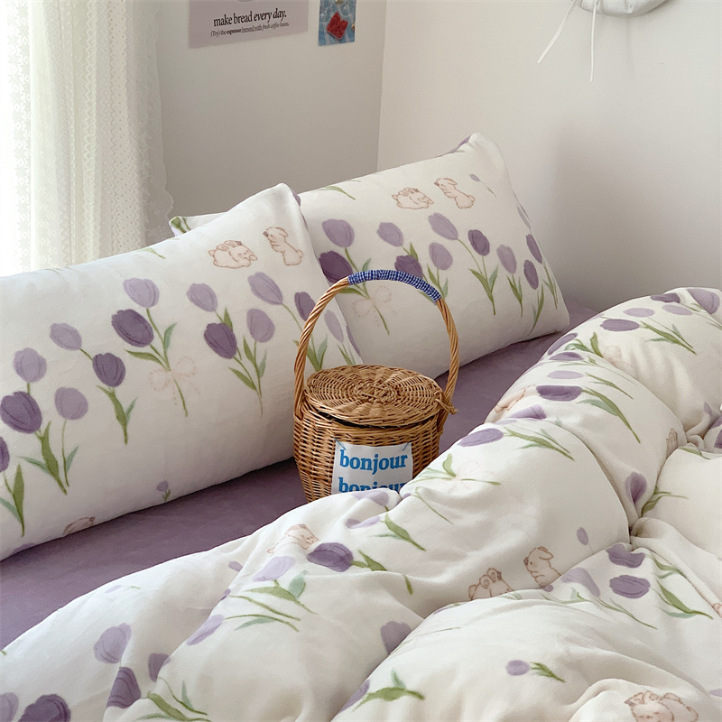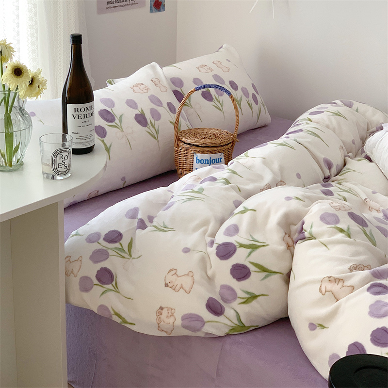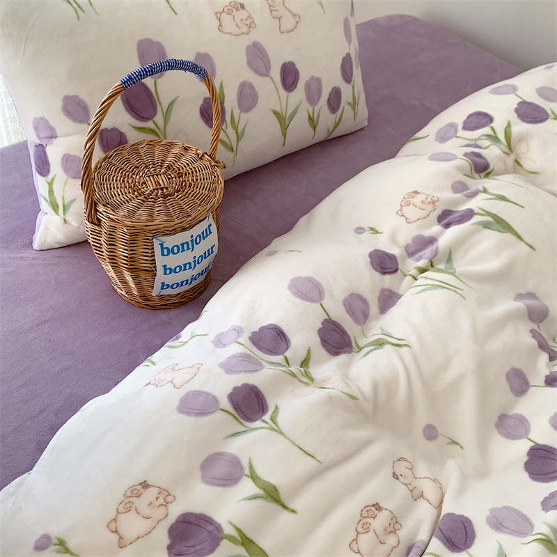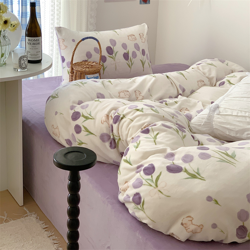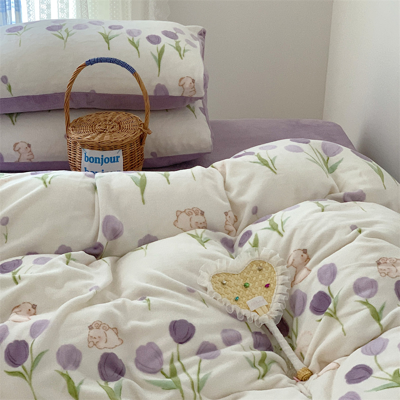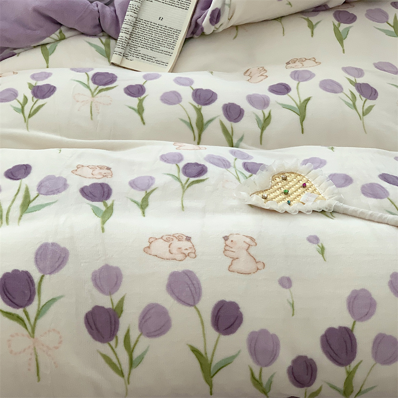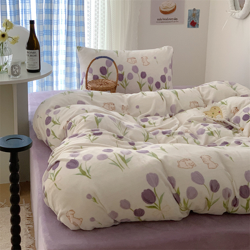 美乐迪家纺 2023秋冬新款保暖牛奶绒四件套 郁金香兔兔