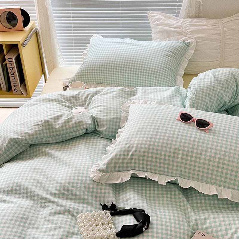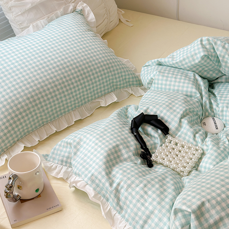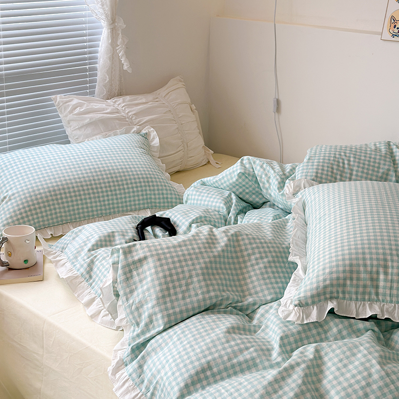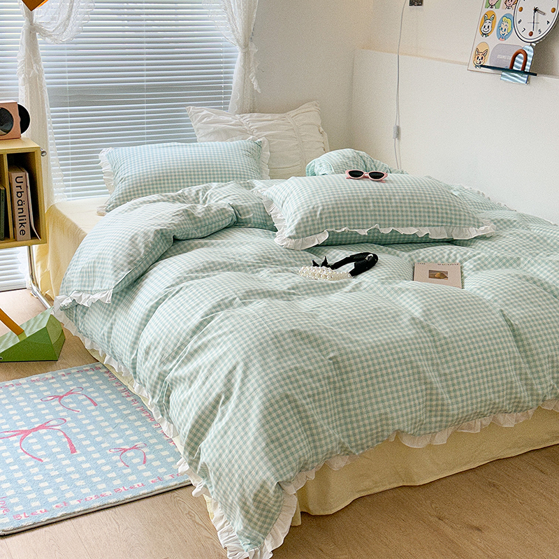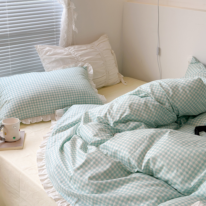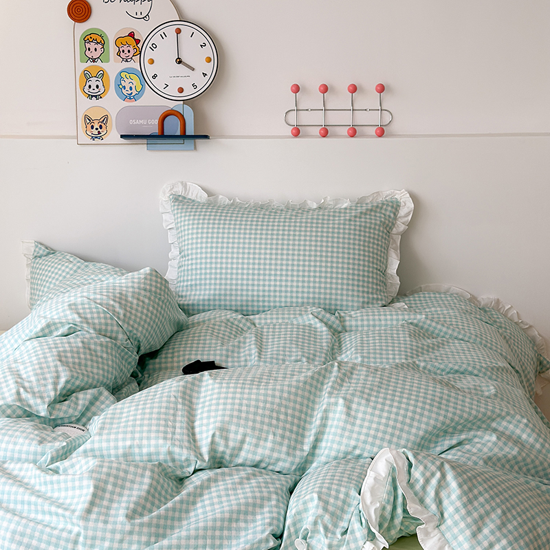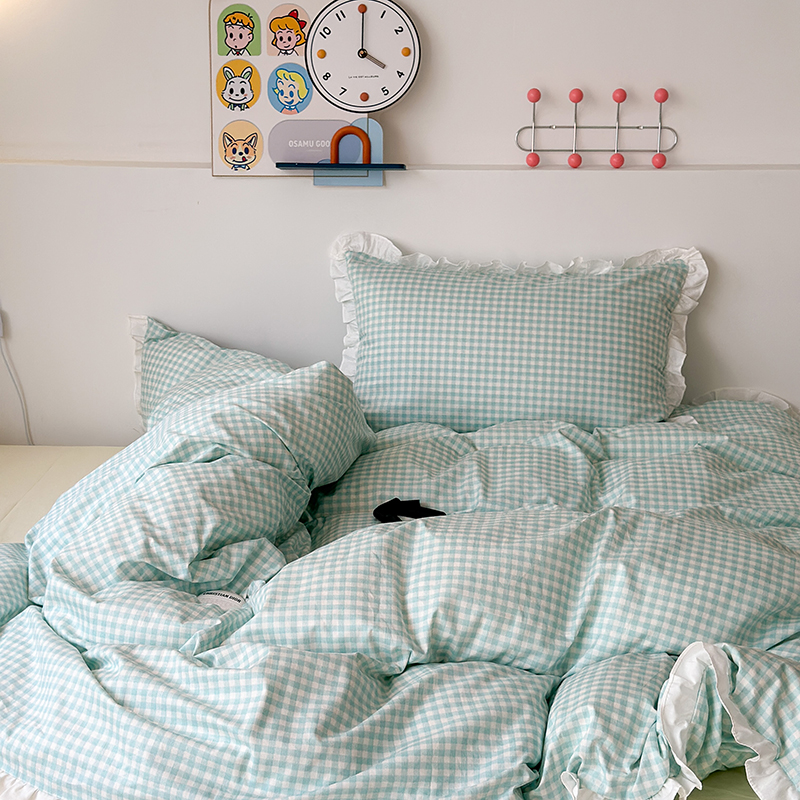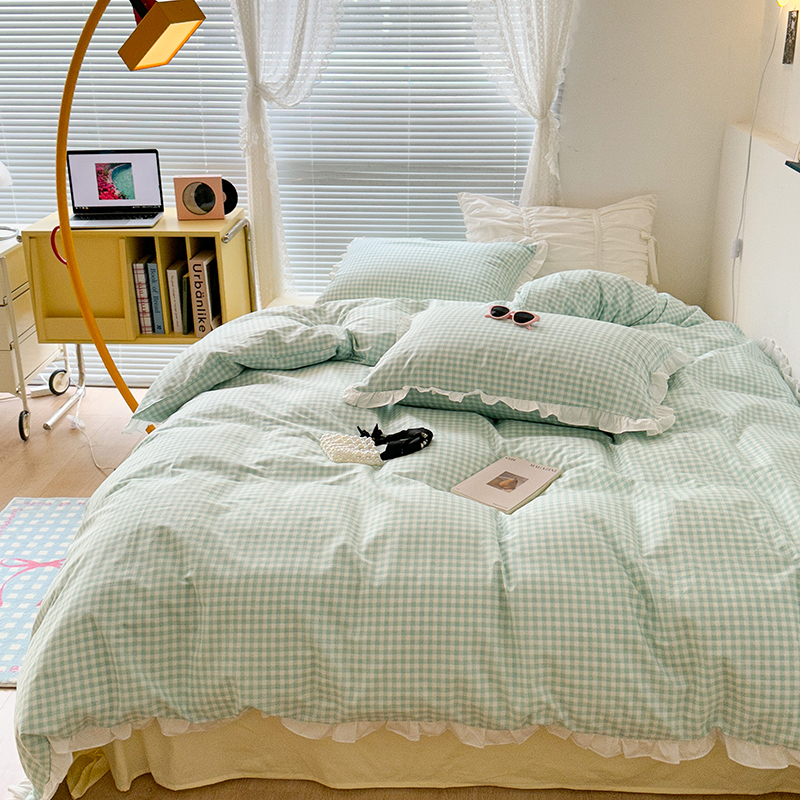 昔可家纺 2023新款全棉花边款小格子四件套 蓝绿格
