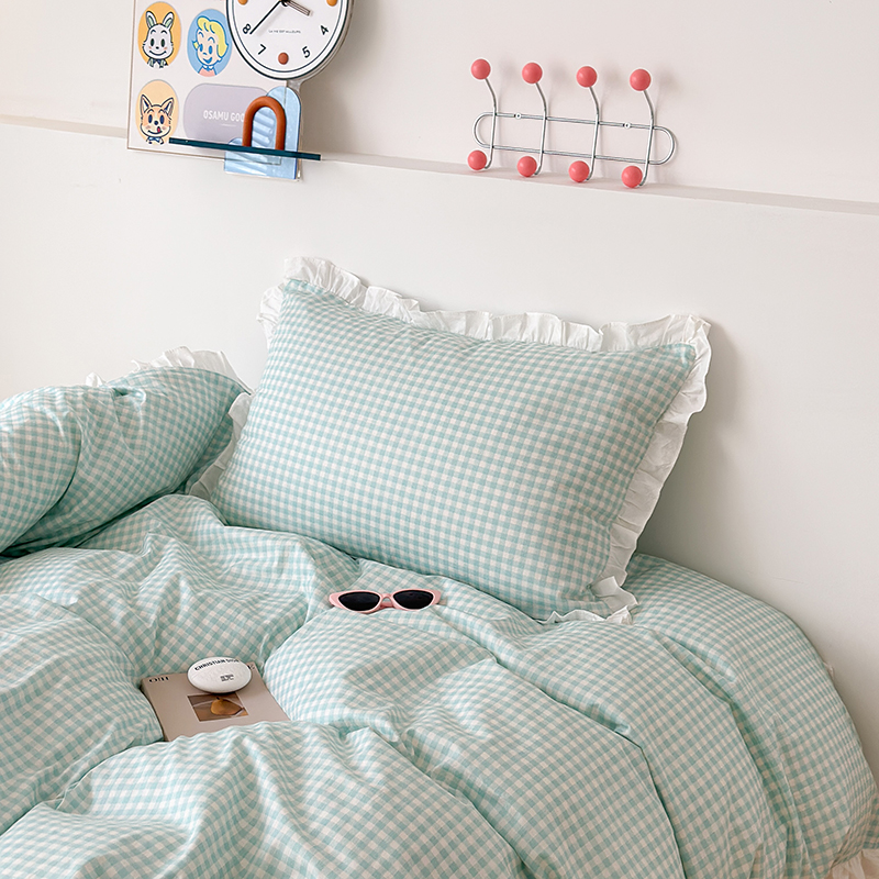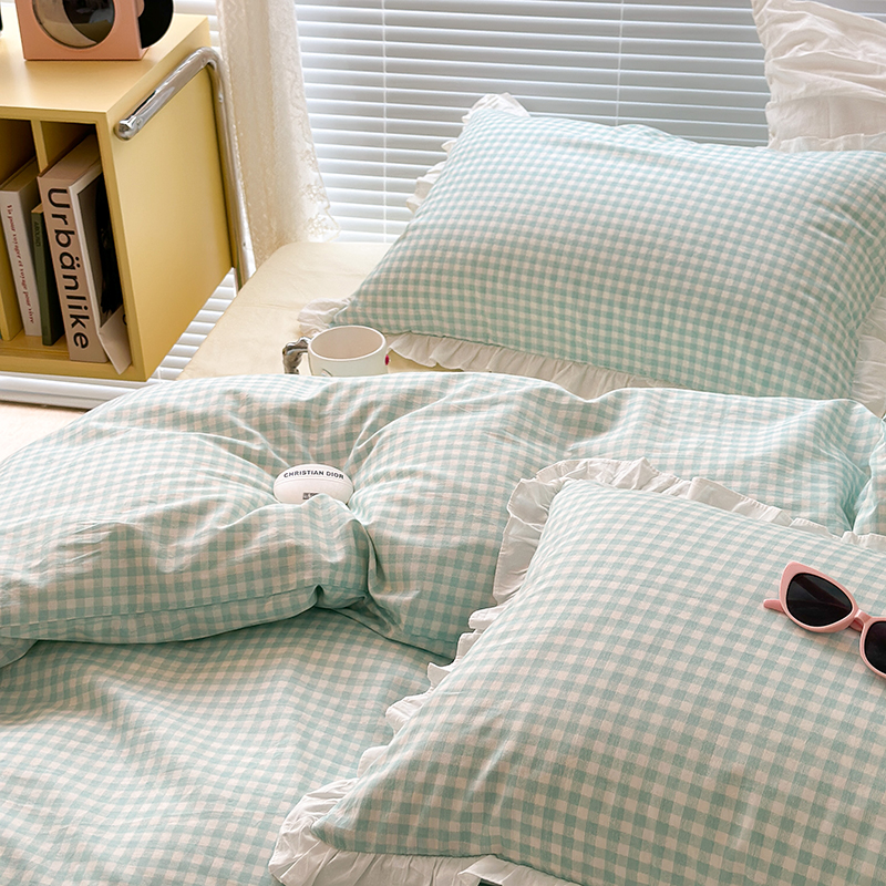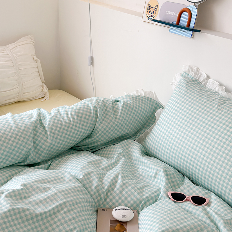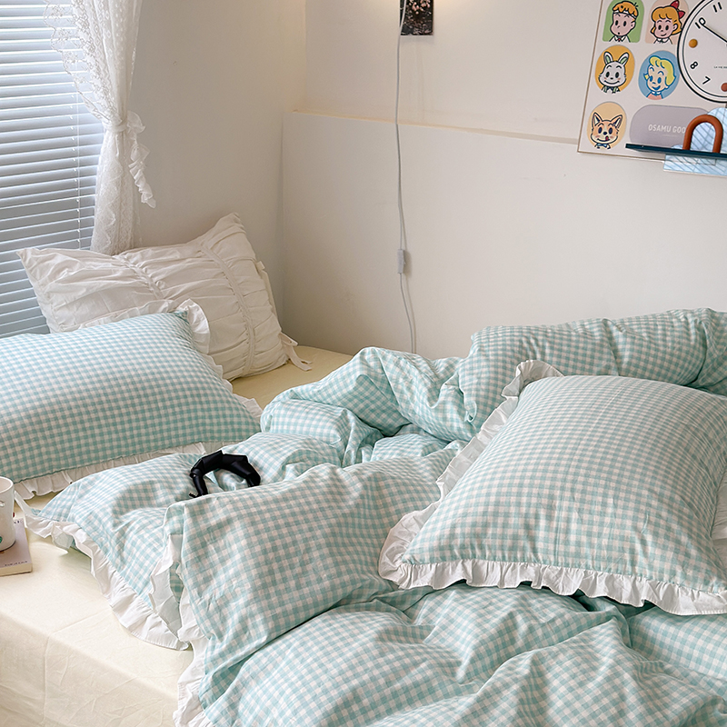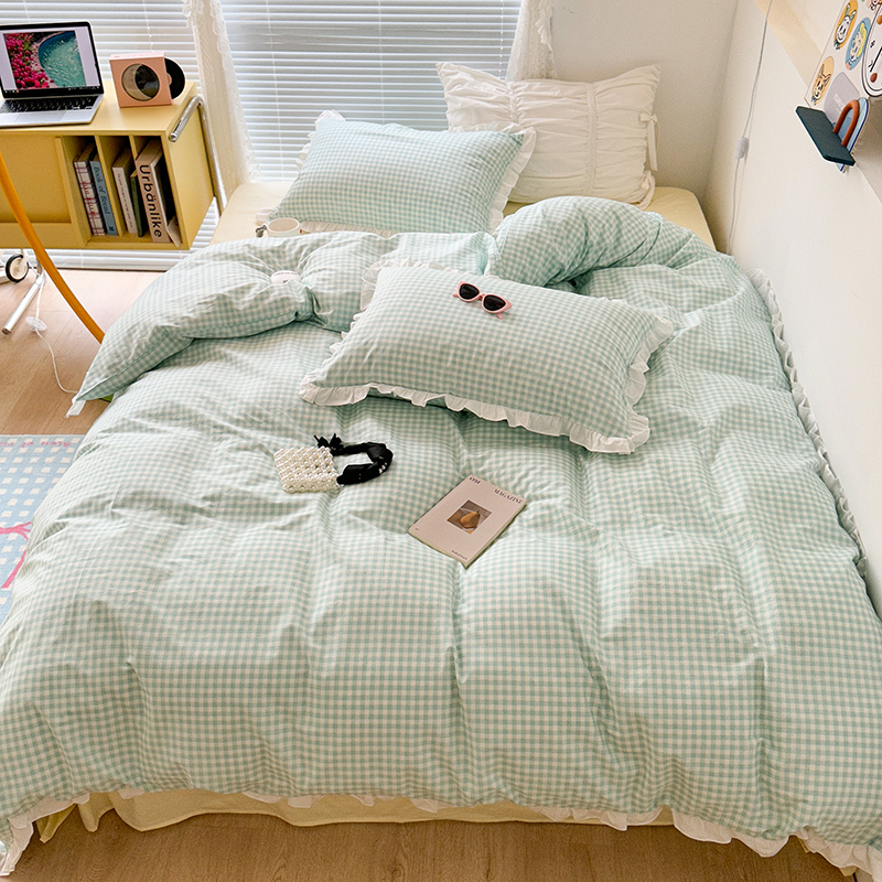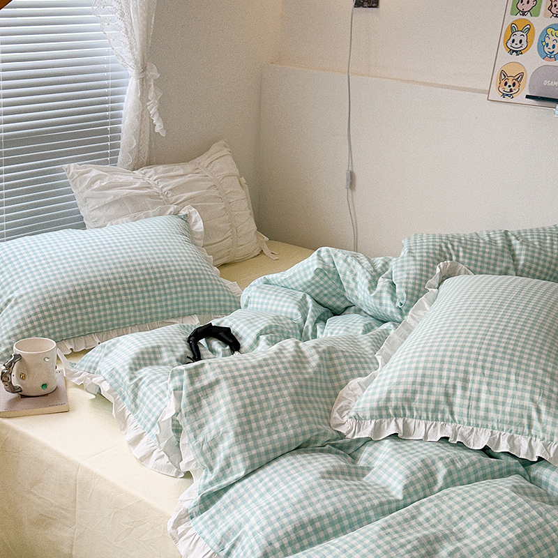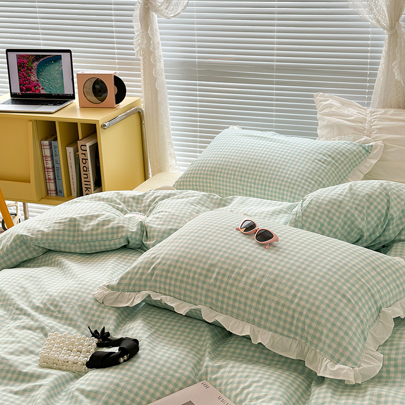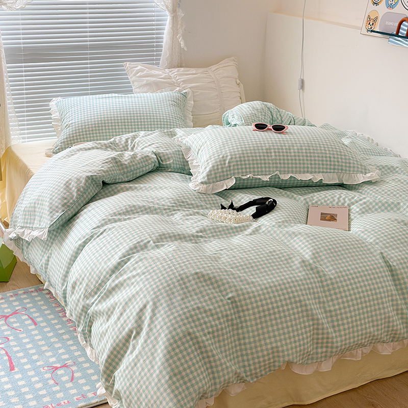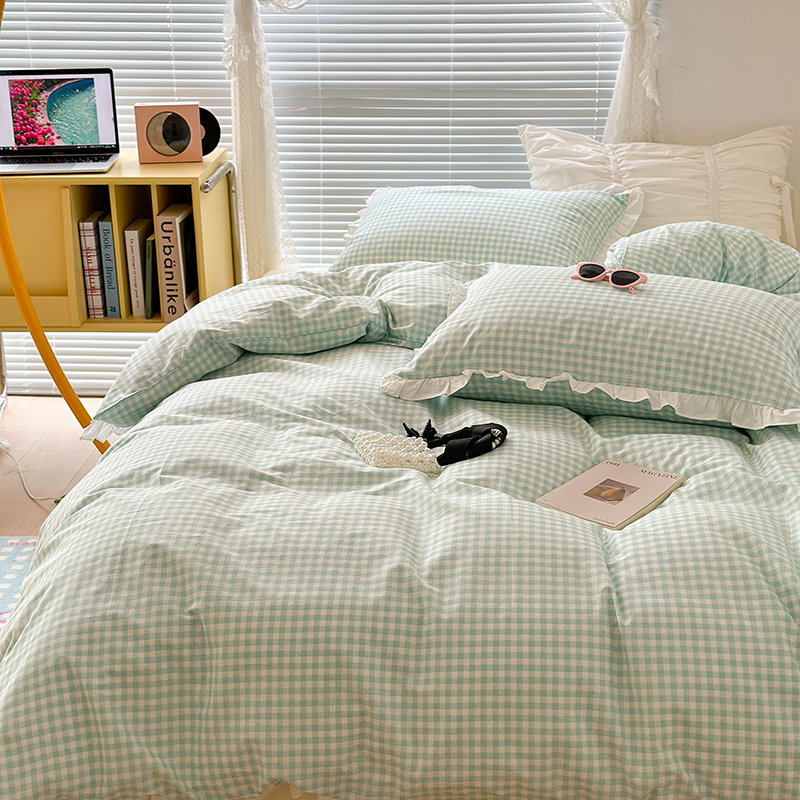 昔可家纺 2023新款全棉花边款小格子四件套 蓝绿格