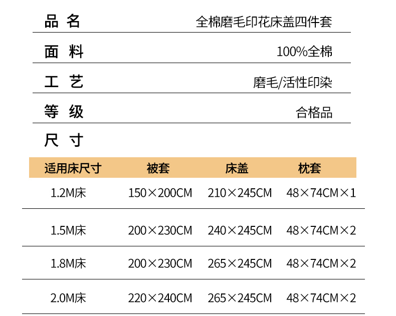 床盖210*245 被套150*200 枕套48*74*1(适用1.2床)