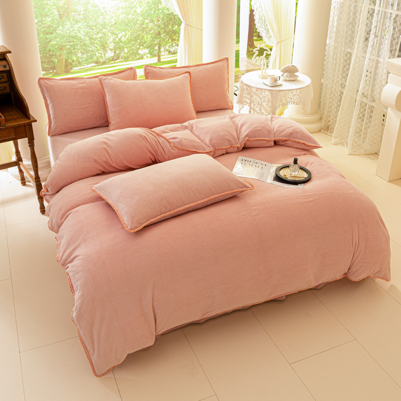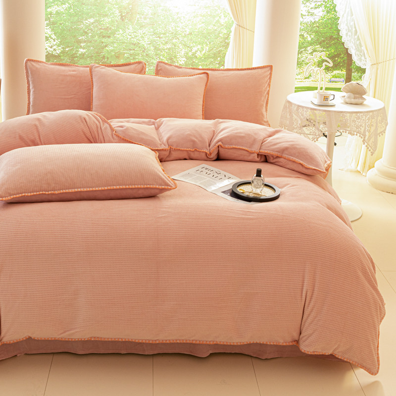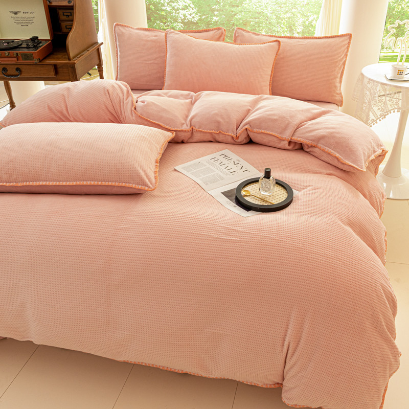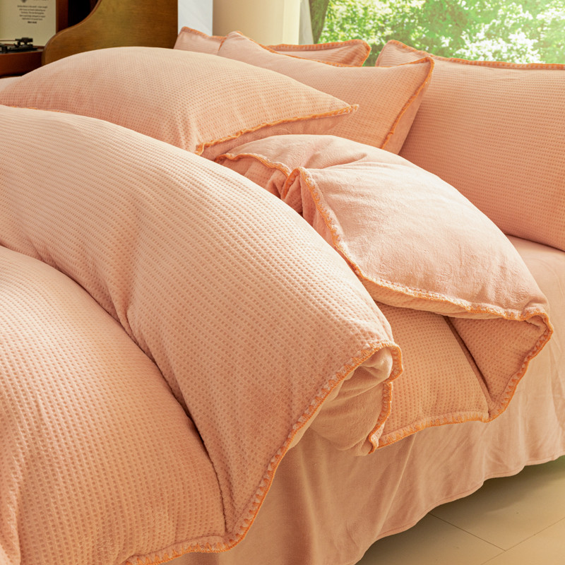 商品名称:邦妮 2024新款华夫格牛奶绒贝壳边四件套 华夫格-豆沙