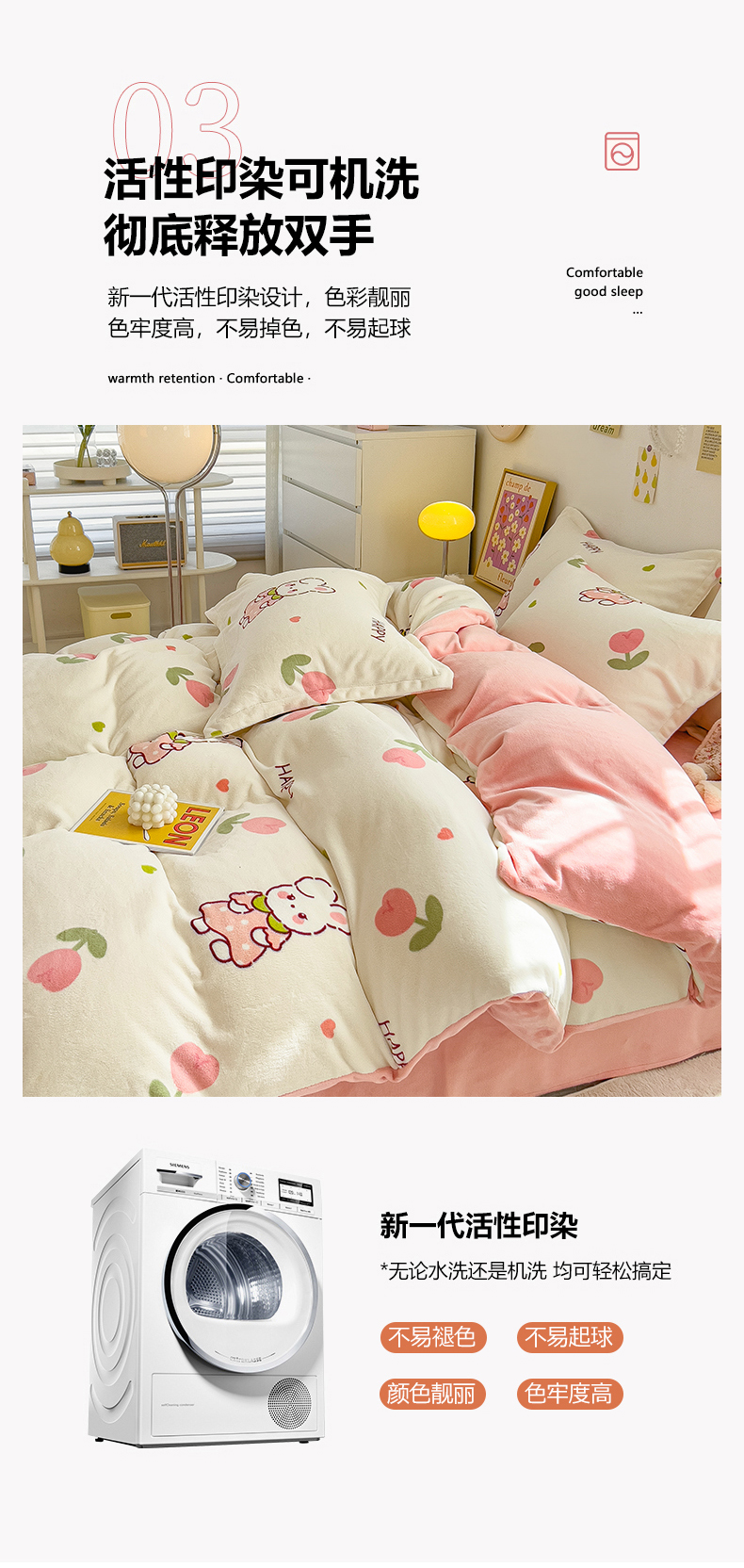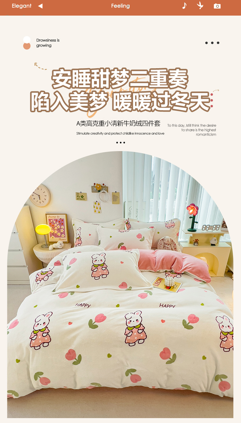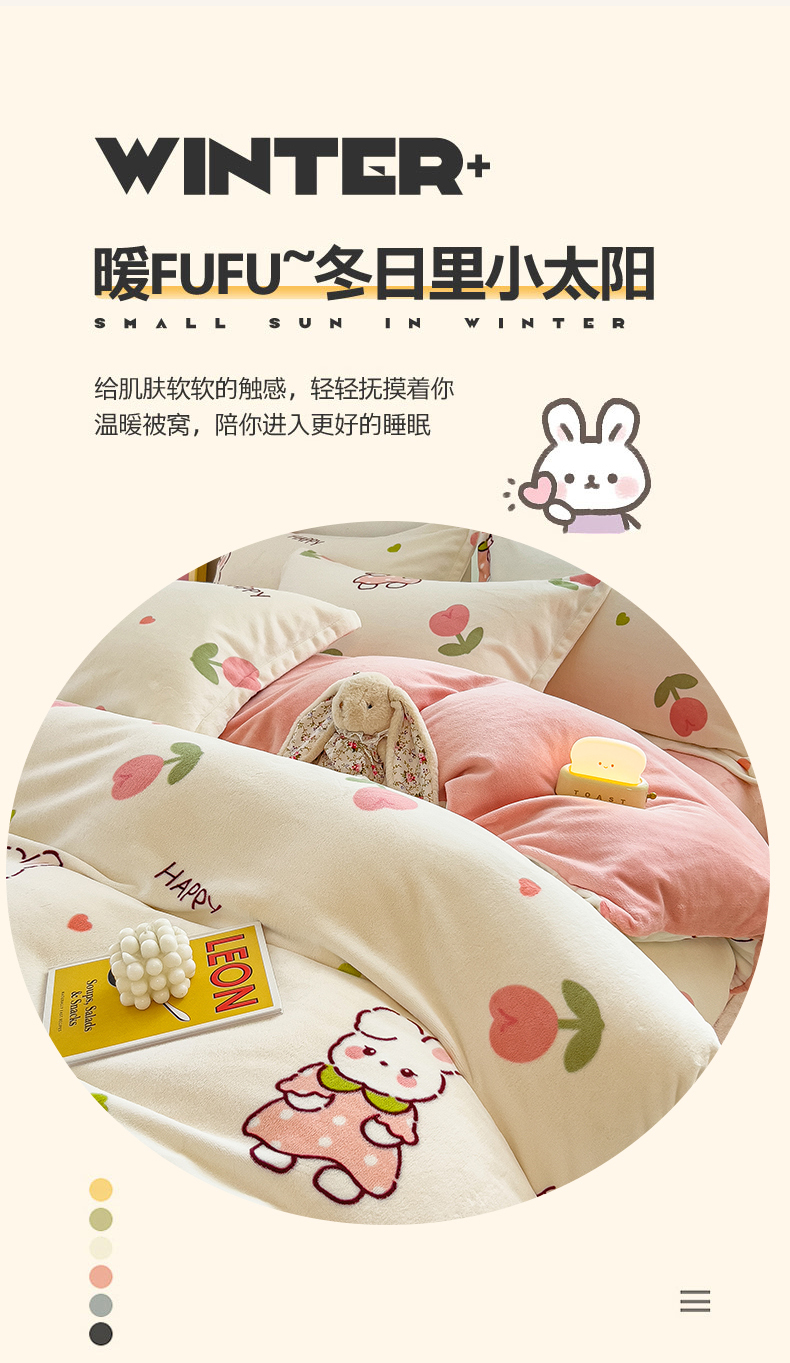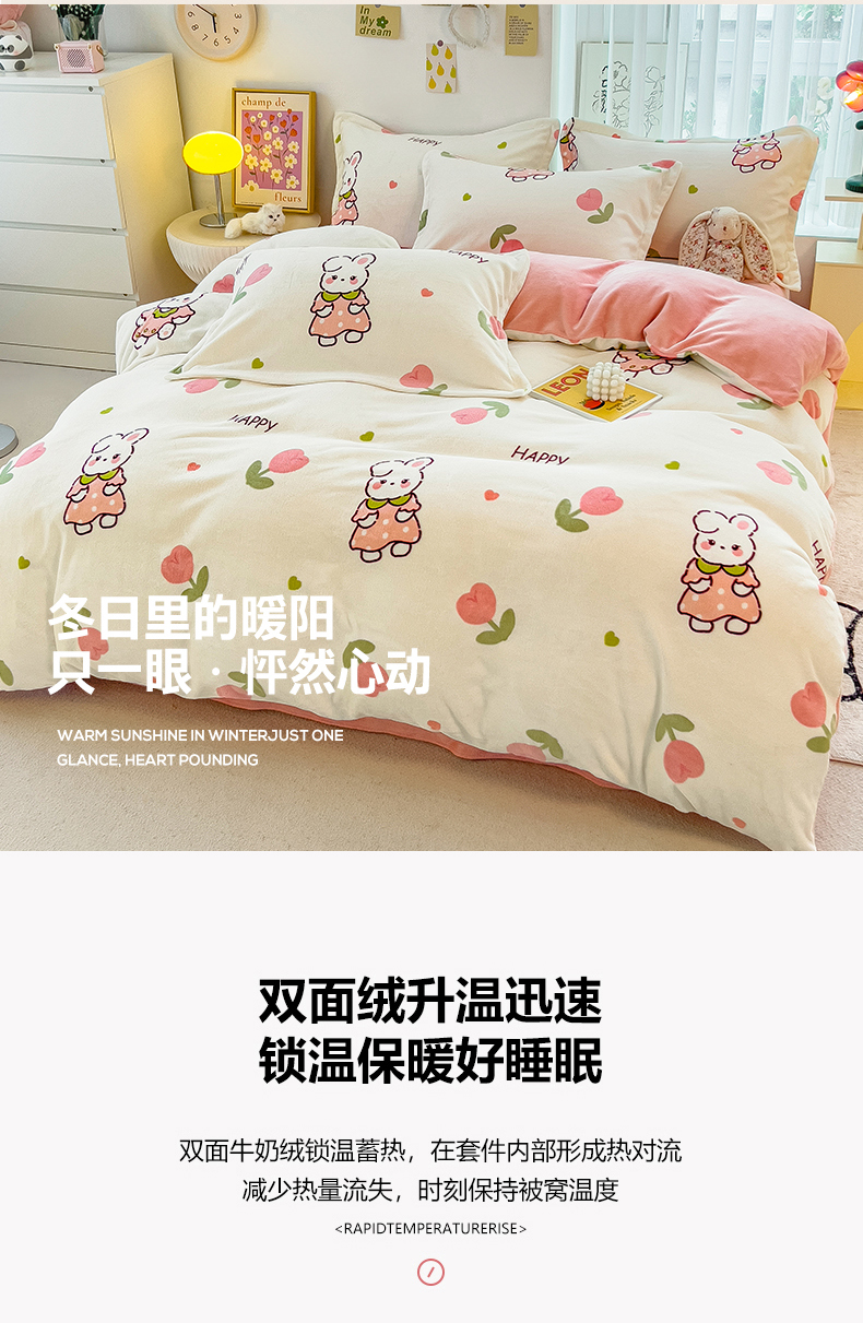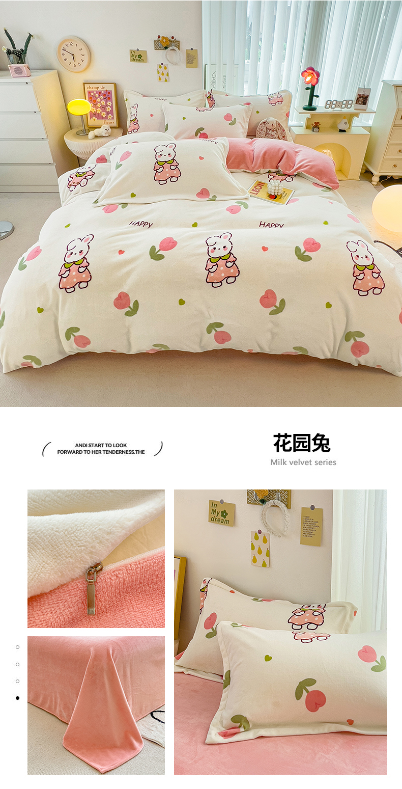 商品名称:全季家居2023新款小清新A类高克重加厚印花牛奶绒四件套 花园兔