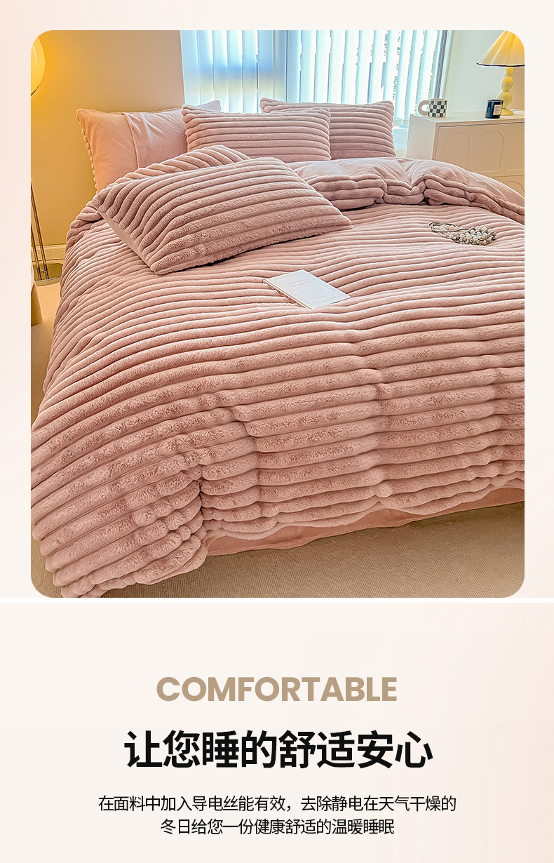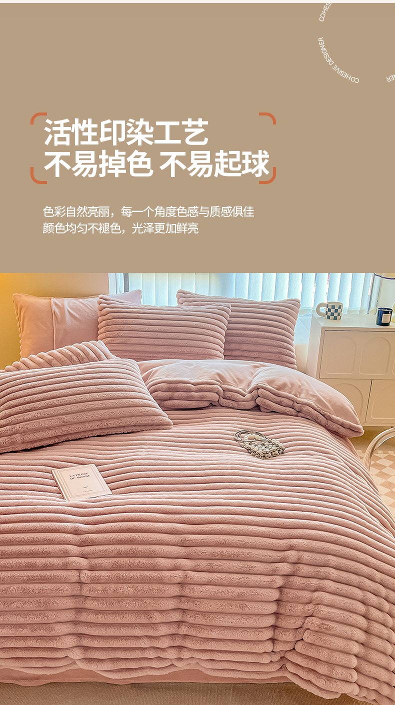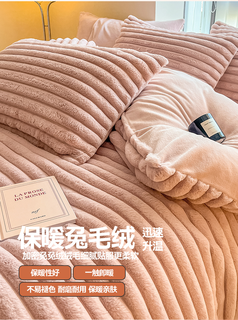 当前位置: 91家纺网 > 商品网购 > 床品套件 > 四件套 > 兔毛绒四件套 > 慕尚家纺 2025新款抽条兔毛四件套 安雅-豆沙