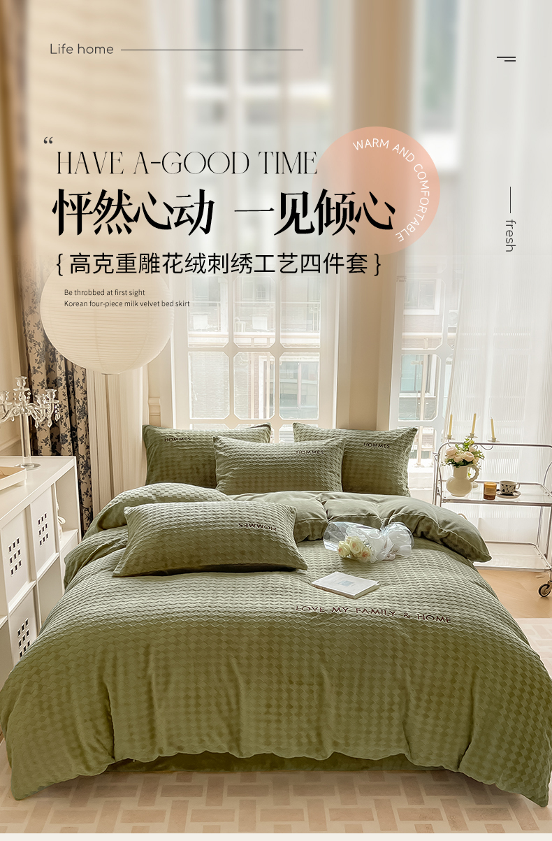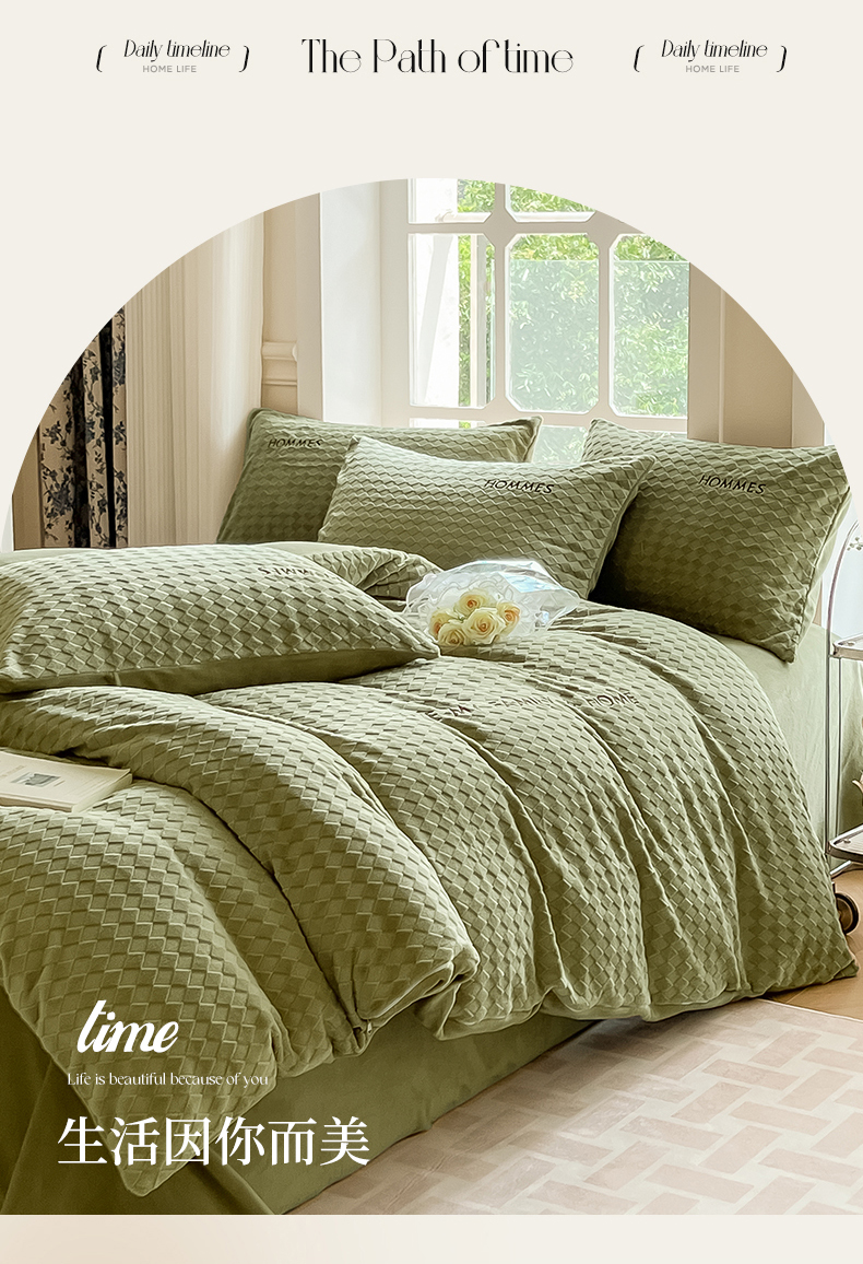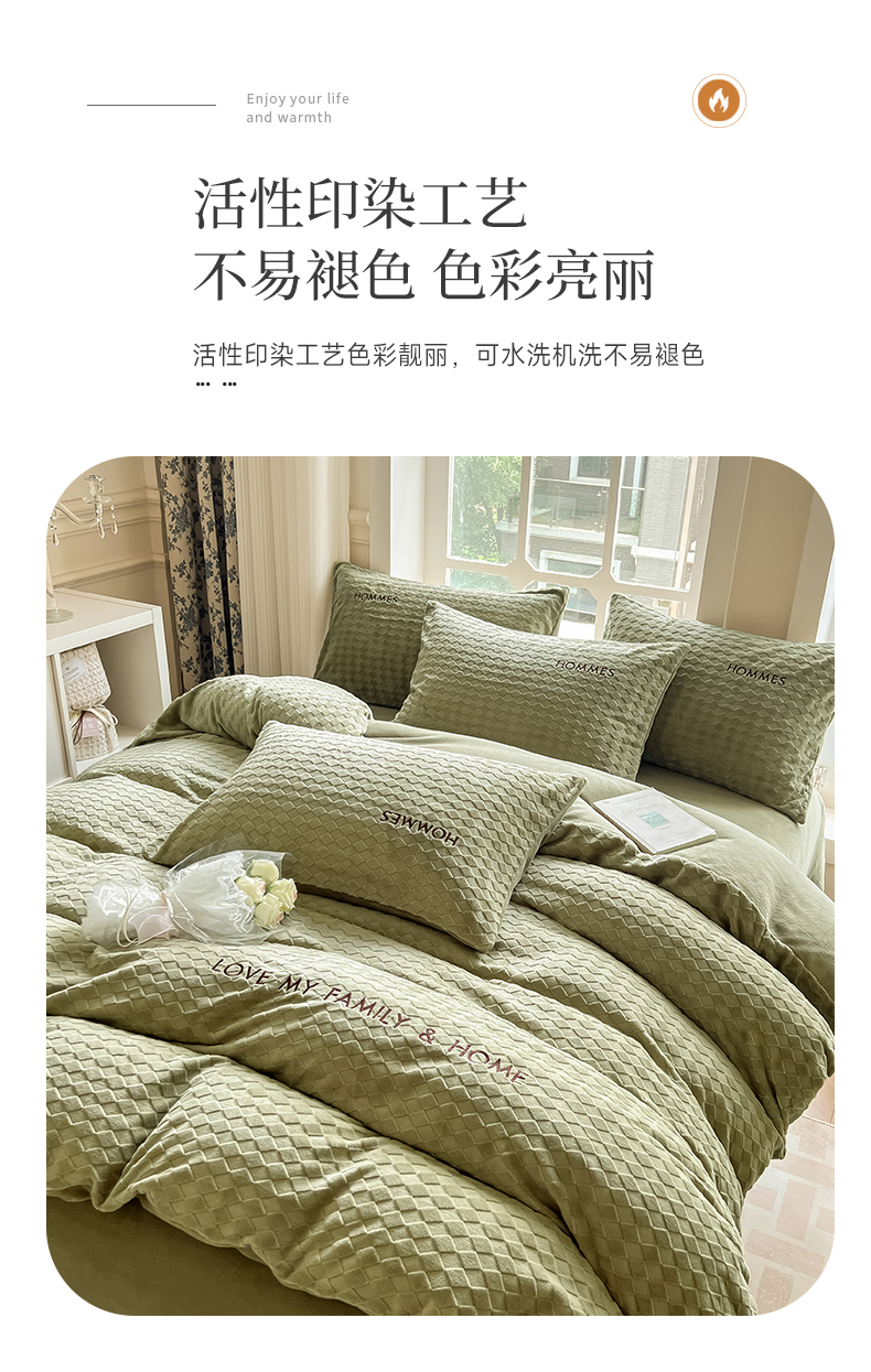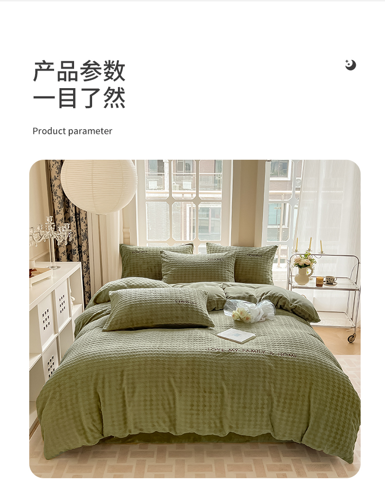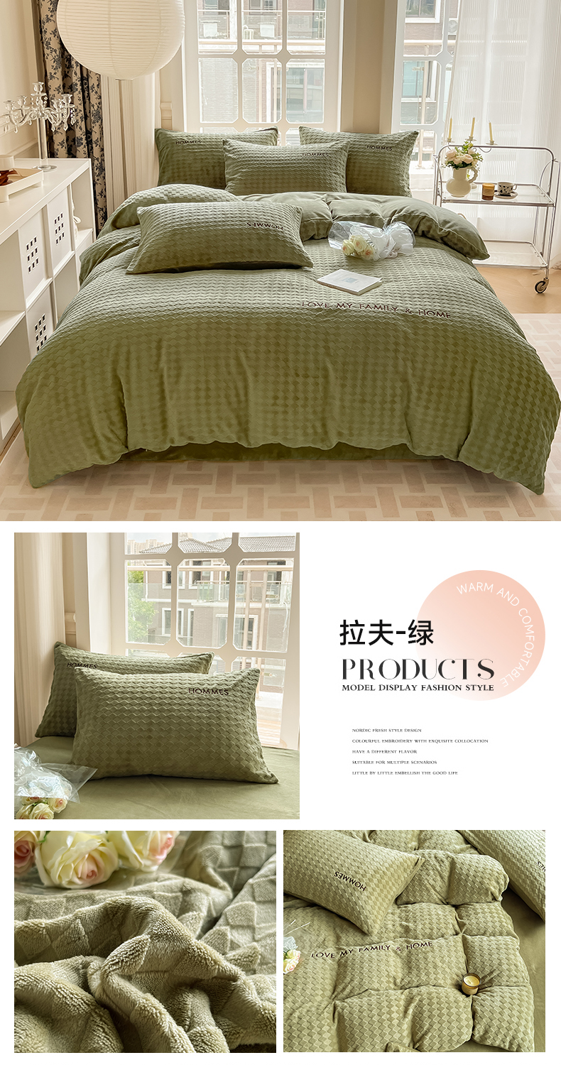 当前位置: 91家纺网 > 商品网购 > 床品套件 > 四件套 > 雕花绒四件套 > 慕尚家纺 2025高克重雕花绒刺绣工艺四件套 拉夫-绿