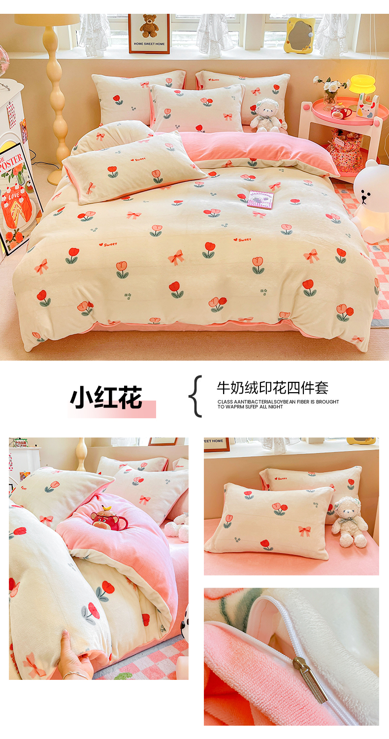 商品名称:沐辰 2023新款牛奶绒印花四件套 小红花