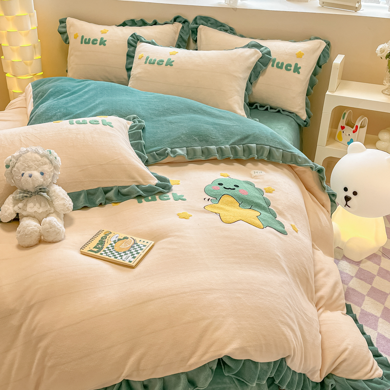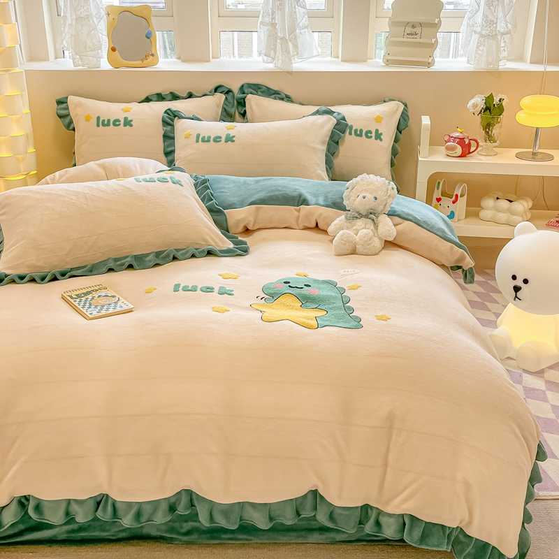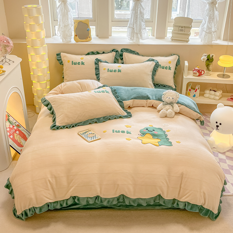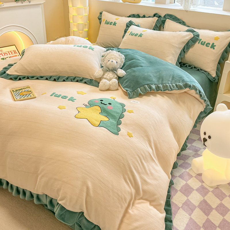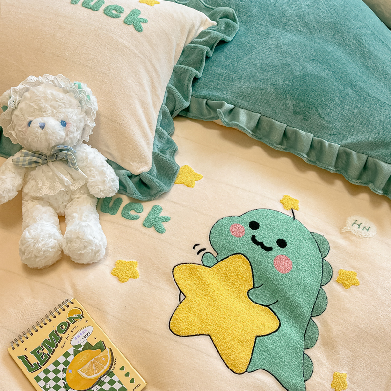 沐辰 2023新款韩版绣花加厚牛奶绒四套件 星星恐龙