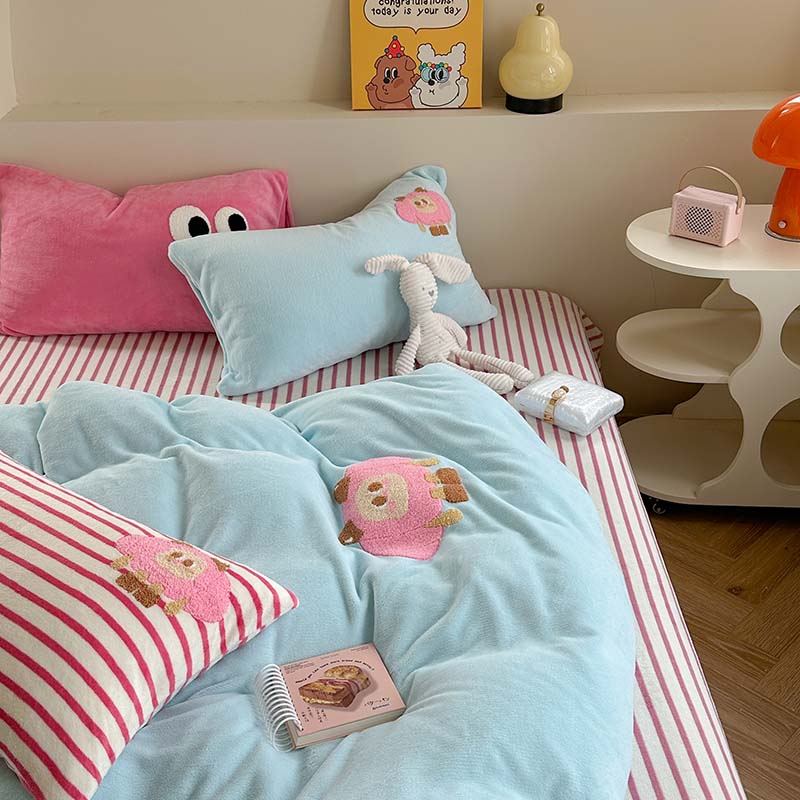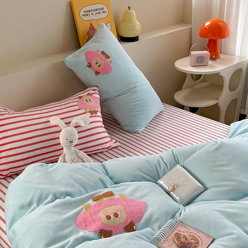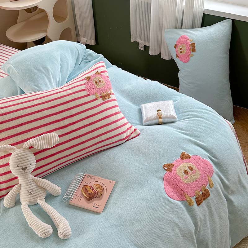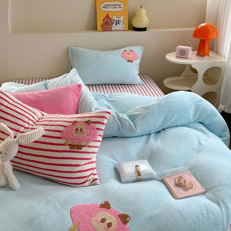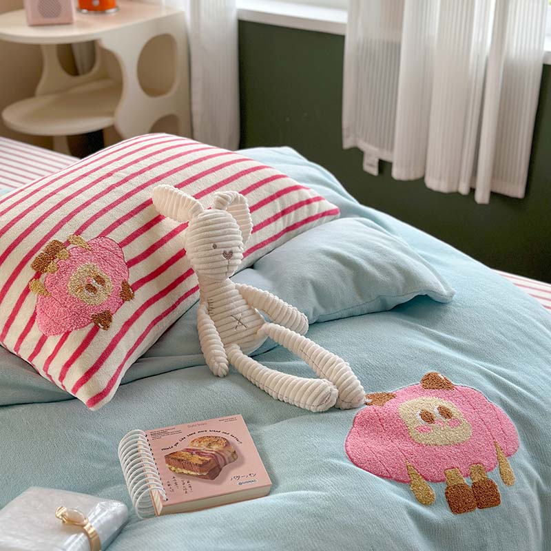 柚子 2023新款高克重牛奶绒多巴胺条纹毛巾绣四件套 可爱多