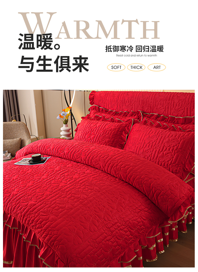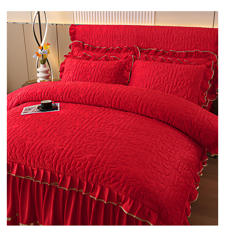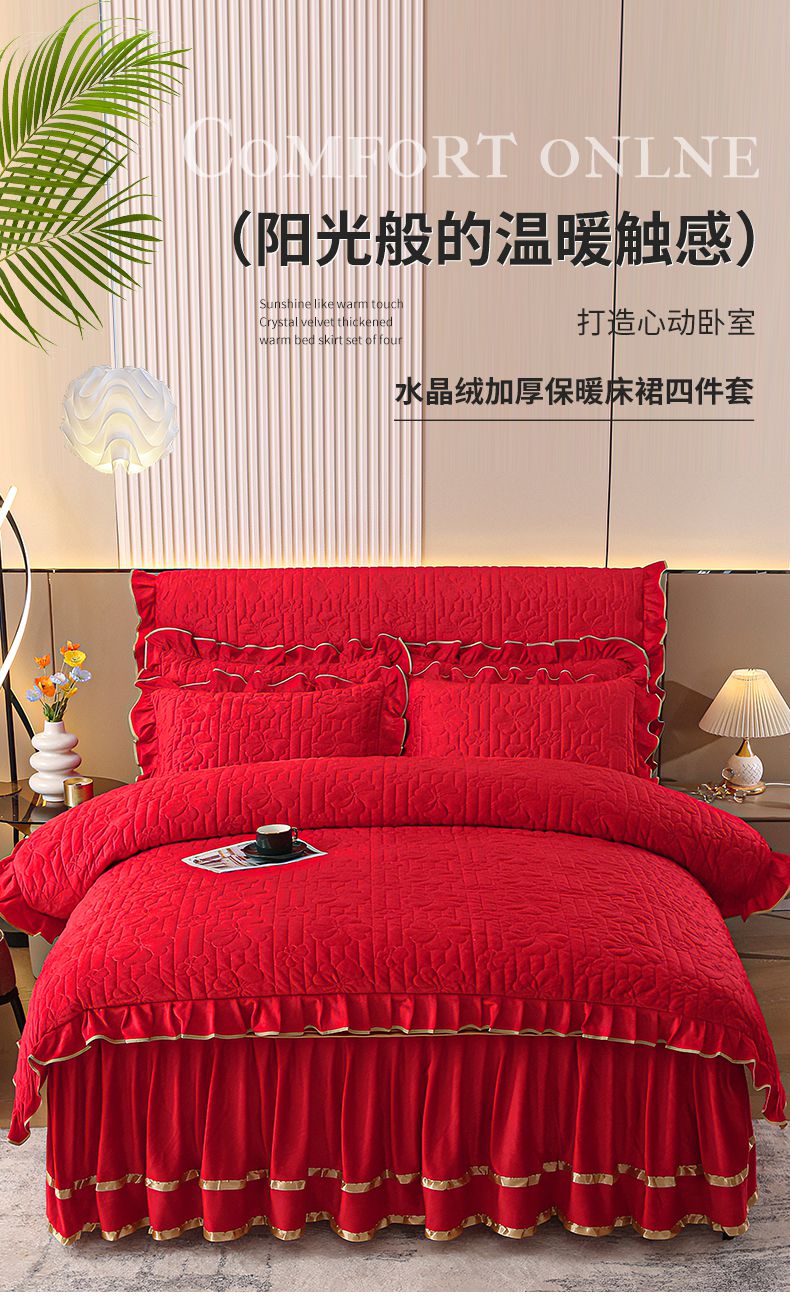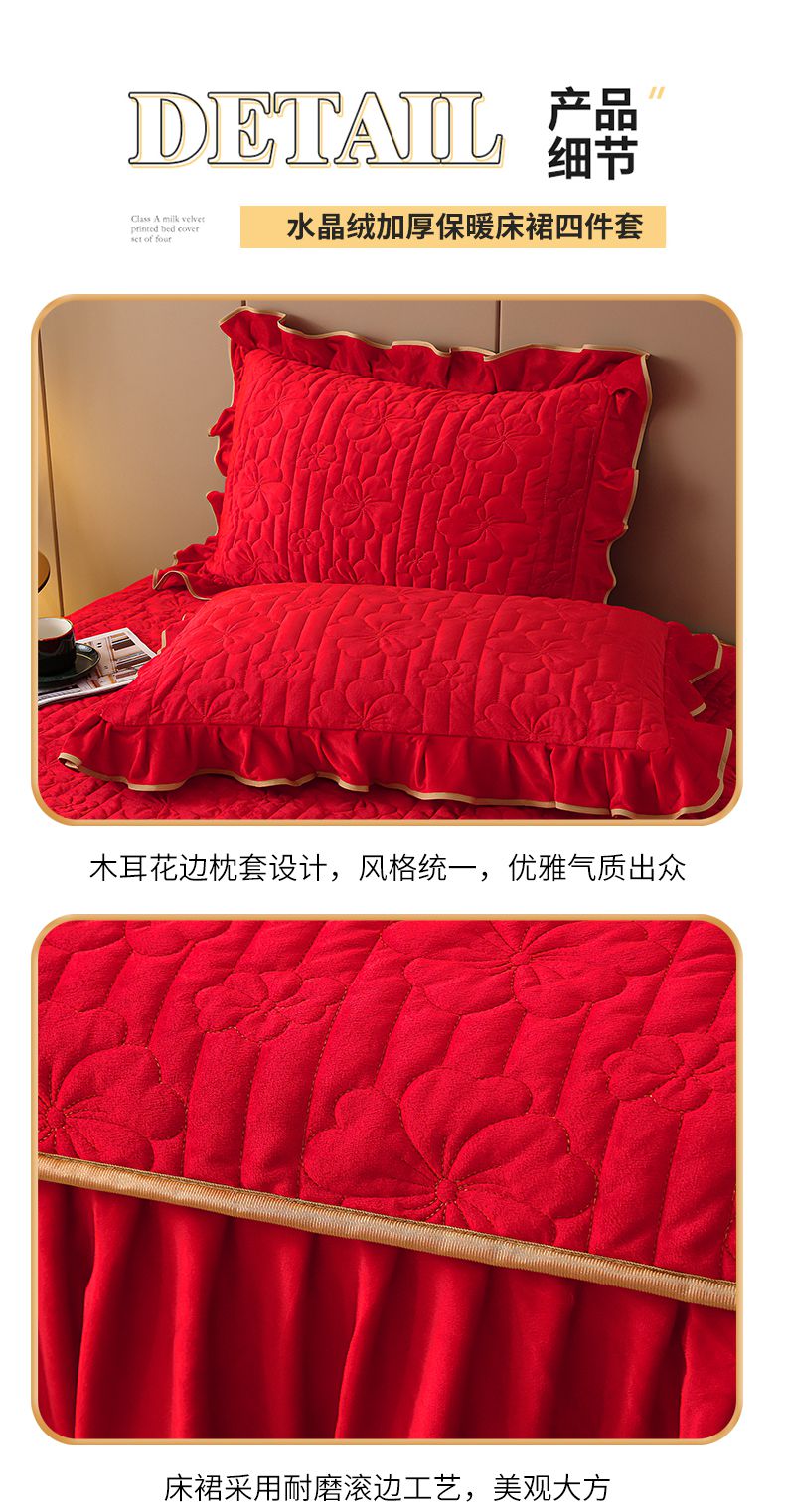 (总)屹成家纺2025新款水晶绒夹棉绗缝床裙四件套(塞纳河畔)四件套起售价不低于230元,大红,豆沙,翡翠绿,粉玉,橄榄绿,蔚蓝,银灰