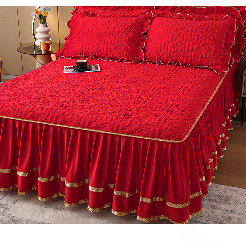 (总)屹成家纺2025新款水晶绒夹棉绗缝蕾丝床裙三件套(塞纳河畔)床裙单件起售价不低于105元,大红,豆沙,翡翠绿,粉玉,橄榄绿,蔚蓝,银灰