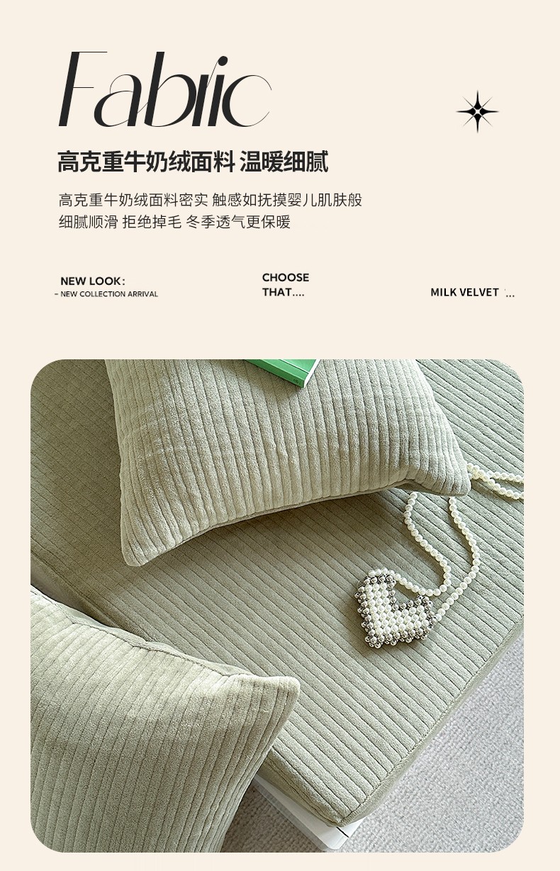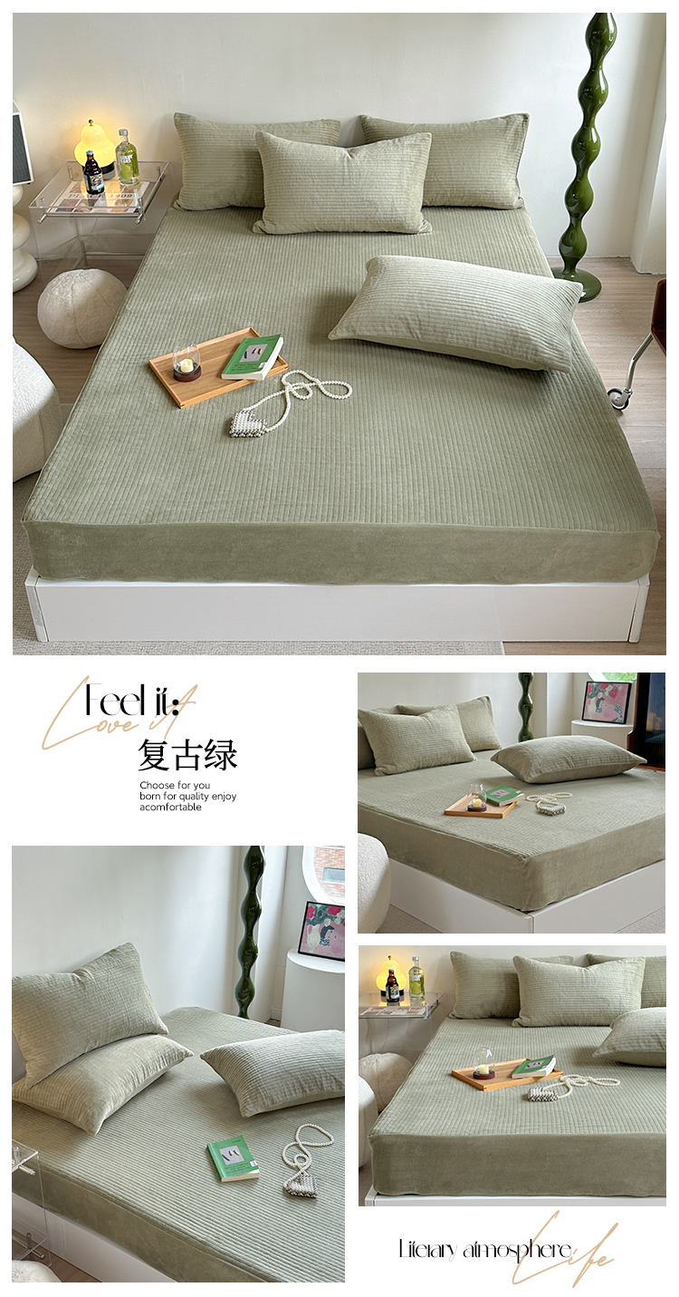 商品名称:漫调 2023新款直条绗缝牛奶绒纯色夹棉床笠 复古绿