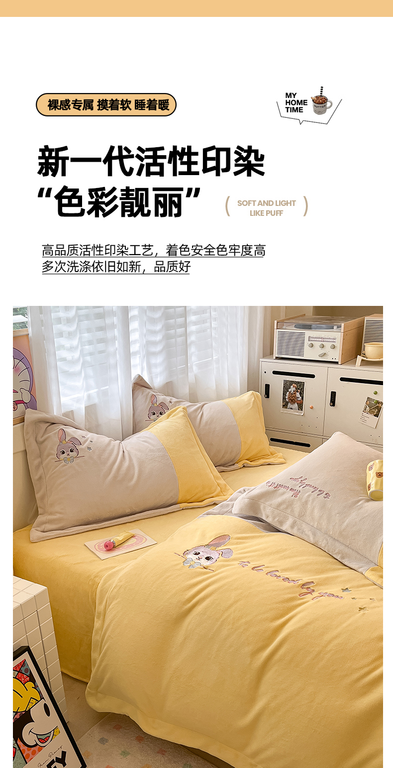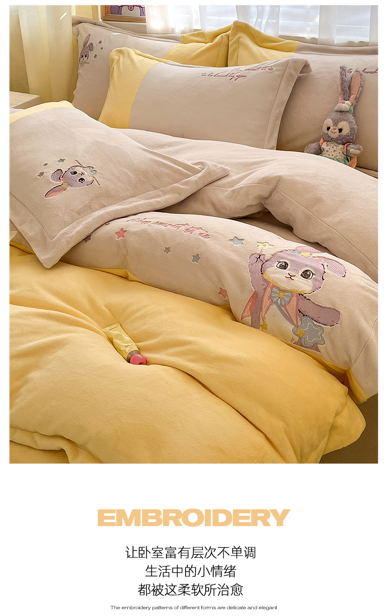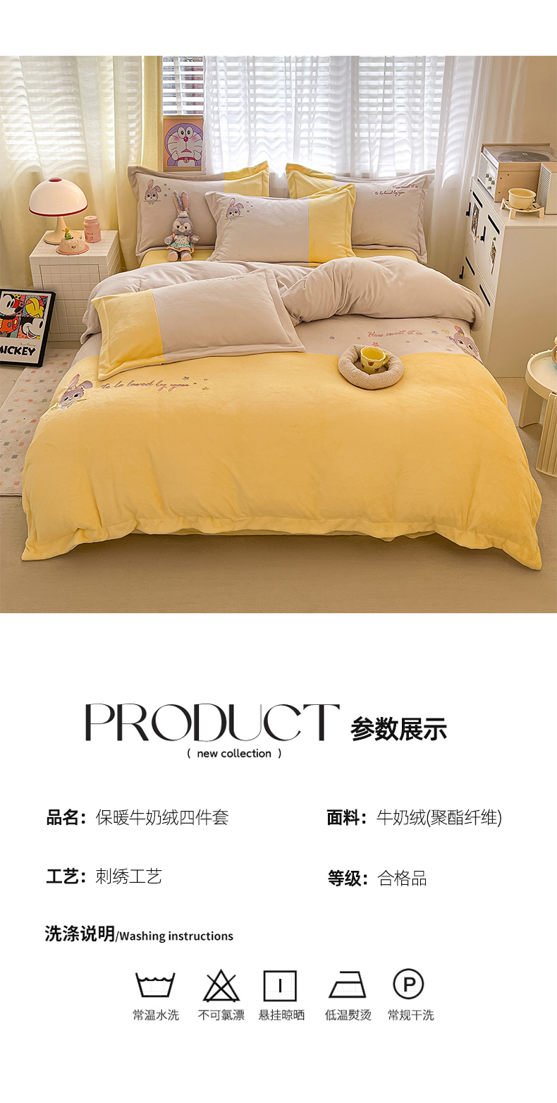 当前位置: 91家纺网 > 商品网购 > 床品套件 > 四件套 > 牛奶绒四件套 > 爱上家居 2023新款保暖加厚卡通刺绣牛奶绒四件套 兔眠-奶油黄拼咖
