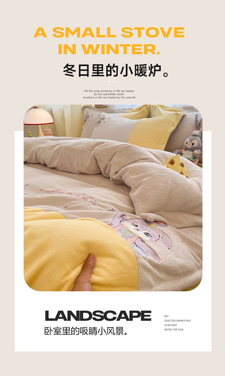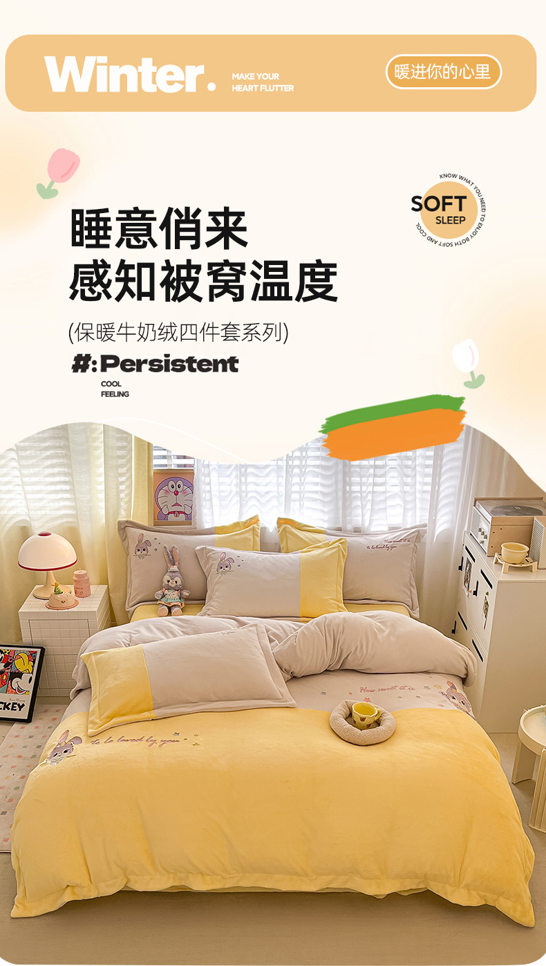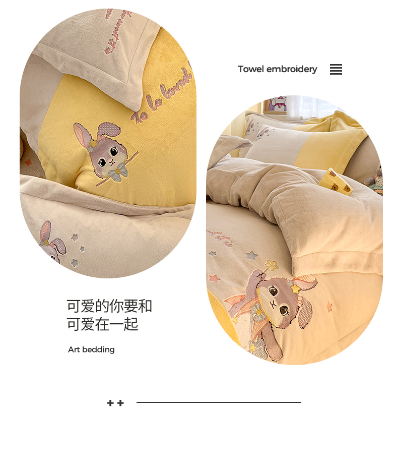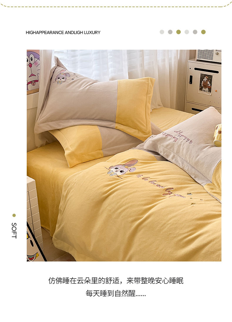 当前位置: 91家纺网 > 商品网购 > 床品套件 > 四件套 > 牛奶绒四件套 > 爱上家居 2023新款保暖加厚卡通刺绣牛奶绒四件套 兔眠-奶油黄拼咖