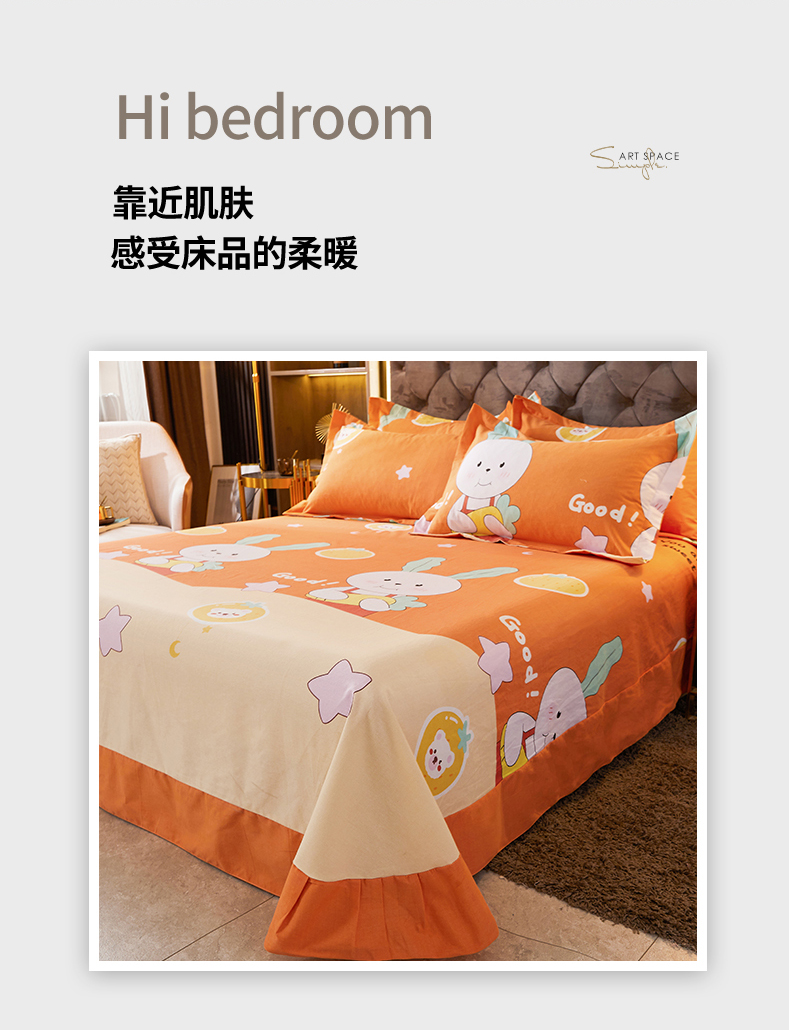 当前位置: 91家纺网 > 商品网购 > 床上用品 > 床单 > 伊而梦 2023新款全棉磨毛印花四件套系列单品床单 兔子家族-桔