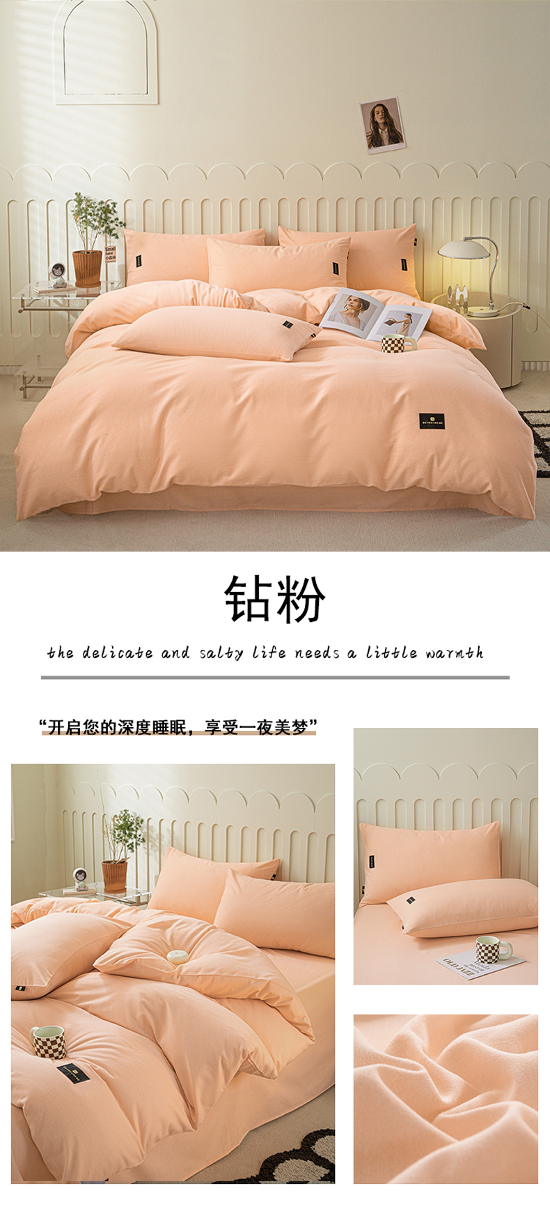 当前位置: 91家纺网 > 商品网购 > 床品套件 > 四件套 > 磨毛活性四件套 > 涵宸家纺 棉磨毛-纯色织标-四件套(含单品) 钻粉