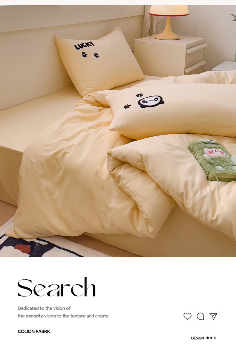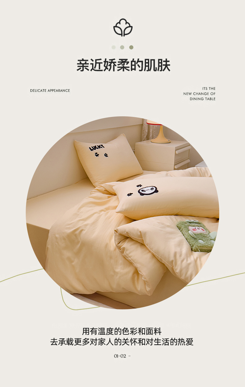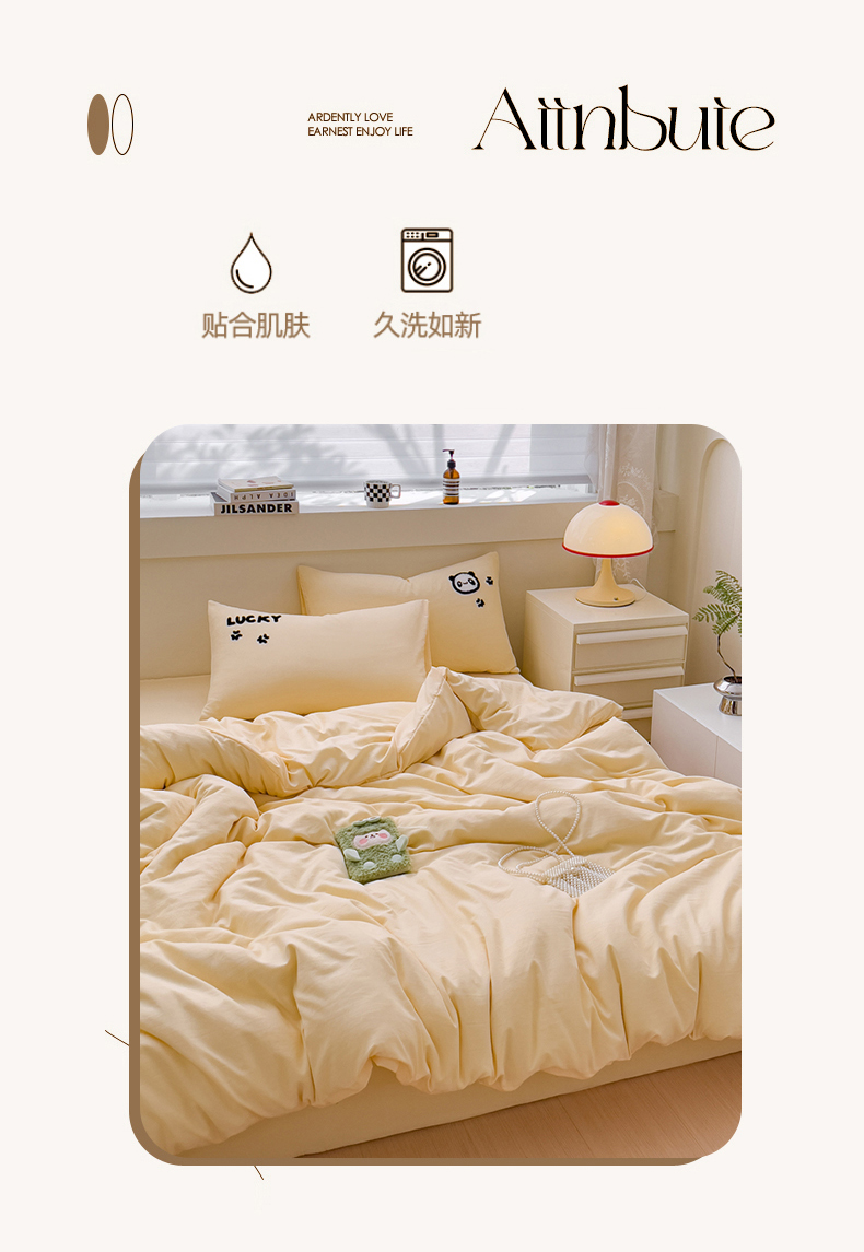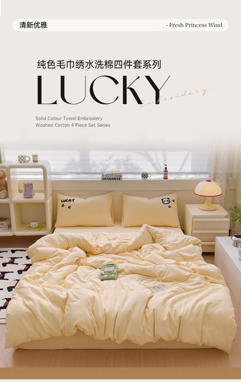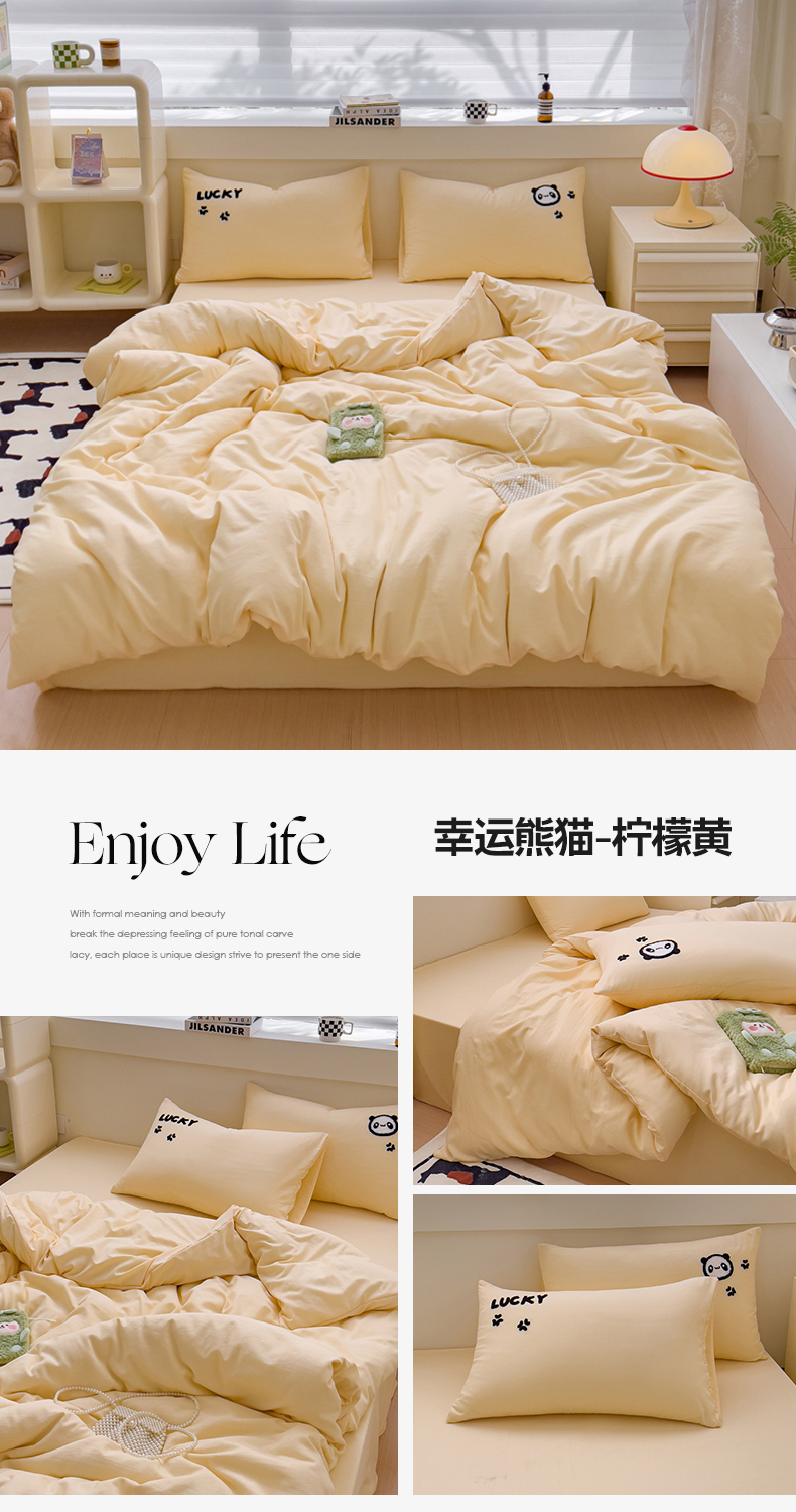梦嘉居 2024新款直播热款A类ins风多巴胺色超柔亲肤磨毛纯色水洗棉毛巾绣套件-单床笠 幸运熊猫-柠檬黄