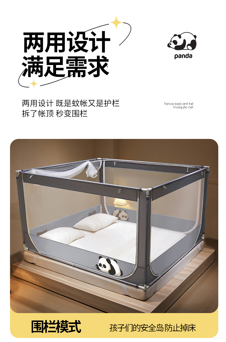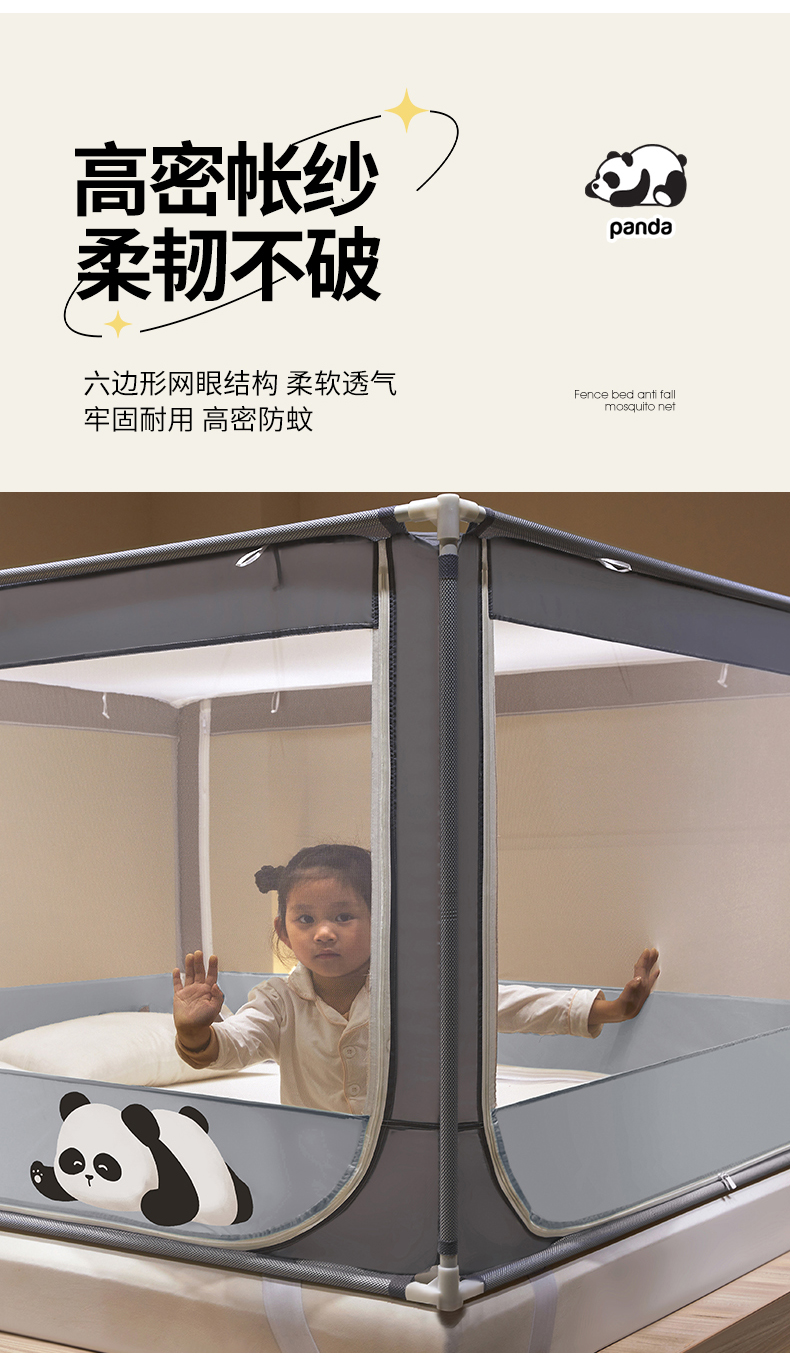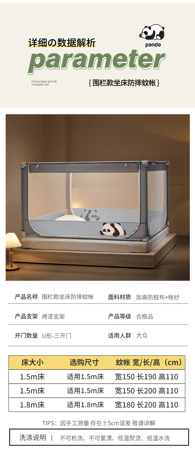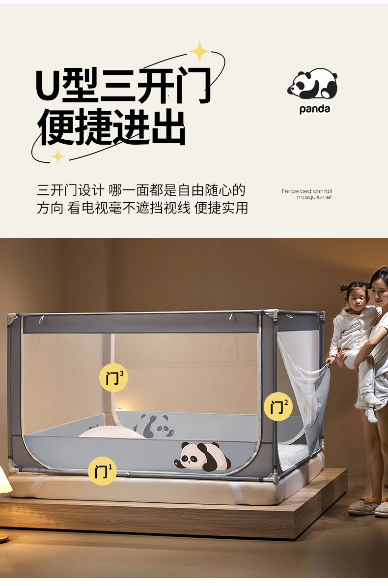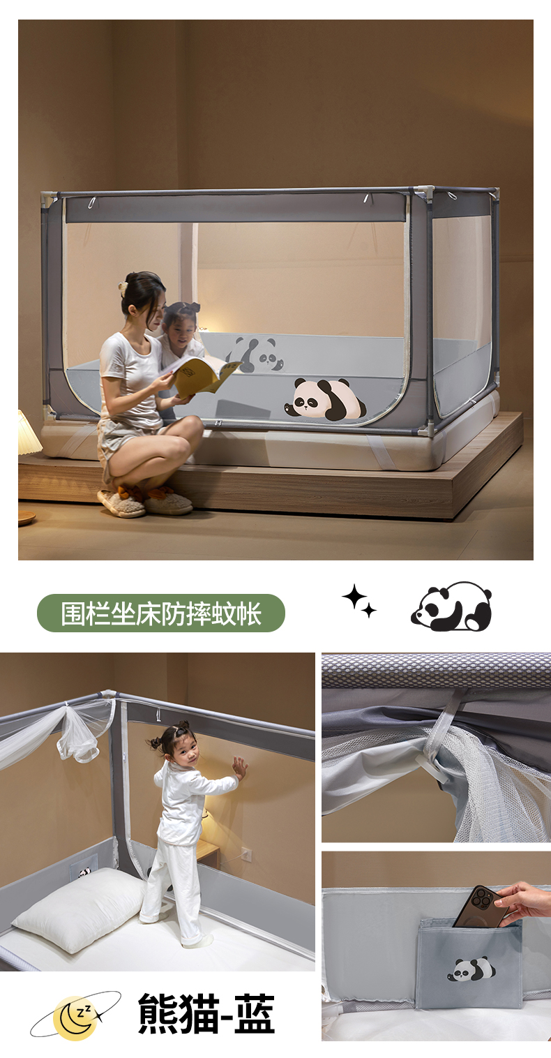 商品名称: 伊而梦蚊帐 2024新款围栏防摔U形三开门坐床蚊帐 围栏款-熊猫-蓝